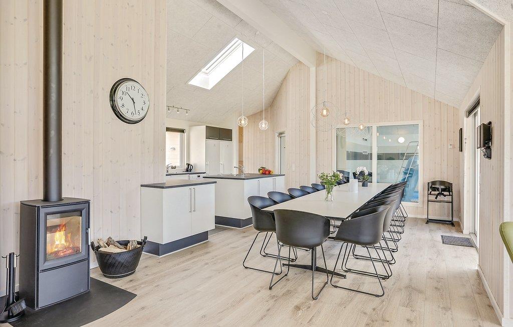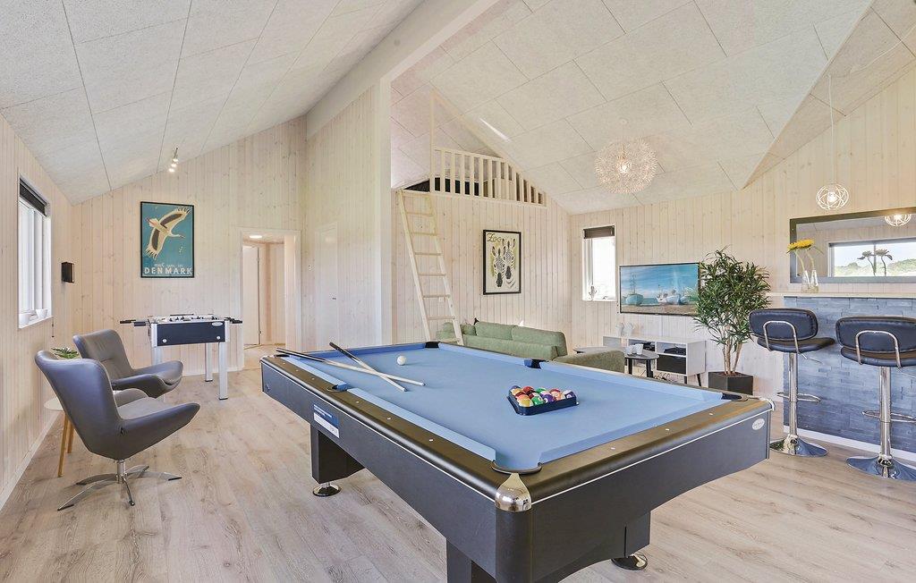Dette skønne sommerhus, til ikke mindre end 18 personer, er indrettet med syv gode soveværelser fordelt i to afsnit, samt fire sovepladser på hemsen, tre badeværelser, et stort veludstyret køkken og en lys stue, et aktivitetsrum med bl.a. billard, bordtennis, dart, Wii mm., samt en bar, hvorfra I kan servere de skønneste drinks. Derudover har huset et dejligt swimmingpoolområde med rutsjebane, fire personers spa og sauna. Huset ligger i en ny udstykning tæt på Hostrup strand, gå blot få minutters ned af vejen og vær nede ved den børnevenlige Limfjord. For enden af vejen er der indrettet fælles legeplads, som børnene kan gå ned til uden de skal ud på en trafikeret vej og få kilometer fra huset er en naturlegeplads. Sommerhusområdet er dejligt roligt og omgivet af natur, men ligger ikke langt fra Skive og Holstebro, med stort udvalg af butikker, restauranter og cafeer.