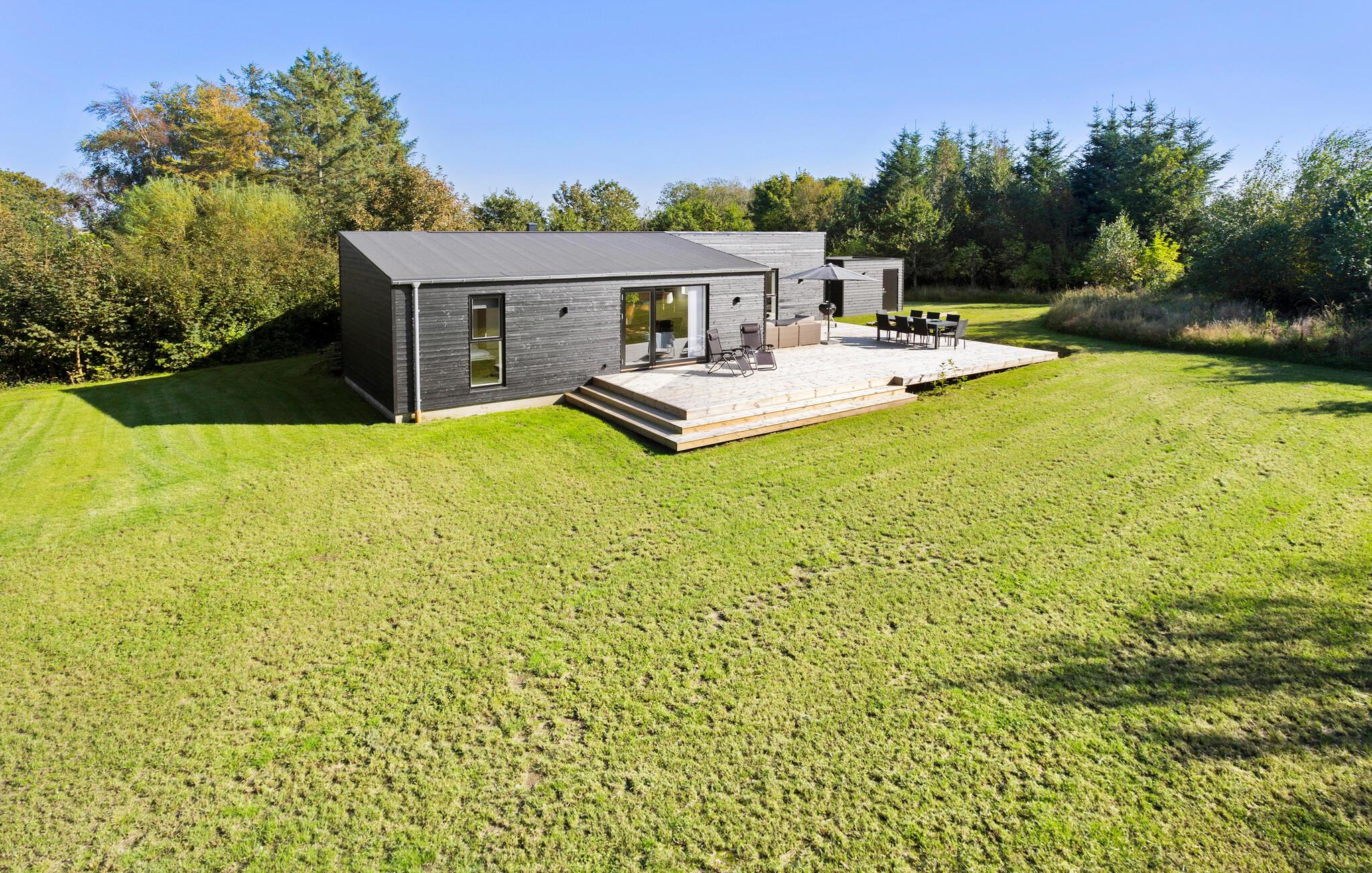 Moderne og rummeligt træhus nær fjord og strand med stor terrasse til afslapning og familiehygge.