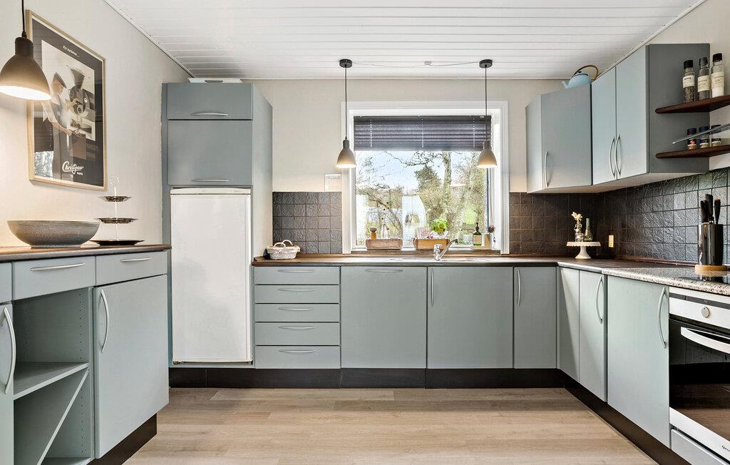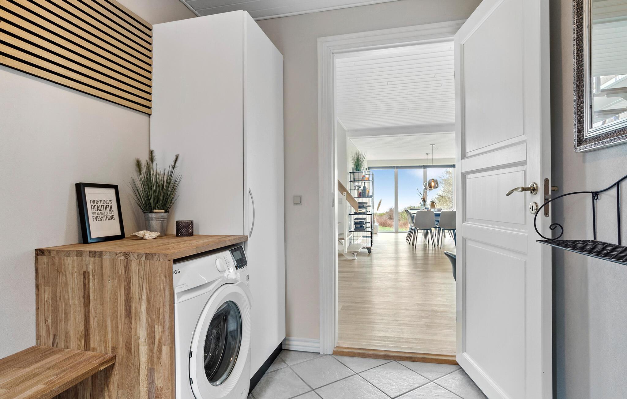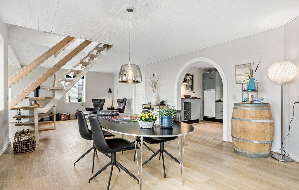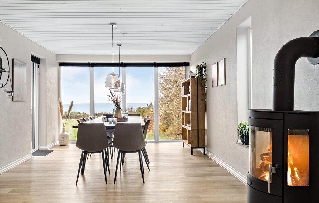 Velkommen til dette flotte feriehus, der ligger få skridt fra Limfjorden, og hvor I får masser af plads og komfort til en ferie med den store familie. Huset er fordelt over to etager og er flot og moderne indrettet med sans for detaljen og i gode materialer. Nyd godt af de gode indretningsløsninger og nyd fjordudsigten gennem de store vinduespartier, mens I laver mad eller læser en bog i lænestolen. På de køligere dage kan I gøre det ekstra hyggeligt og tænde op i brændeovnen, der giver varme og stemning til hyggelige aftener med brætspil eller en spændende film efter aftensmaden.