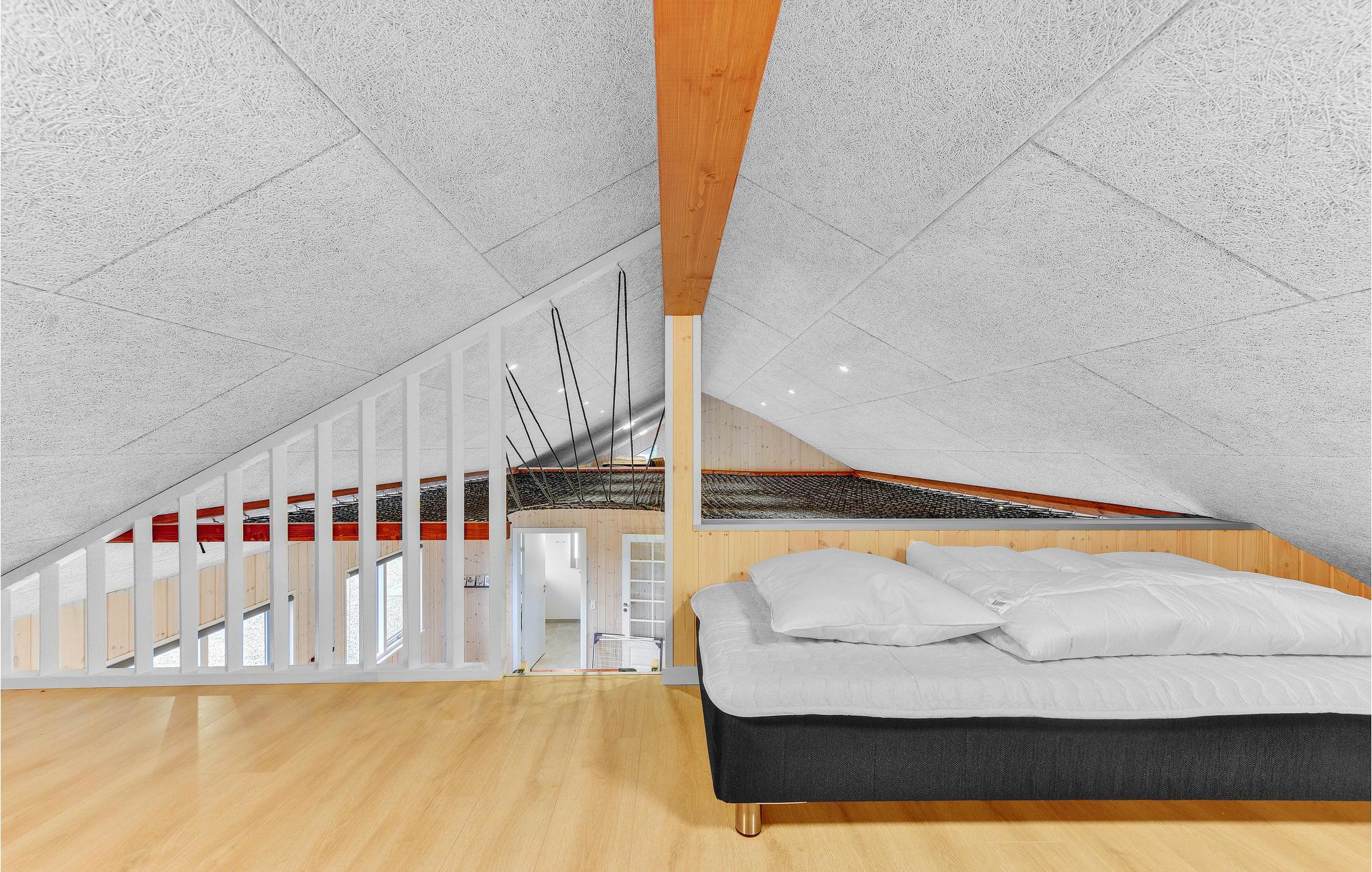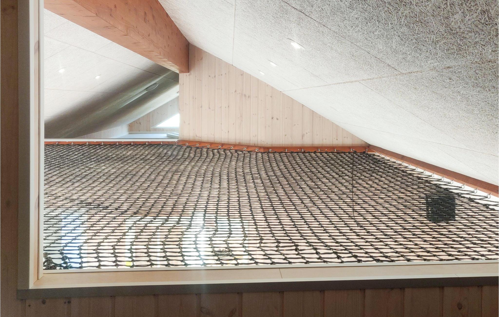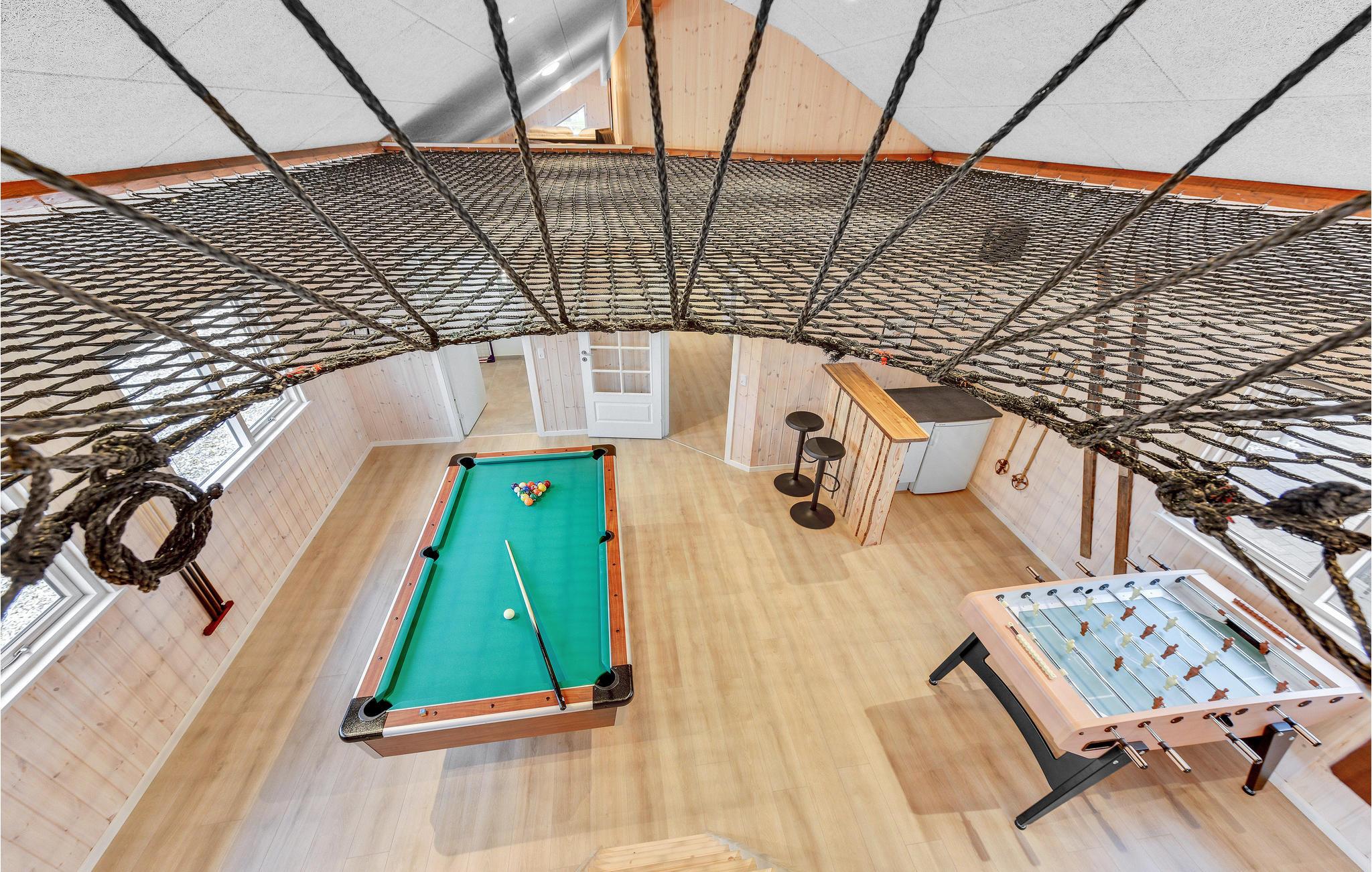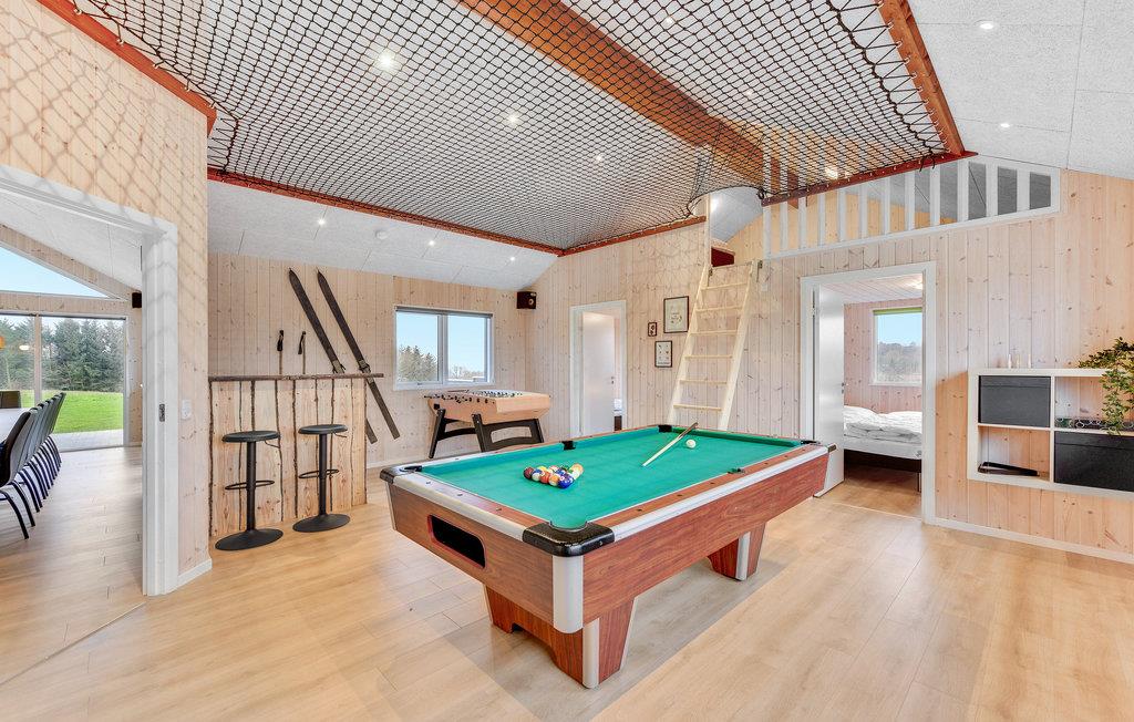 Lækkert feriehus med masser af aktiviteter - f.eks. indendørs spabad, sauna, aktivitetsrum med pool, billiard og bordtennis. Som noget specielt har huset et stort legenet, der er spændt op under loftet, som børn og barnelige sjæle kan boltre sig i og kravle over fra hems til hems. Det ene værelse er indrettet med et klap-op-bord, der kan fungere som skrivebord, hvis I skulle få brug for en hjemmearbejdsplads under opholdet.