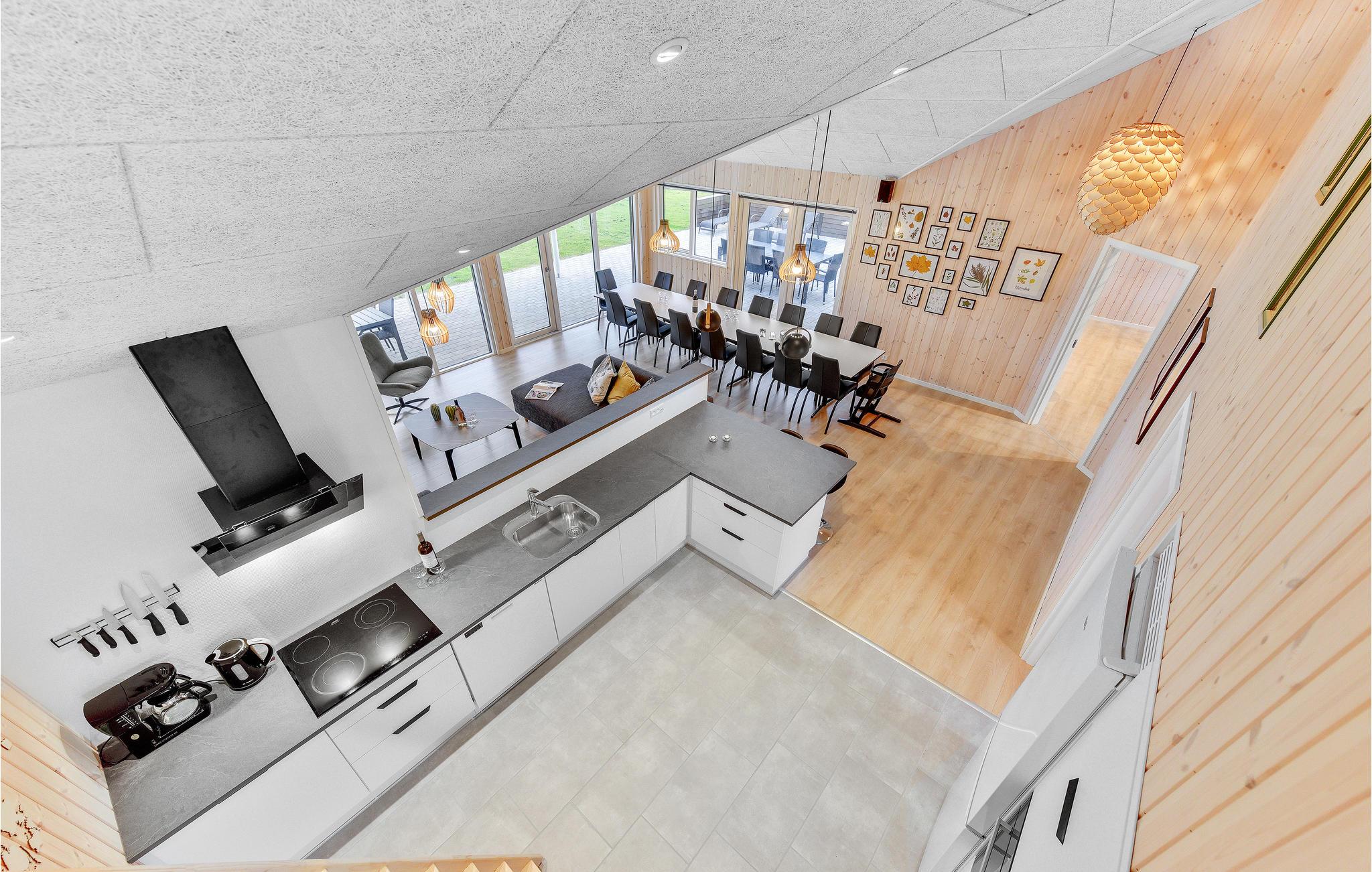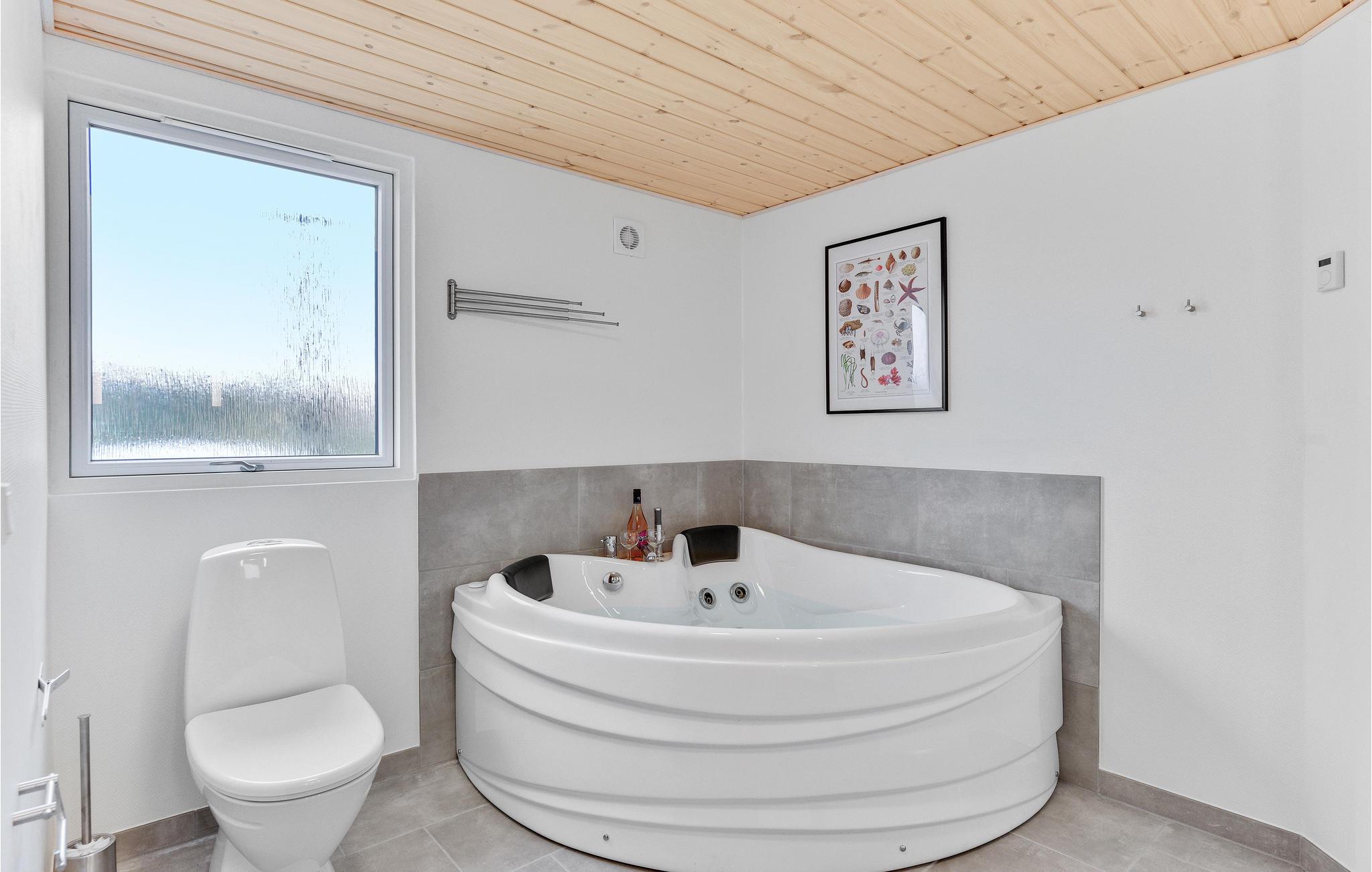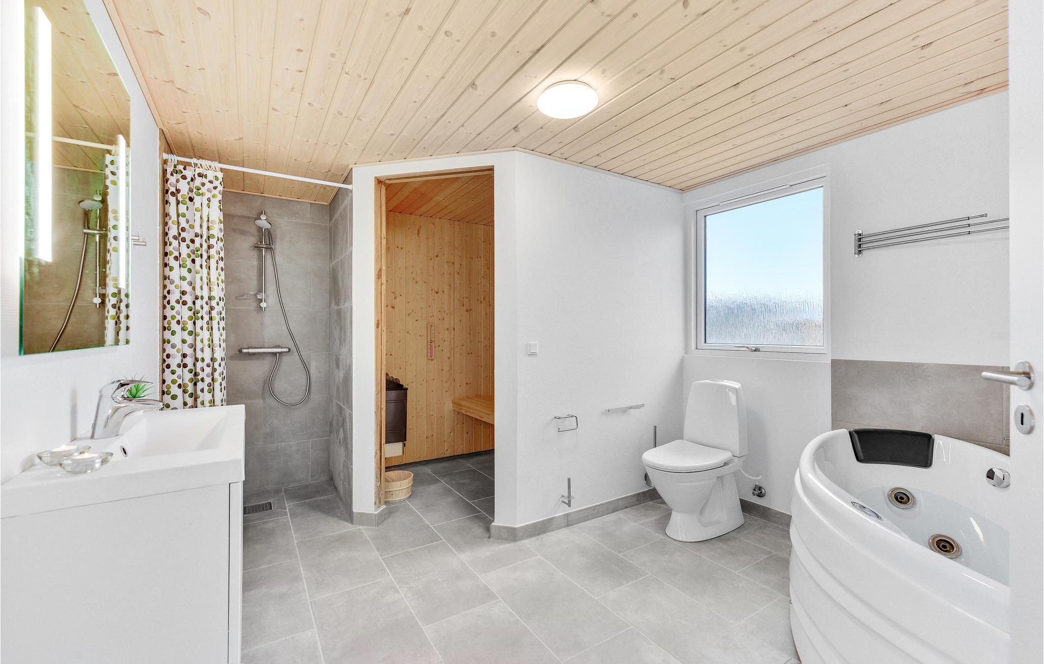 Lækkert feriehus med masser af aktiviteter - f.eks. indendørs spabad, sauna, aktivitetsrum med pool, billiard og bordtennis. Som noget specielt har huset et stort legenet, der er spændt op under loftet, som børn og barnelige sjæle kan boltre sig i og kravle over fra hems til hems. Det ene værelse er indrettet med et klap-op-bord, der kan fungere som skrivebord, hvis I skulle få brug for en hjemmearbejdsplads under opholdet.