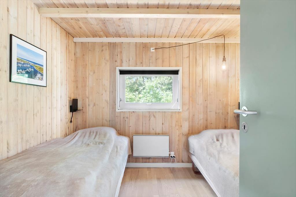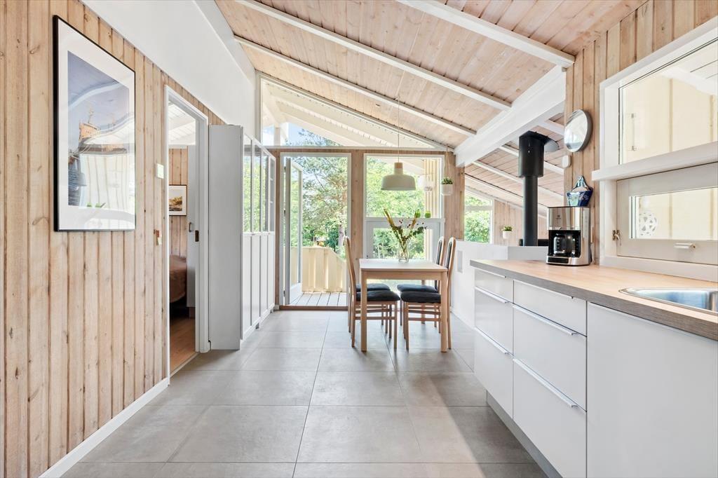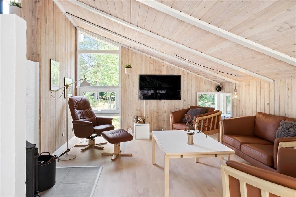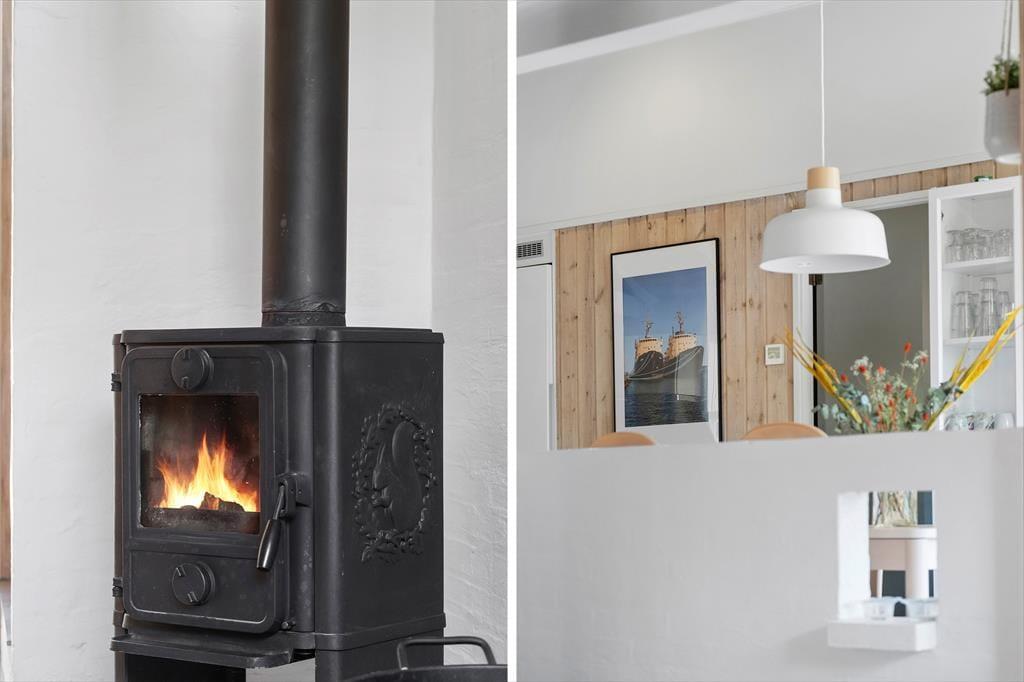 Hvis I er til overdådig luksus, er dette måske ikke det rette sted for jer. Til gengæld er det lige sagen, hvis en brændeovn, en dejlig solterrasse og en hems hører til de ting, I drømmer om. Huset besidder nemlig hele molevitten – og så er det endda fuld af vaskeægte sommerhusatmosfære med sine træbeklædte vægge, skrålofter og lyse indretning. Stueplan er i to niveauer, og fra køkken-alrummet skal I derfor et par trin ned, før I står i stueafdelingen, hvor brændeovnen, fjernsynet og sofaafdelingen er placeret. Den åbne planløsning forbinder desuden køkken-alrummet med hemsen, så hvis børnene er kravlet op for at bygge hule, kan de stadig følge med i madlavningen og andre indendørs ferieaktiviteter. Planløsningen består endelig også af et badeværelse og tre soveværelser -et med dobbeltseng og to værelser med to enkeltsenge.