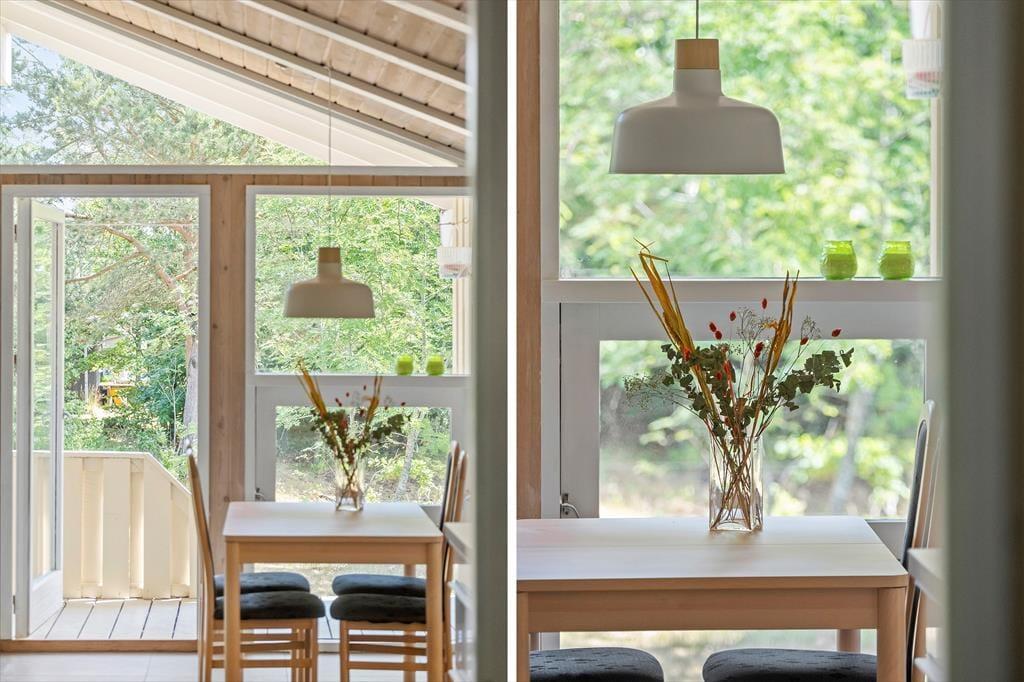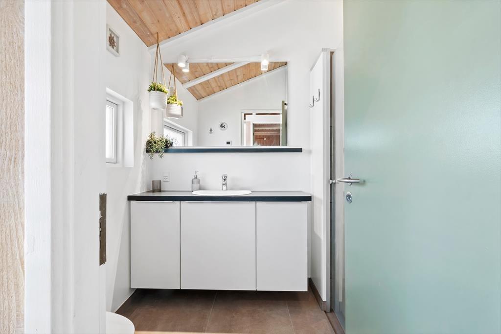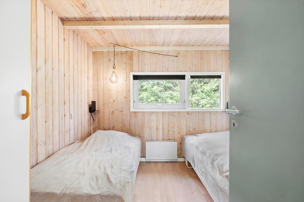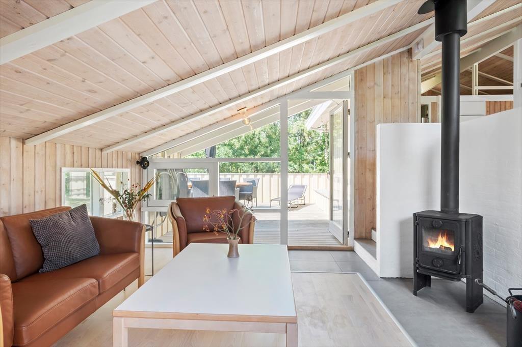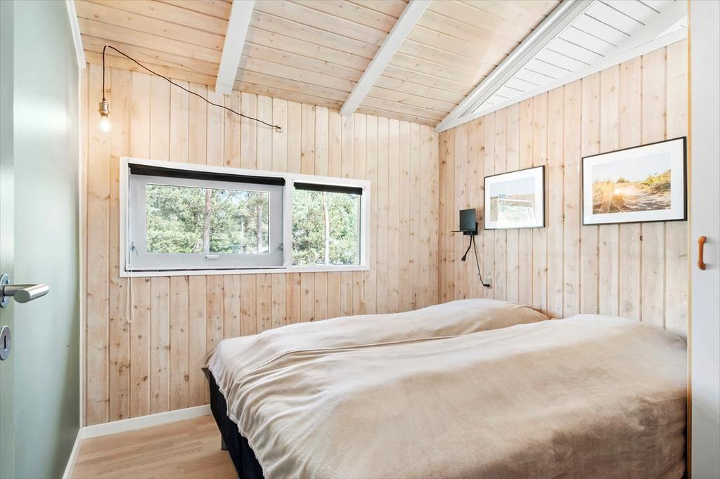 Hvis I er til overdådig luksus, er dette måske ikke det rette sted for jer. Til gengæld er det lige sagen, hvis en brændeovn, en dejlig solterrasse og en hems hører til de ting, I drømmer om. Huset besidder nemlig hele molevitten – og så er det endda fuld af vaskeægte sommerhusatmosfære med sine træbeklædte vægge, skrålofter og lyse indretning. Stueplan er i to niveauer, og fra køkken-alrummet skal I derfor et par trin ned, før I står i stueafdelingen, hvor brændeovnen, fjernsynet og sofaafdelingen er placeret. Den åbne planløsning forbinder desuden køkken-alrummet med hemsen, så hvis børnene er kravlet op for at bygge hule, kan de stadig følge med i madlavningen og andre indendørs ferieaktiviteter. Planløsningen består endelig også af et badeværelse og tre soveværelser -et med dobbeltseng og to værelser med to enkeltsenge.