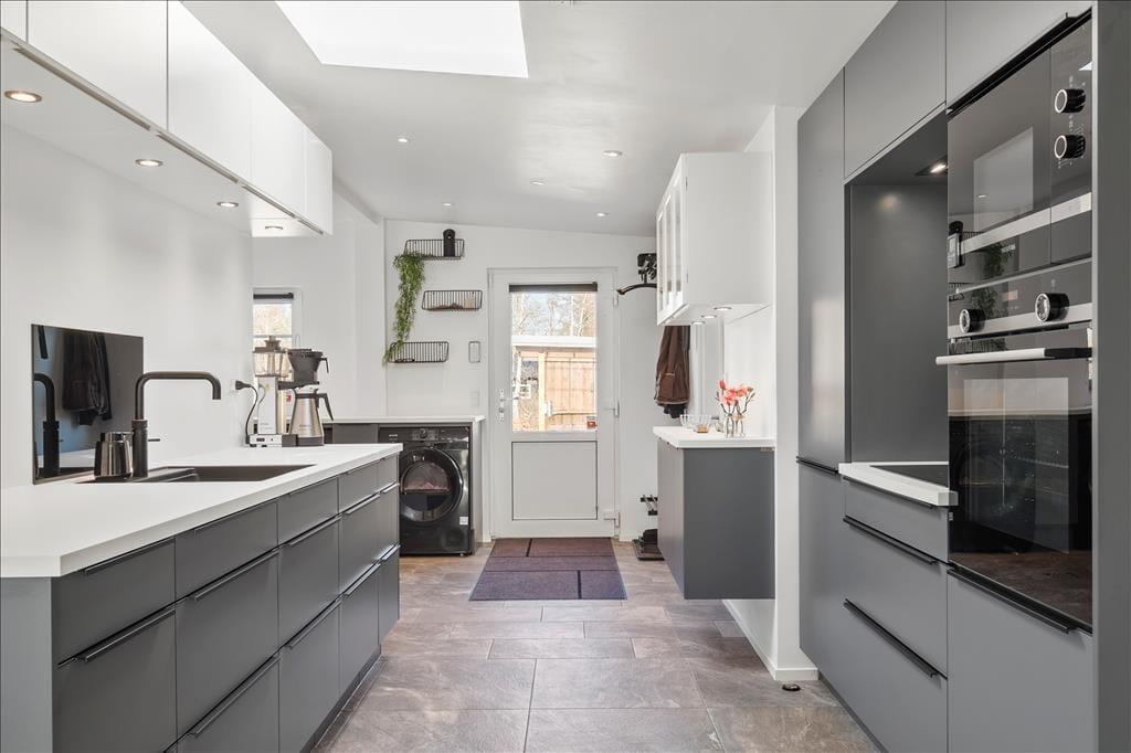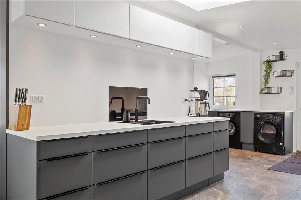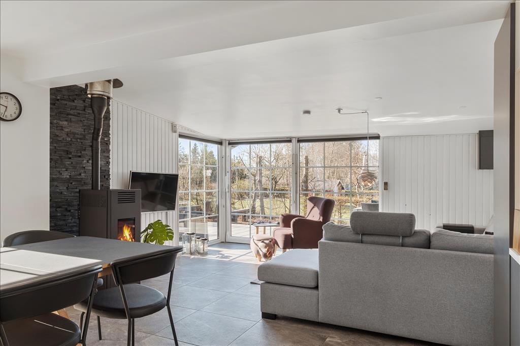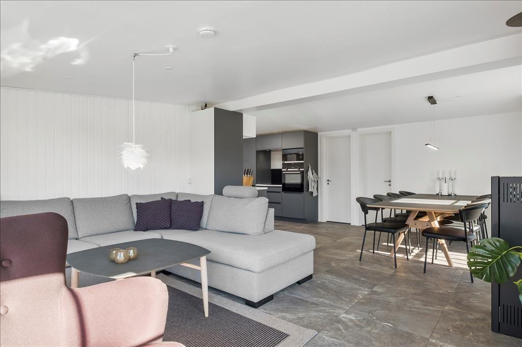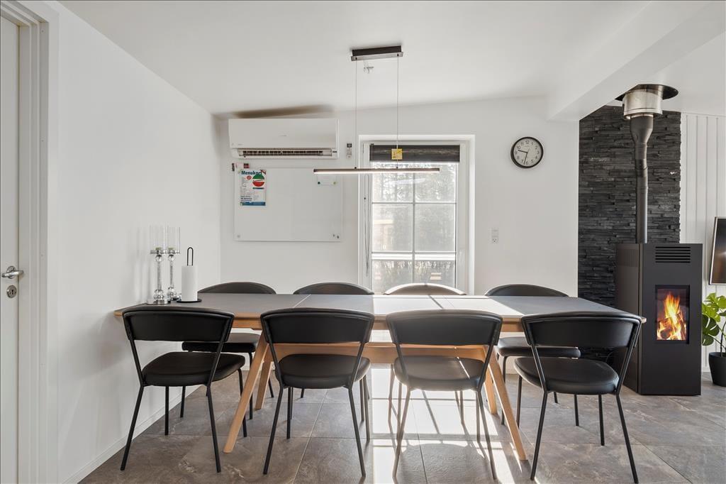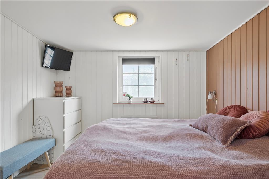 Et stort og lækkert køkken, flotte gulve og komfortabelt møblement er noget af det, der gør det til en særdeles dejlig oplevelse at tilbringe tiden i sommerhusets opholdsrum. Derudover inviterer store vinduespartier dagslyset indenfor på skønneste vis, og mellem sofaafdelingen og spisebordet står en brændeovn klar til eventuelle kølige dage, hvor I har brug for lidt ekstra varme. Fra stuen er der direkte adgang til det førnævnte køkken, og herfra kan I fortsætte videre til den rummelige og funktionelle entré, som er udstyret med vaskemaskine og tørretumbler. To flotte badeværelser hører også med til planløsningen foruden fire gode soveværelser med i alt otte sengepladser. Alle soveværelser er udstyret med TV – og der er også en stor fladskærm i stuen, hvis I vil hygge jer sammen med film og popcorn.