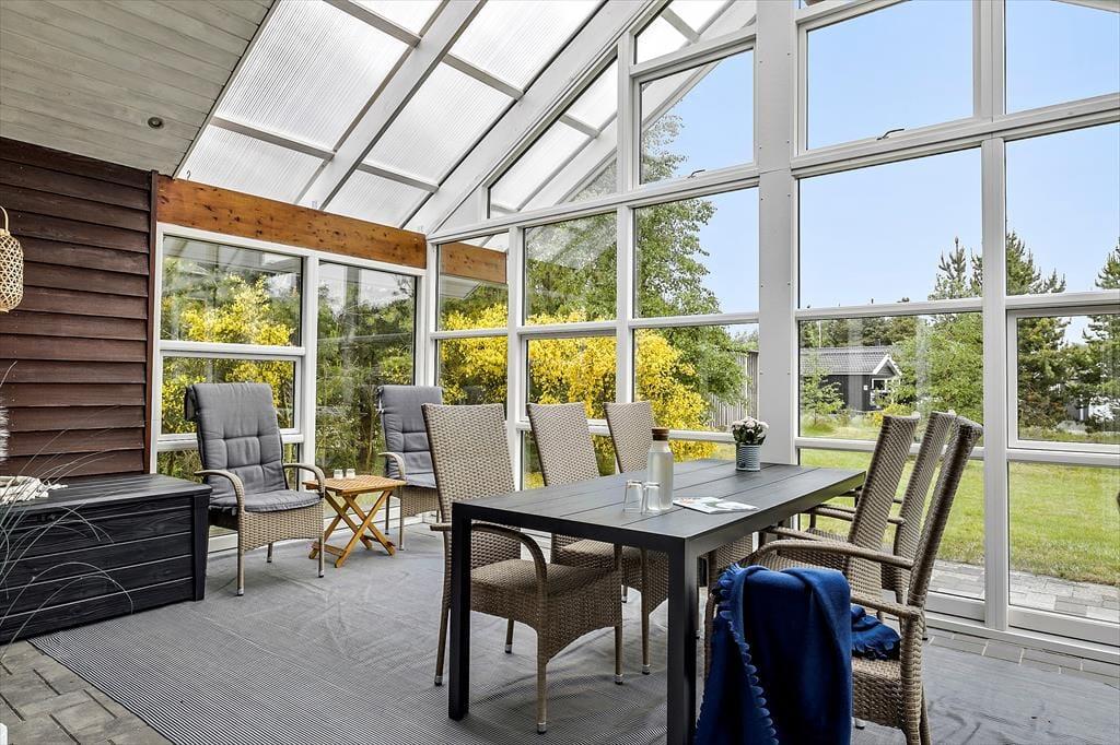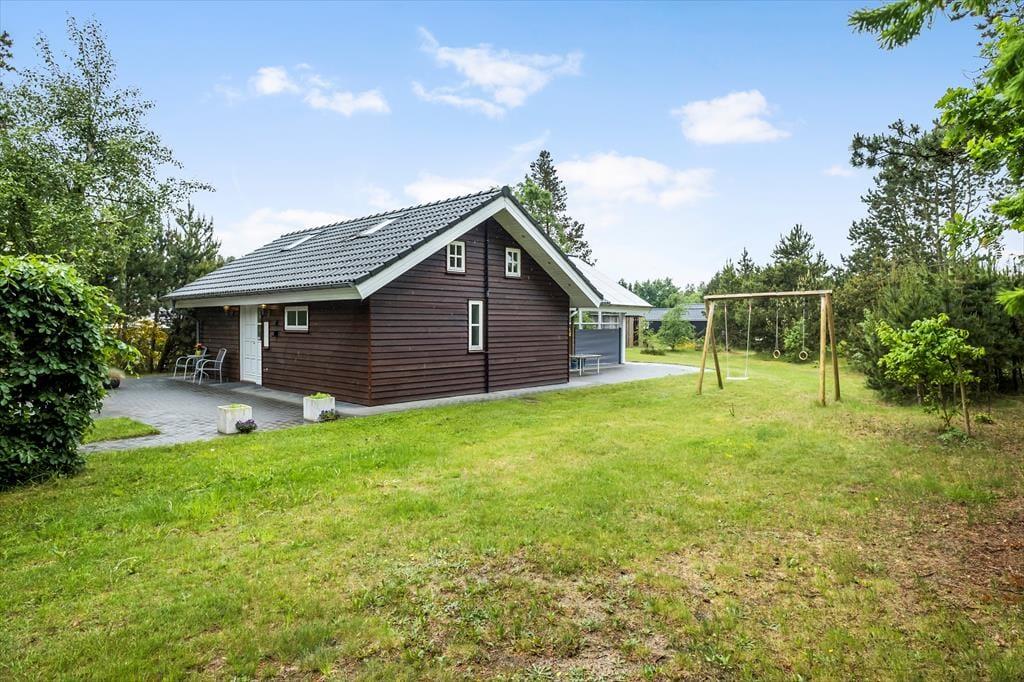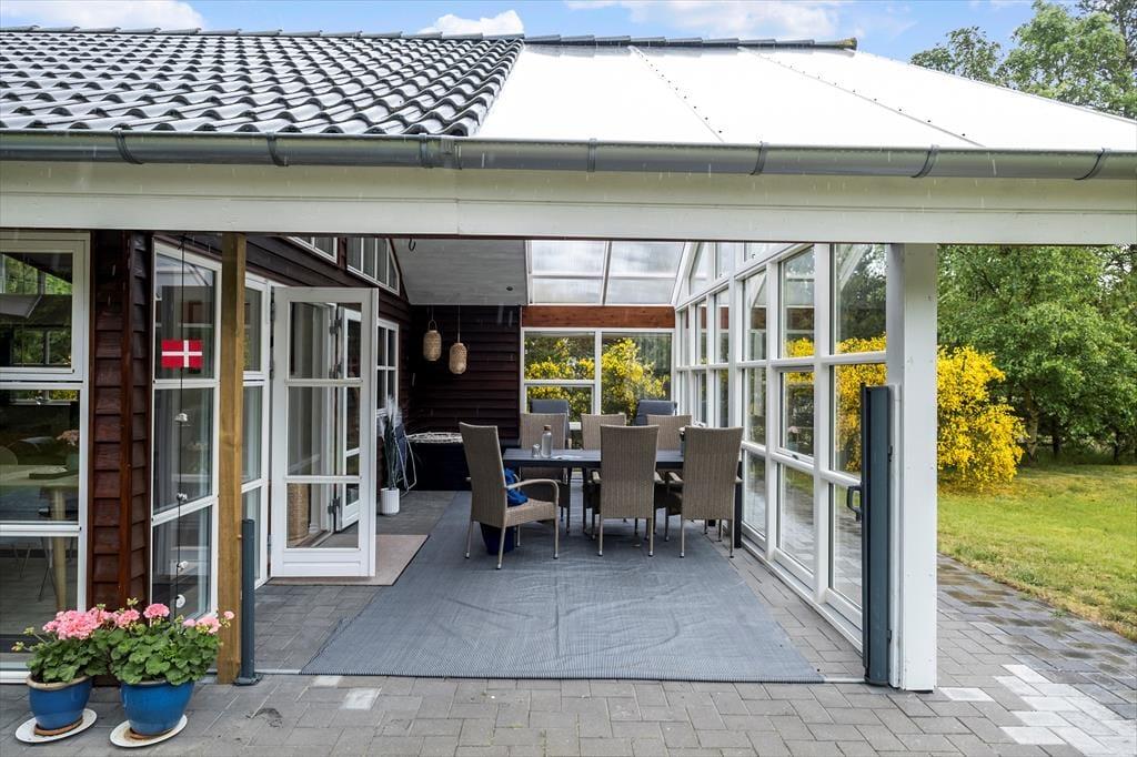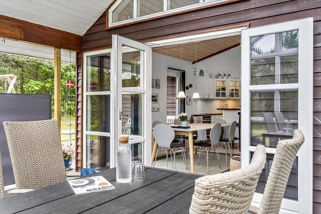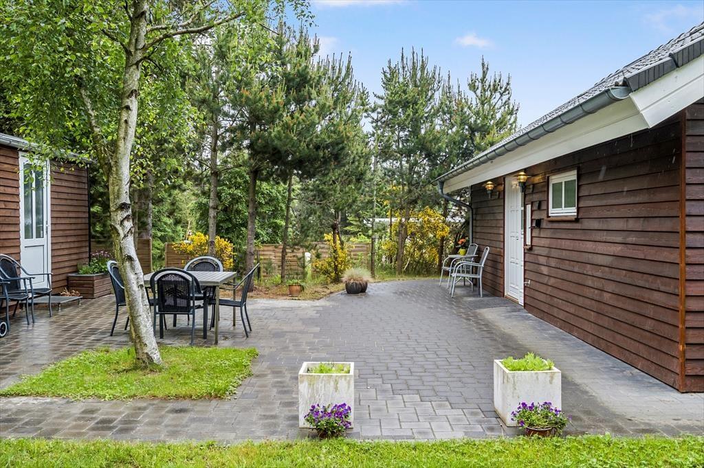Lægger vejret op til udendørs afslapning, kan I åbne stuens havedøre op på vid gab og træde direkte ud på terrassen. Flisebelægningen breder sig hele vejen rundt om sommerhuset, så der er flere solbeskinnede opholdspladser og hyggekroge at vælge imellem, inklusiv et overdækket terrasseareal mod syd. På den 1337 m2 store grund er der desuden god plads til at lege og spille bold på græsplænen.