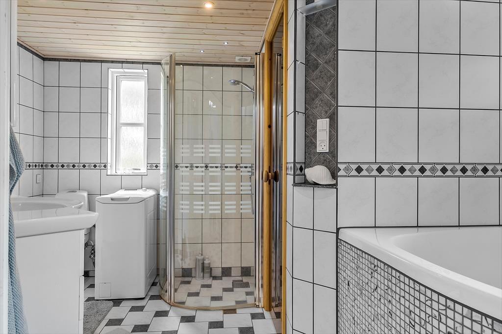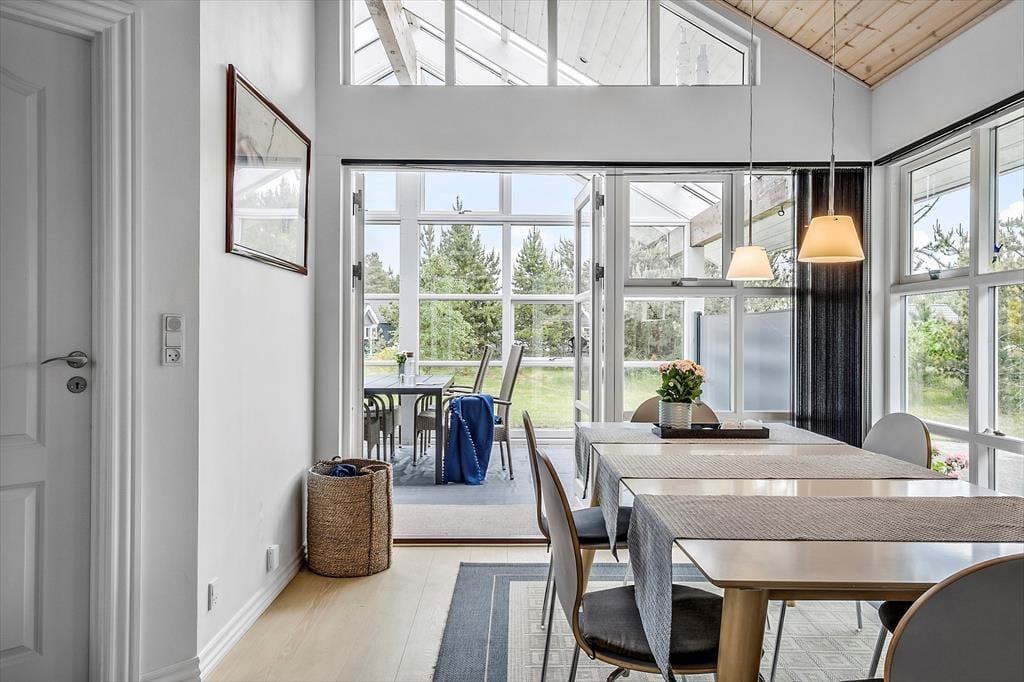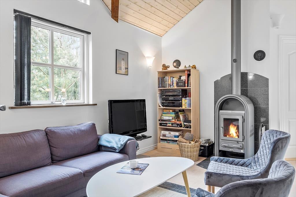 Dagslyset strømmer indenfor i stuen, som er udstyret med vinduer vendt mod tre verdenshjørner – inklusiv store trekantende vinduespartier øverst i gavlene. Det skaber en lys og indbydende atmosfære, som understreges af stuens enkle indretning med diskrete farvetoner og smagfuldt møbeldesign. I det ene hjørne af opholdsstuen er der god plads til at kræse om maden i den veludstyrede køkkenafdeling, hvor I også kan slå jer ned for at hyggesnakke på de høje barstole ved disken. Brændeovnen kan I tænde op i, når det er køligt udenfor, og hvis I virkelig trænger til at få varmen på en kold efterårsdag, er det herligt med et spabad og en saunatur på det lækre badeværelse. Når det er sengetid, kan I gå til ro på sommerhusets tre soveværelser, hvoraf to er indrettet med dobbeltseng og et med en dobbelt sovesofa.