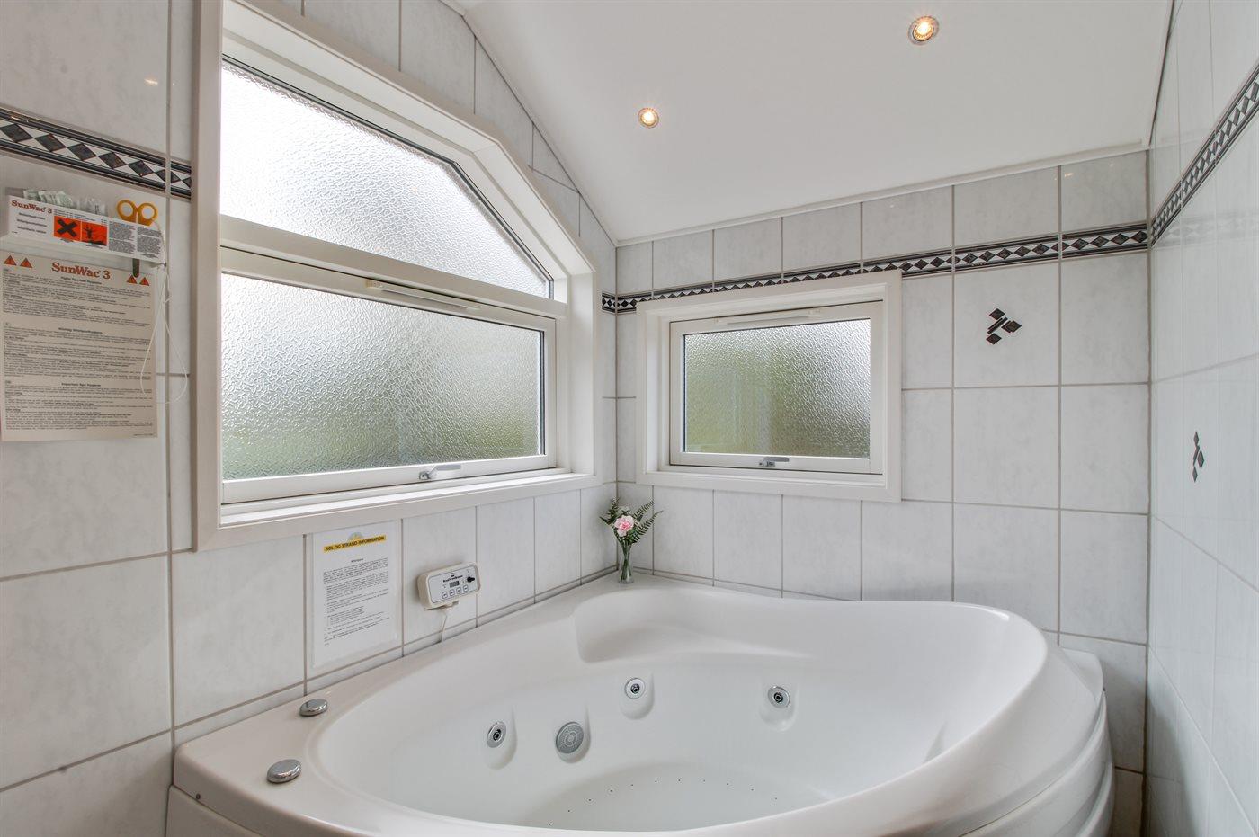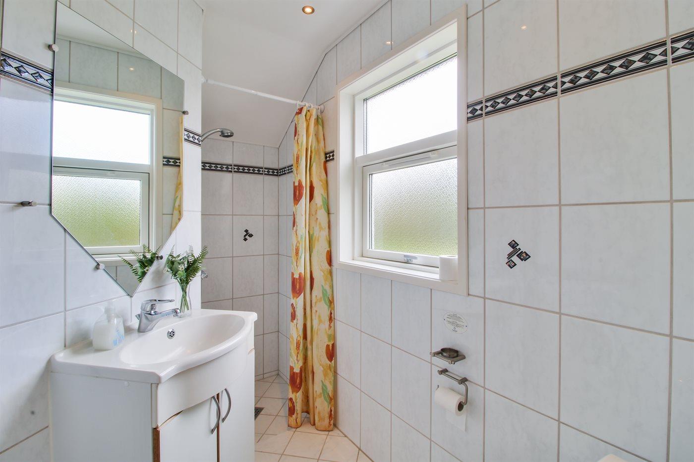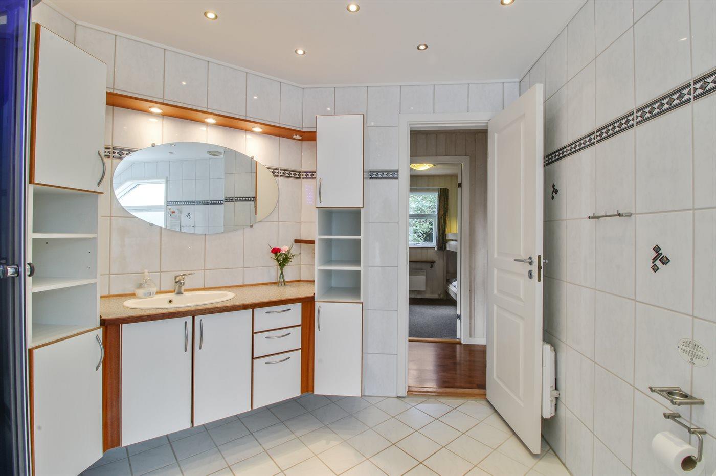 Der er 2 badeværelser med bruseniche og 2 toiletter. Der er gulvvarme på 2 badeværelser. I saunaen er der mulighed for afslapning.
