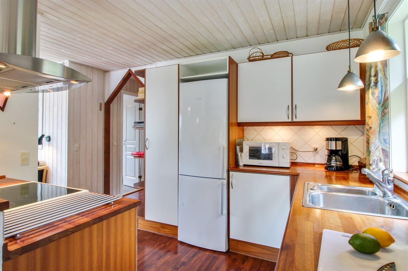 Køkkenet er udstyret med 1 køleskab. Der er 4 keramiske kogeplader, varmluftovn, mikrobølgeovn samt opvaskemaskine.