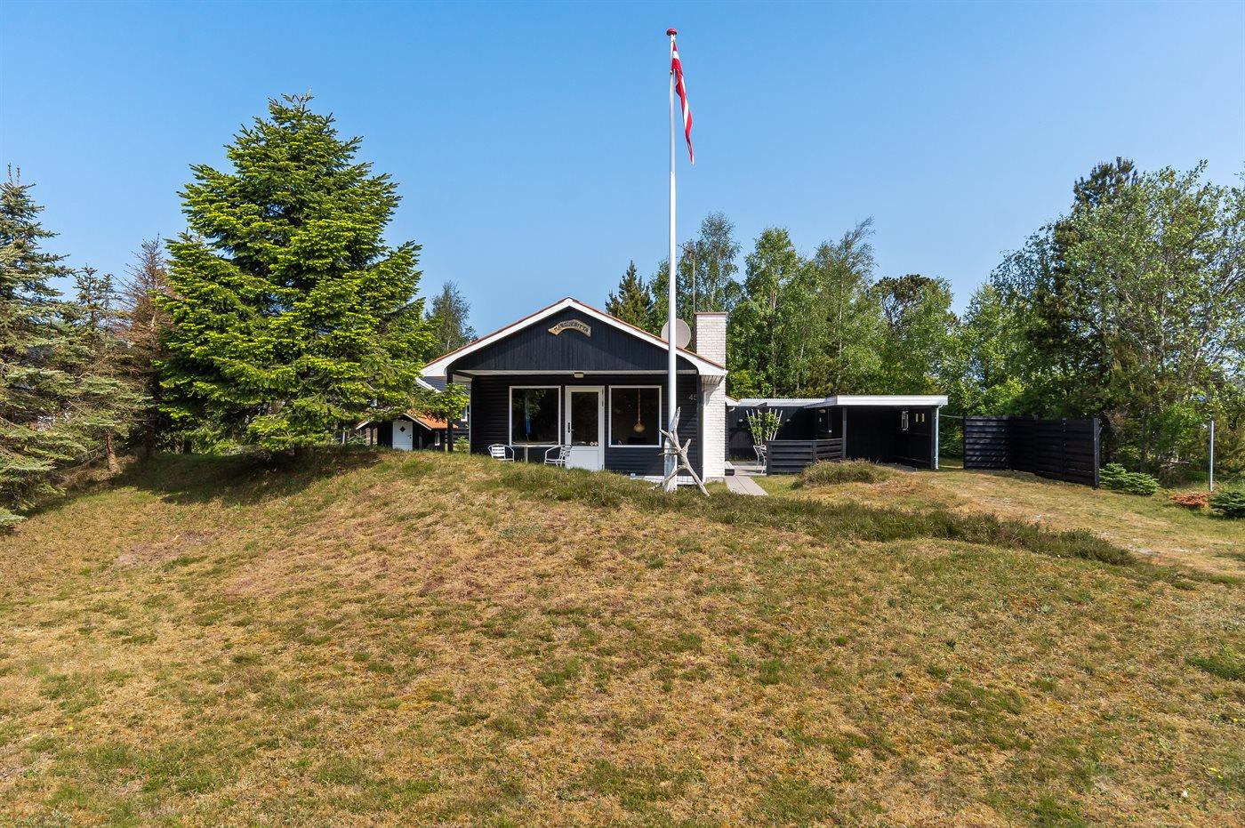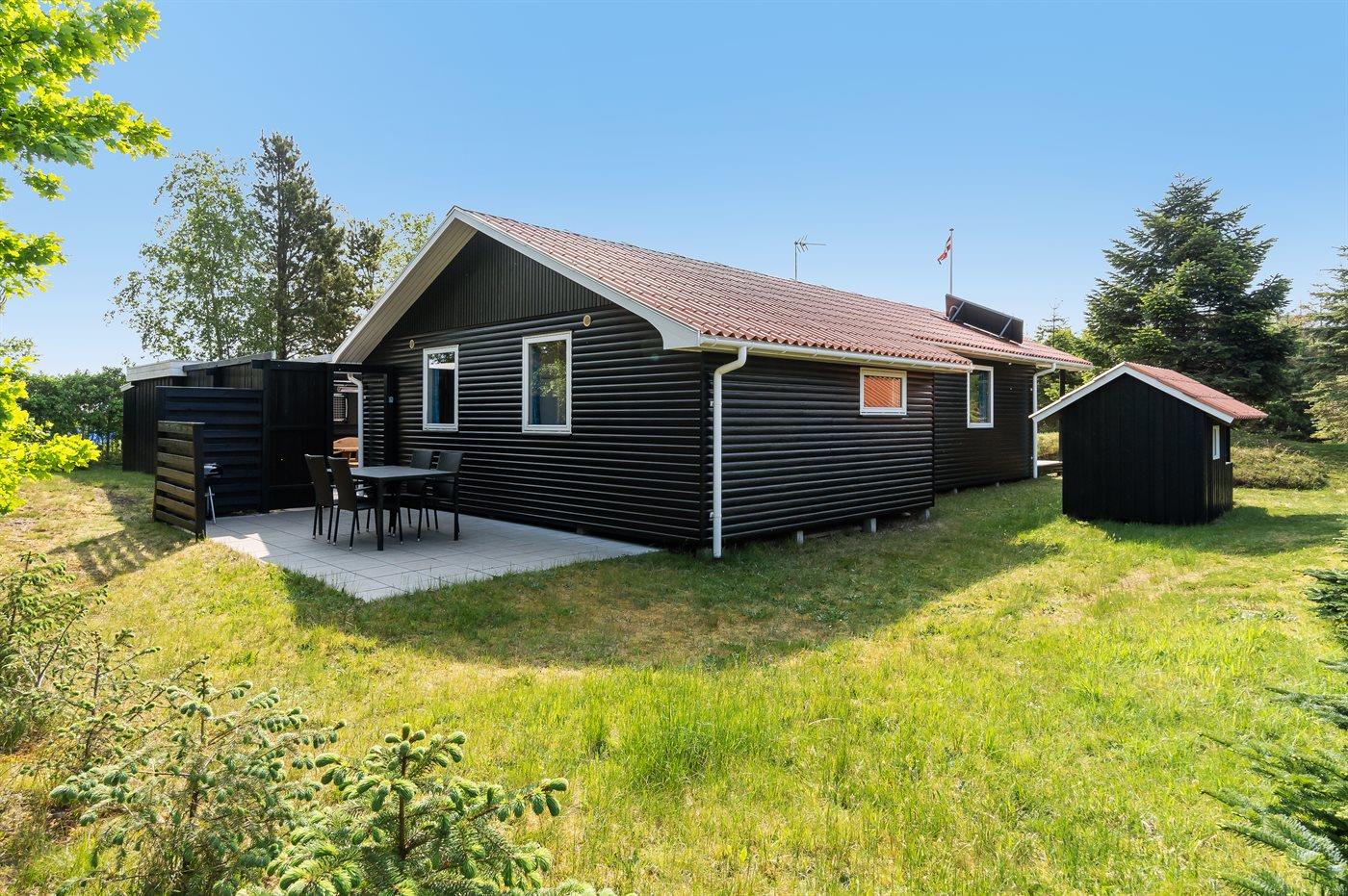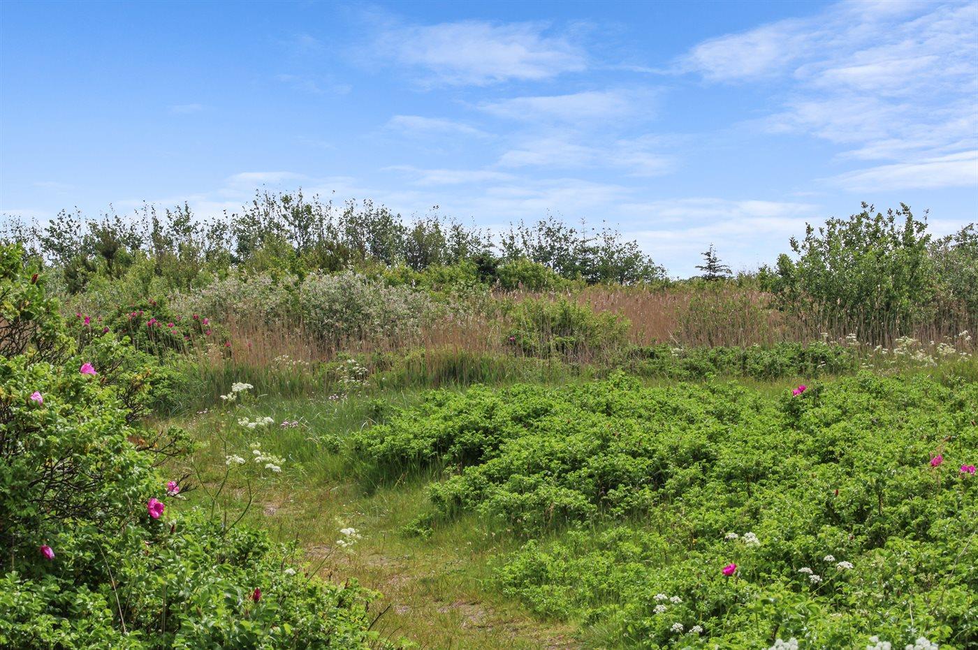 Ferieboligen er beliggende på en 1050 m² stor naturgrund. Der er 300 m til havet. Nærmeste forretning er beliggende i en afstand af 300 m. Til ferieboligen hører 45 m² terrasseareal. Desuden er der 25 m² overdækket terrasse. Der er redskabsrum. Grill til rådighed. Der er carport til rådighed. Parkering ved ferieboligen.