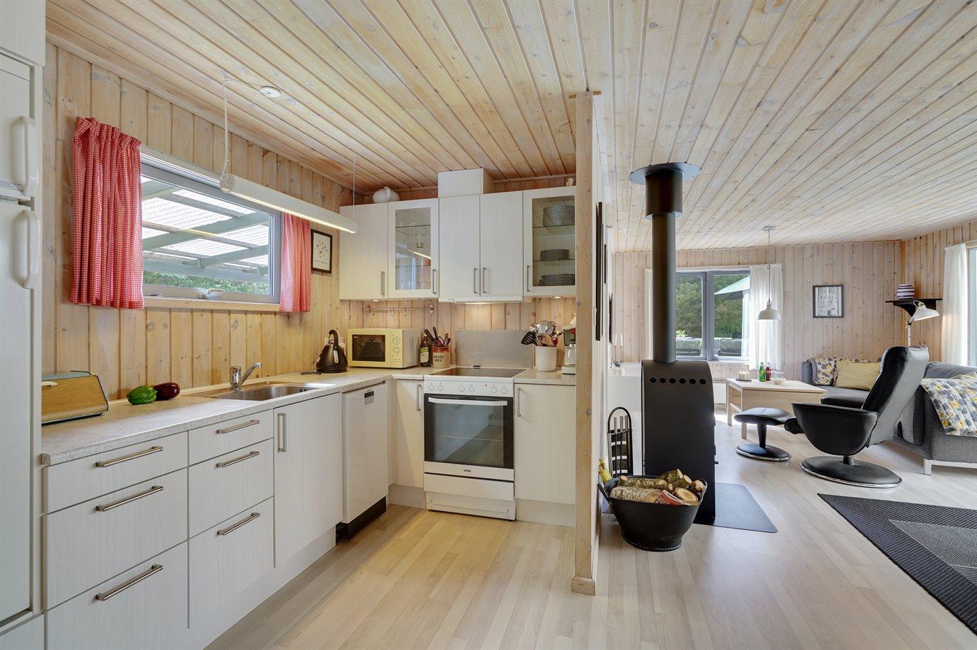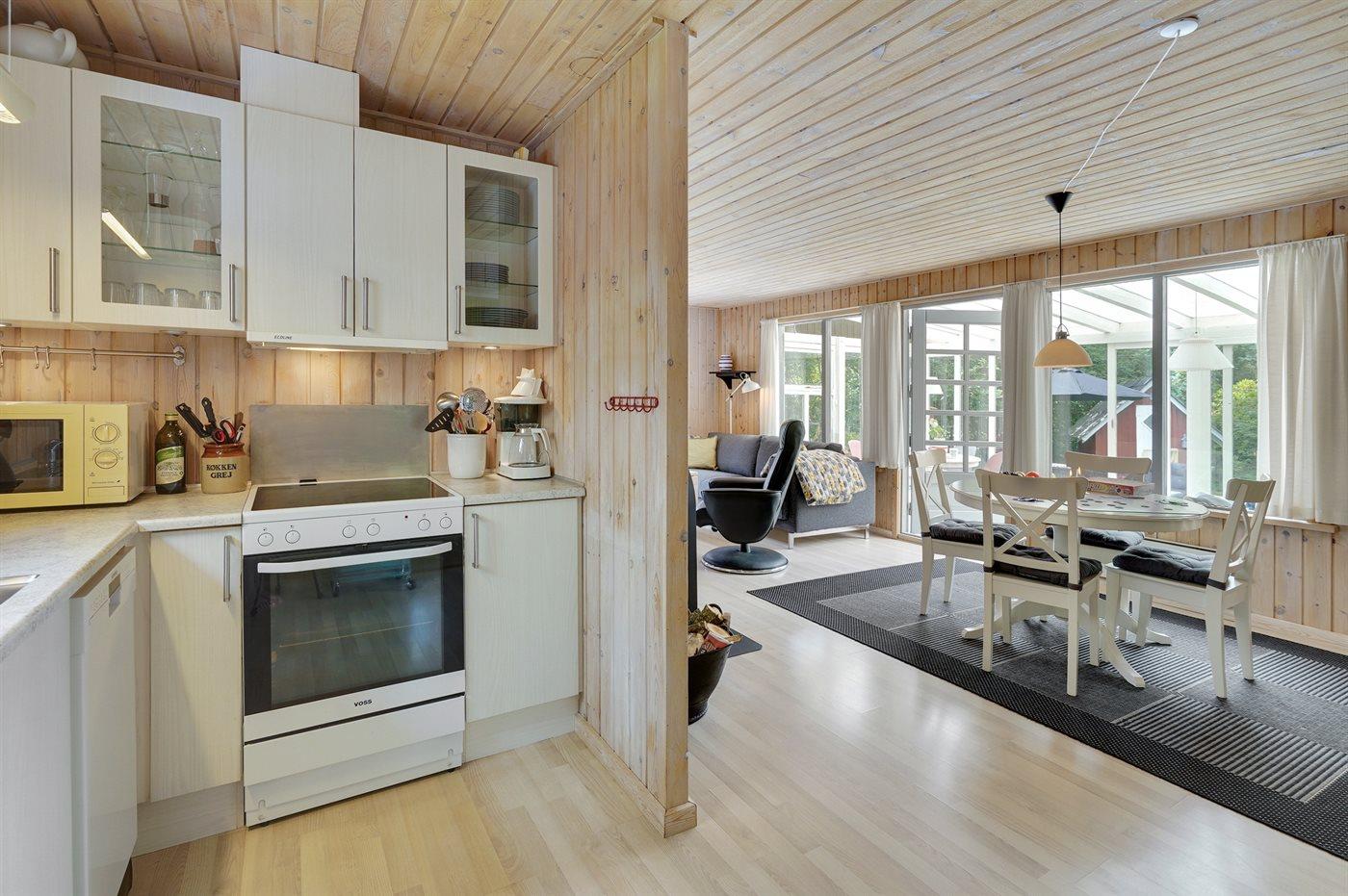 Køkkenet er udstyret med 1 køleskab. Der er 4 induktionskogeplader, varmluftovn, mikrobølgeovn samt opvaskemaskine.