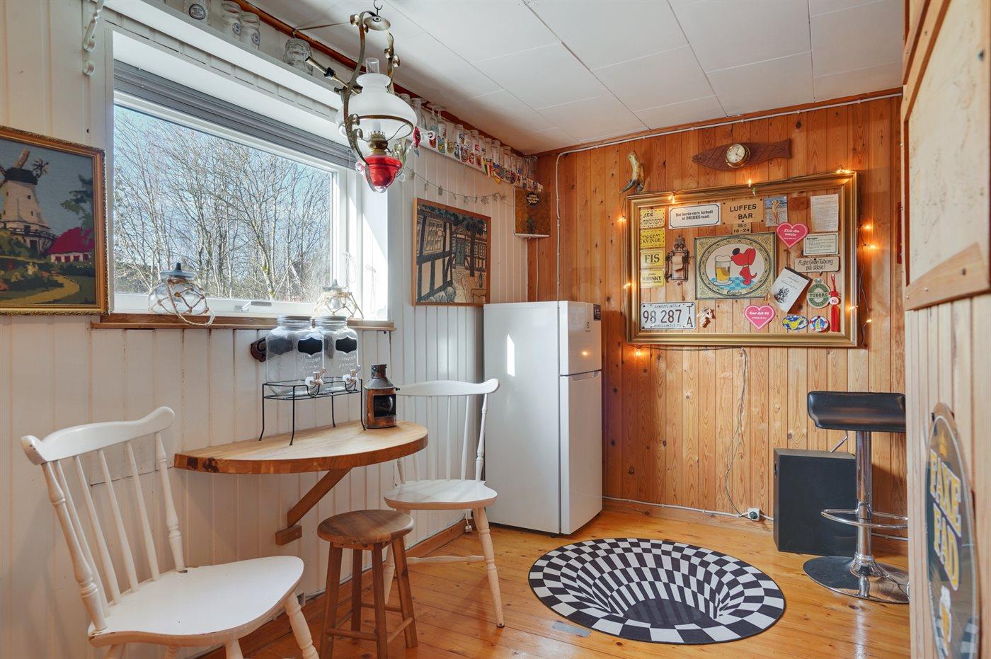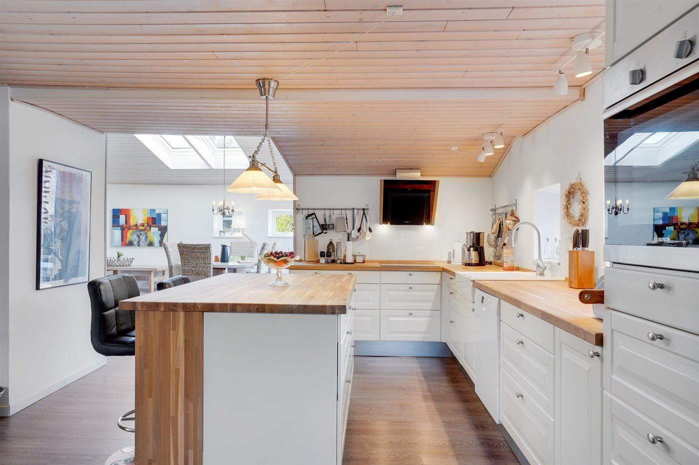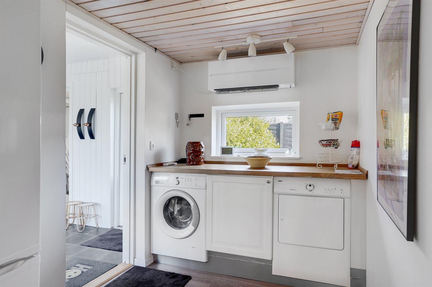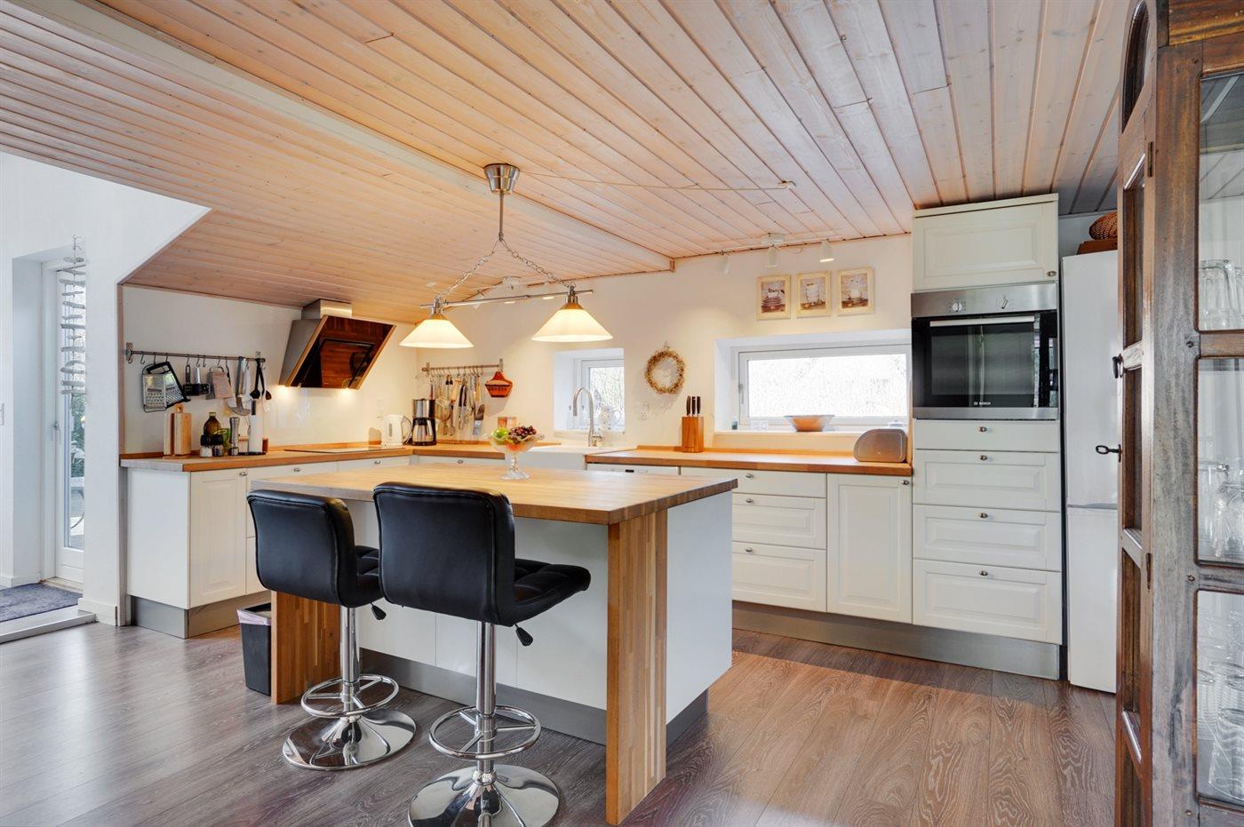 Køkkenet er udstyret med 1 køleskab. Der står 1 ekstra køleskab til rådighed. Der er 4 keramiske kogeplader, varmluftovn, mikrobølgeovn samt opvaskemaskine.