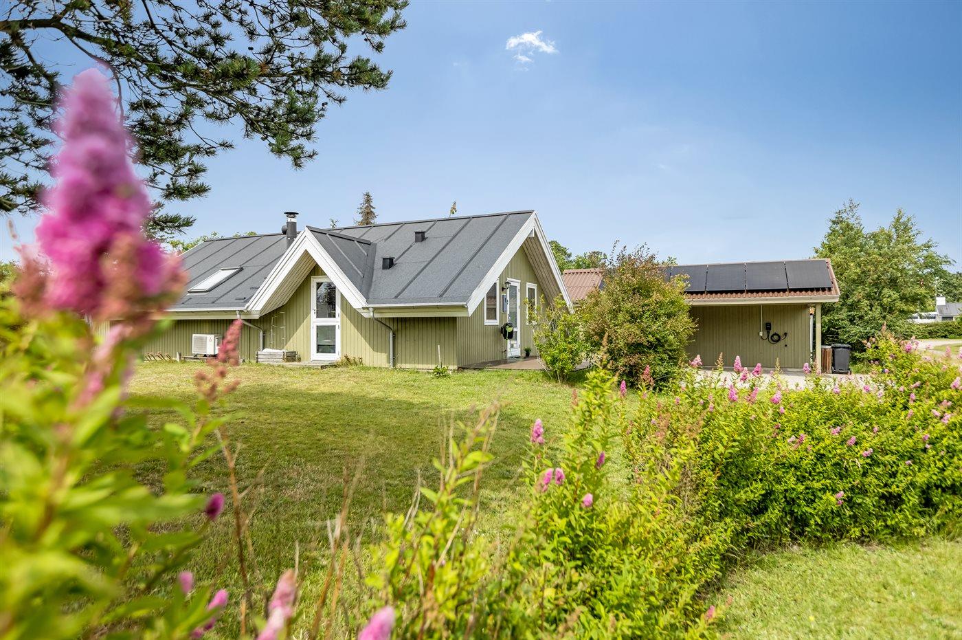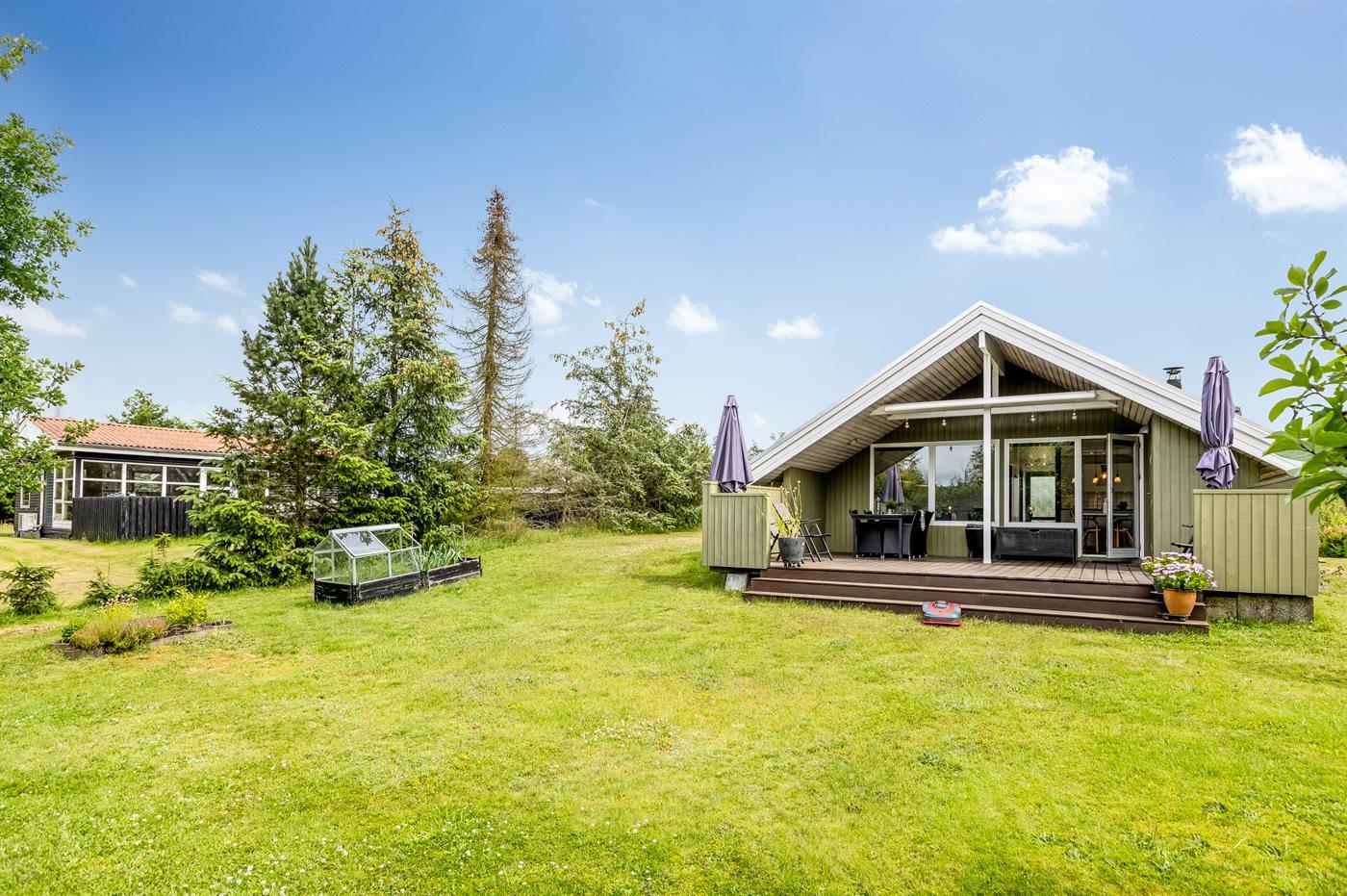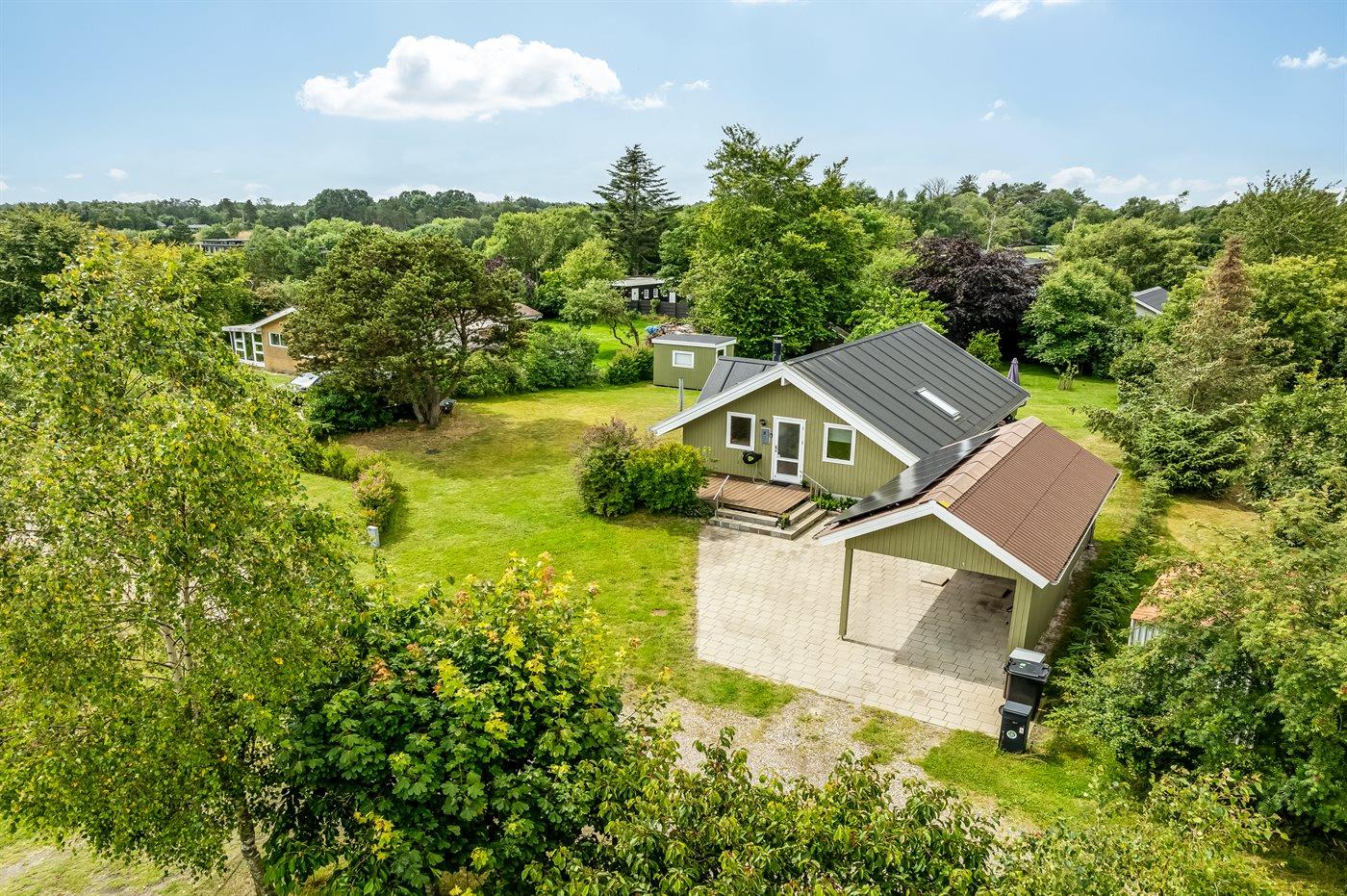 Skønt sommerhus med el-lader til bil, beliggende på en dejlig stor grund med mange buske og træer, så du altid kan finde en hyggekrog. På den hyggelige terrasse har du mulighed for at slappe af i solen, og bliver det for meget, kan du sætte dig på den overdækkede del af terrassen eller slå markisen ud.