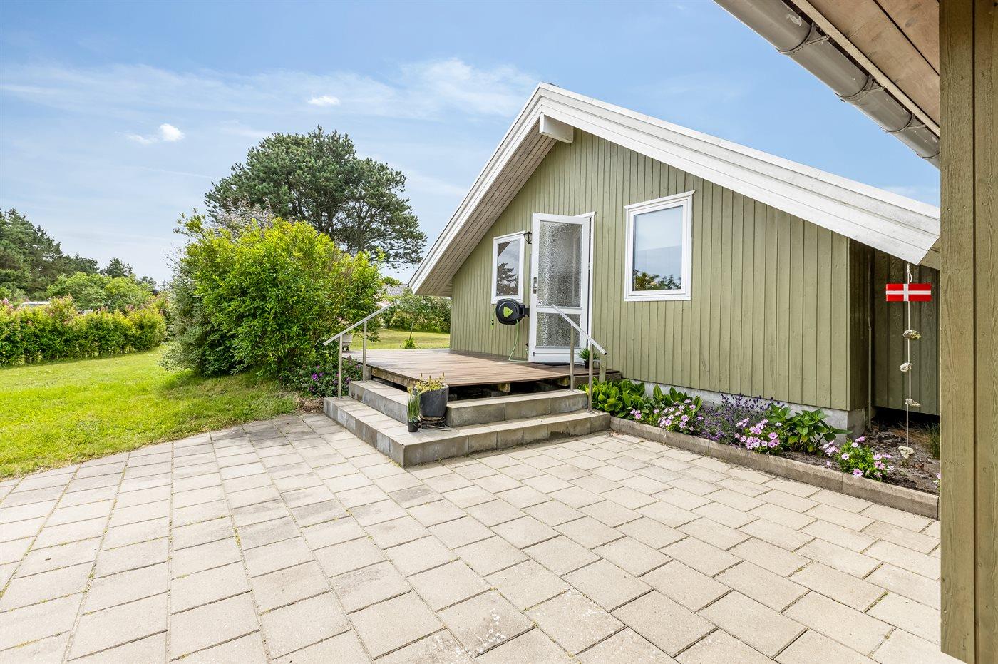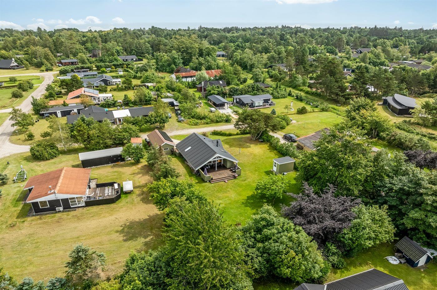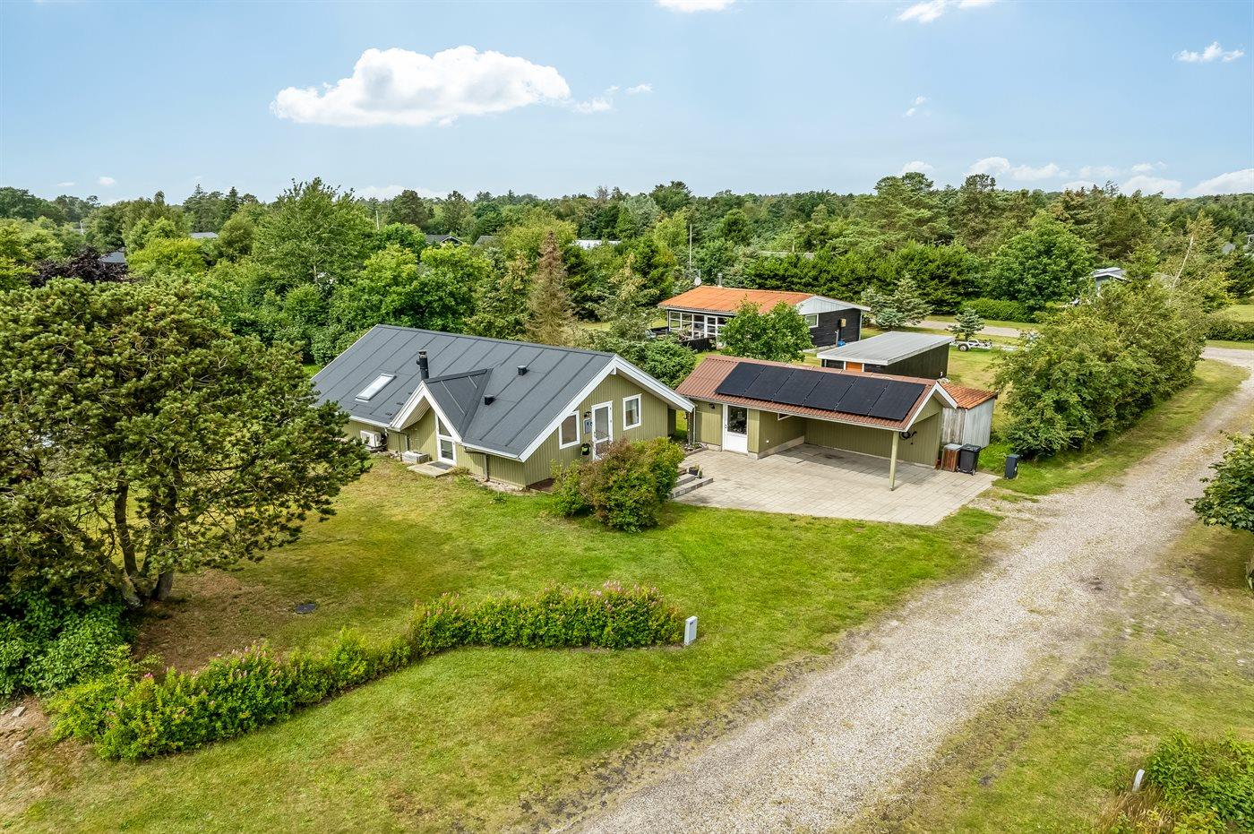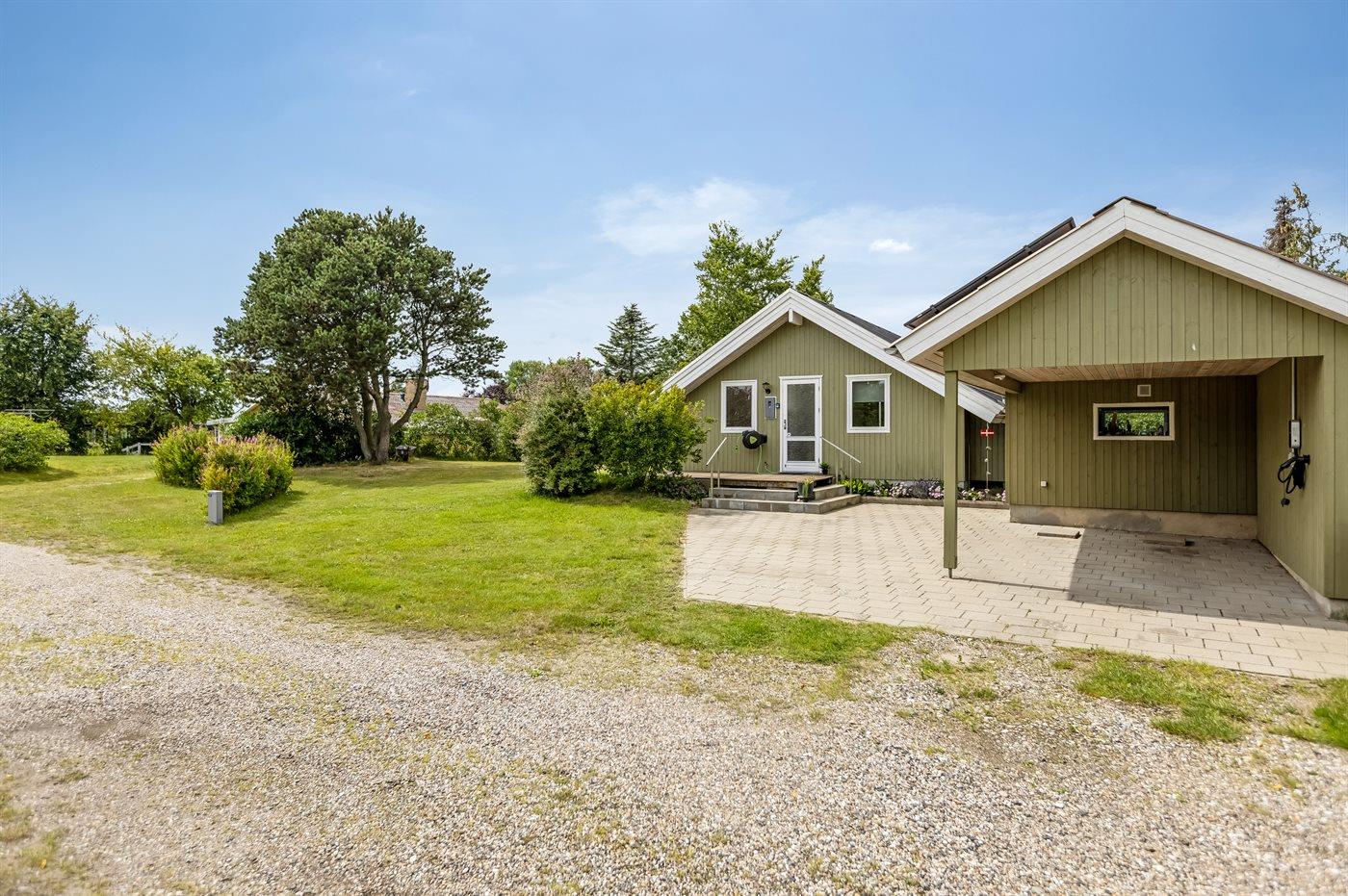 Ferieboligen er beliggende på en 1297 m² stor havegrund. Der er 1000 m til havet. Der er 6700 m til fjorden. Nærmeste forretning er beliggende i en afstand af 1200 m. Der er en golfbane i en afstand af 6000 m. Til ferieboligen hører åbent terrasseareal. Desuden er der overdækket terrasse. Der er installeret stik til opladning af elbil. Type 2 stik. Med 20 kW ladeeffekt. Parkering ved ferieboligen.