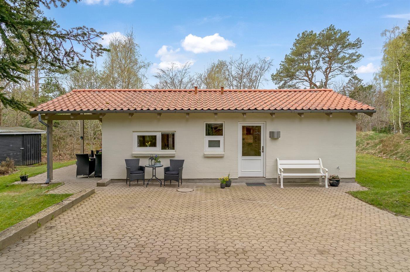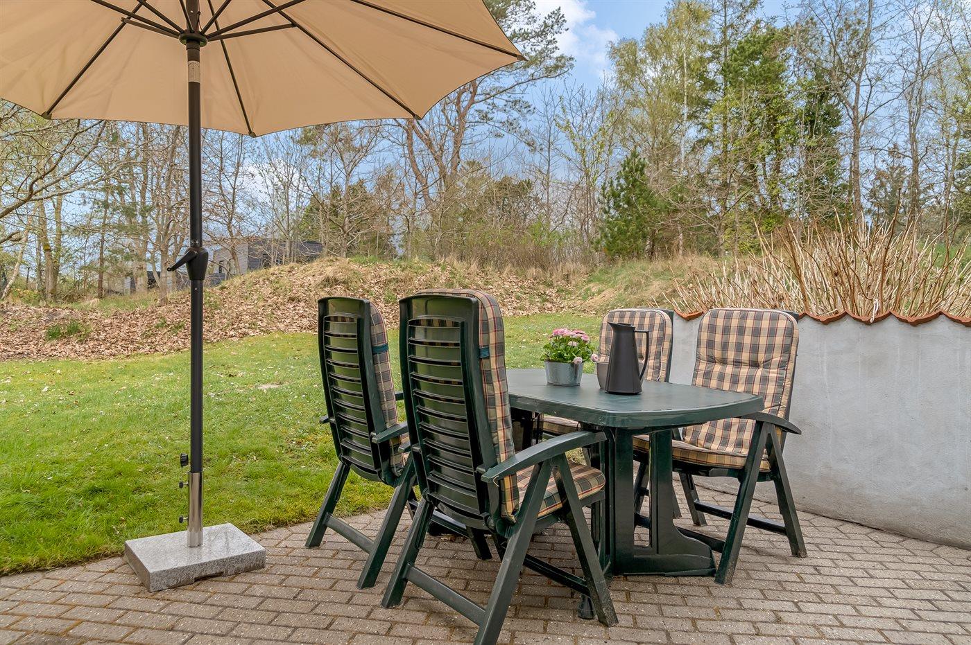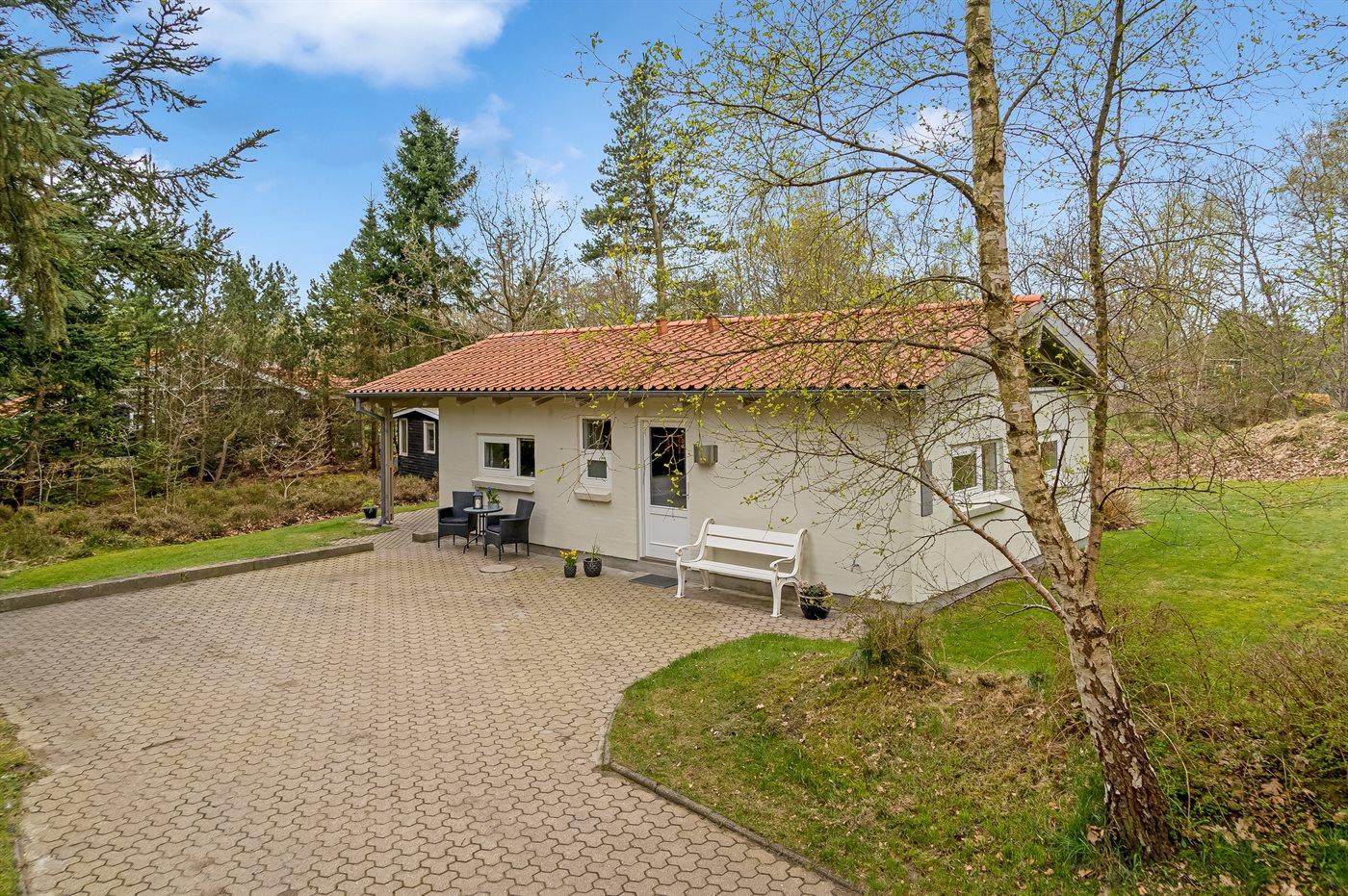 Ferieboligen er beliggende på en 1200 m² stor havegrund. Der er 300 m til havet. Nærmeste forretning er beliggende i en afstand af 800 m. Til ferieboligen hører 35 m² terrasseareal. Desuden er der 10 m² overdækket terrasse. Sandkasse. Grill til rådighed. Parkering ved ferieboligen.