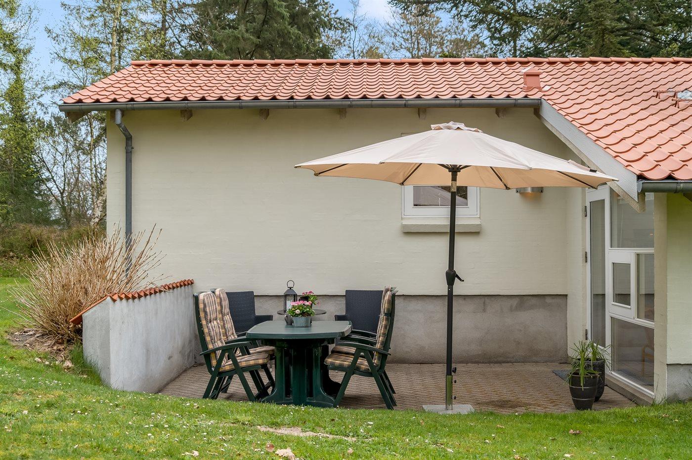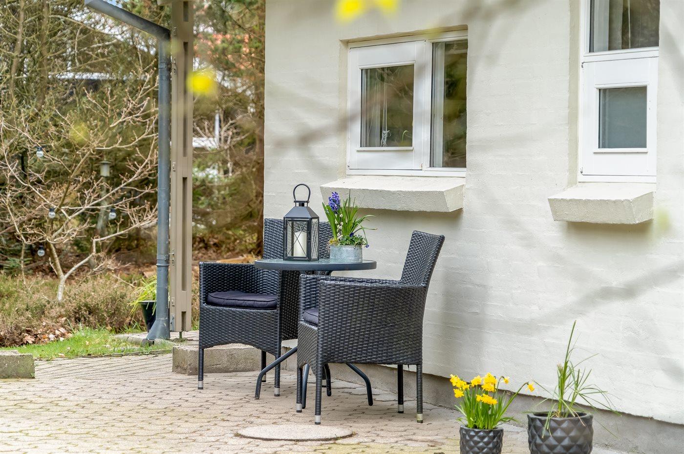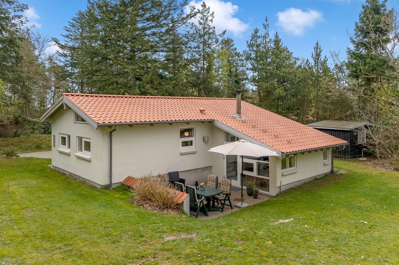 Ferieboligen er beliggende på en 1200 m² stor havegrund. Der er 300 m til havet. Nærmeste forretning er beliggende i en afstand af 800 m. Til ferieboligen hører 35 m² terrasseareal. Desuden er der 10 m² overdækket terrasse. Sandkasse. Grill til rådighed. Parkering ved ferieboligen.