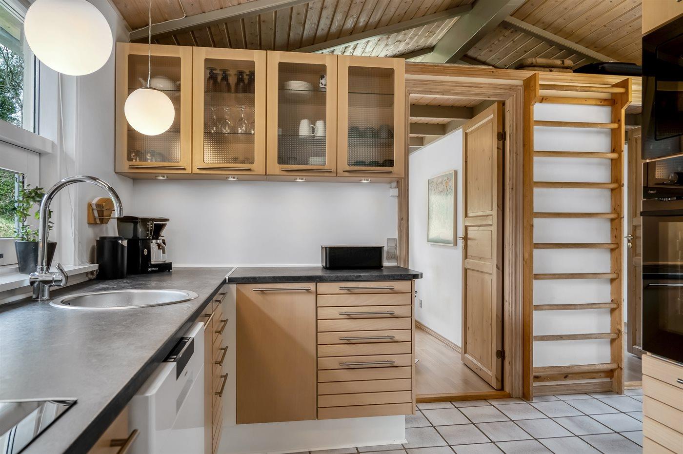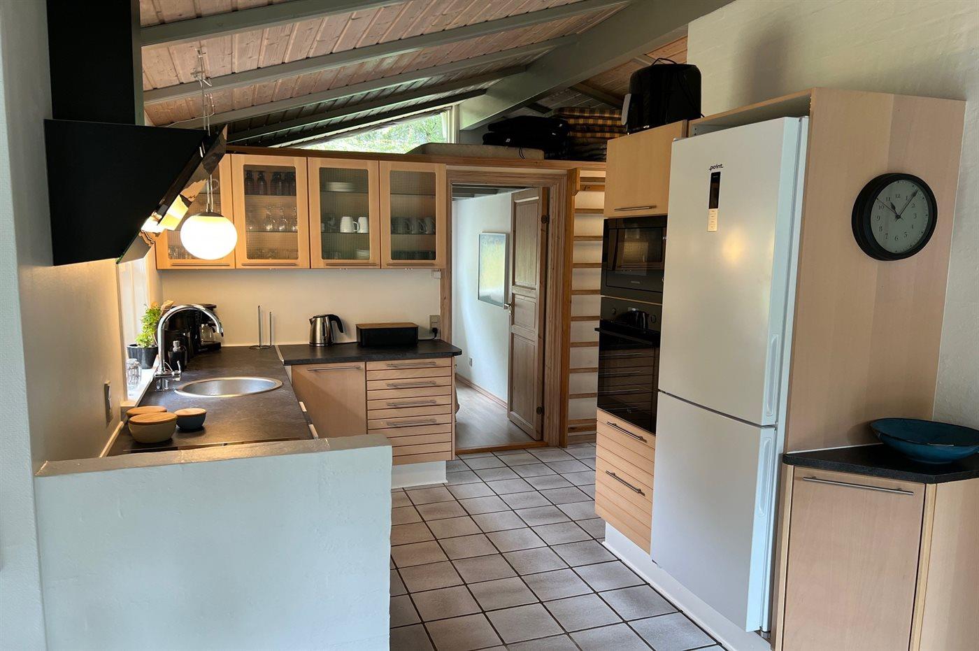 Køkkenet er udstyret med 1 køleskab. Der er 4 keramiske kogeplader, varmluftovn, mikrobølgeovn samt opvaskemaskine.