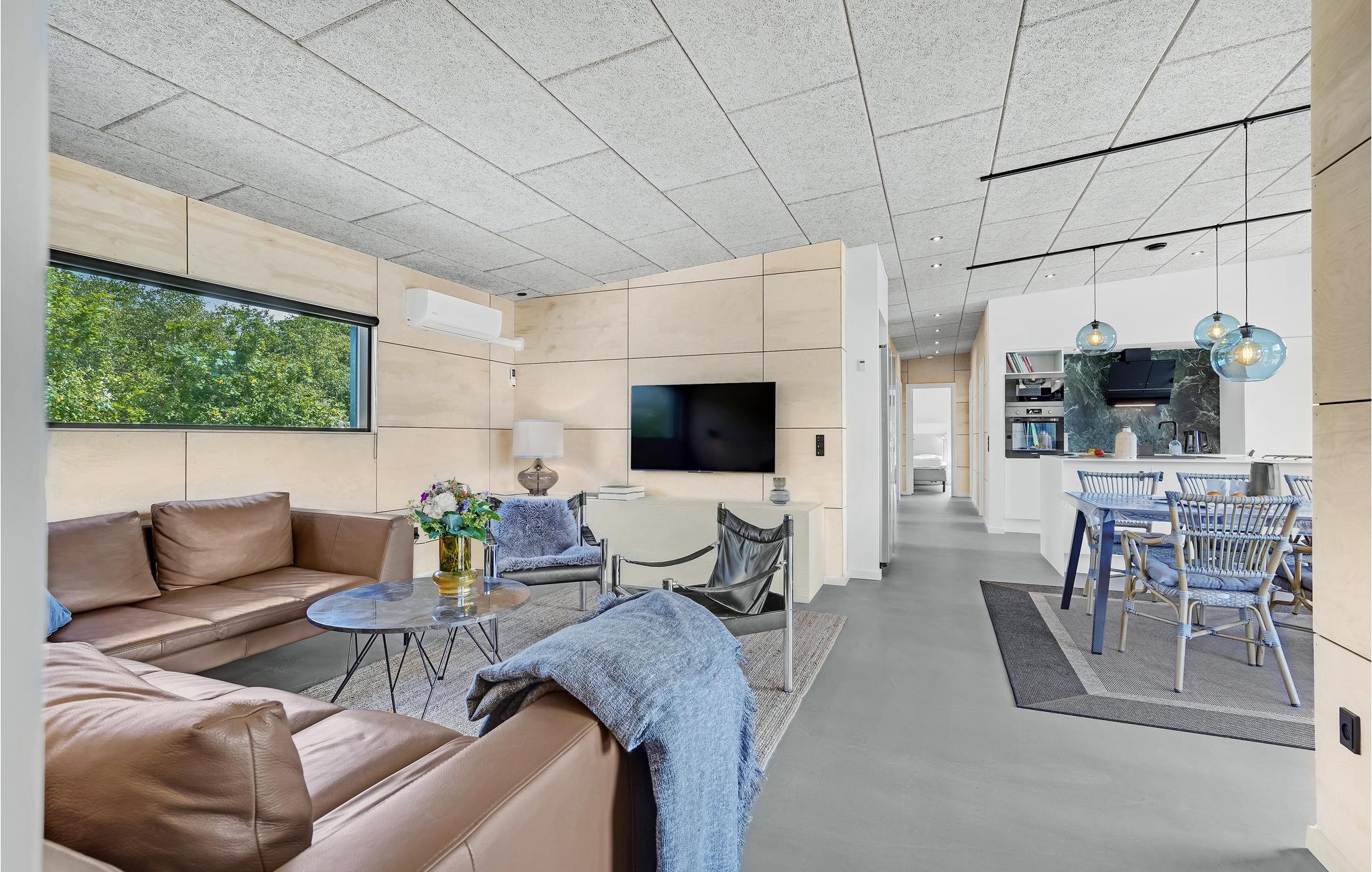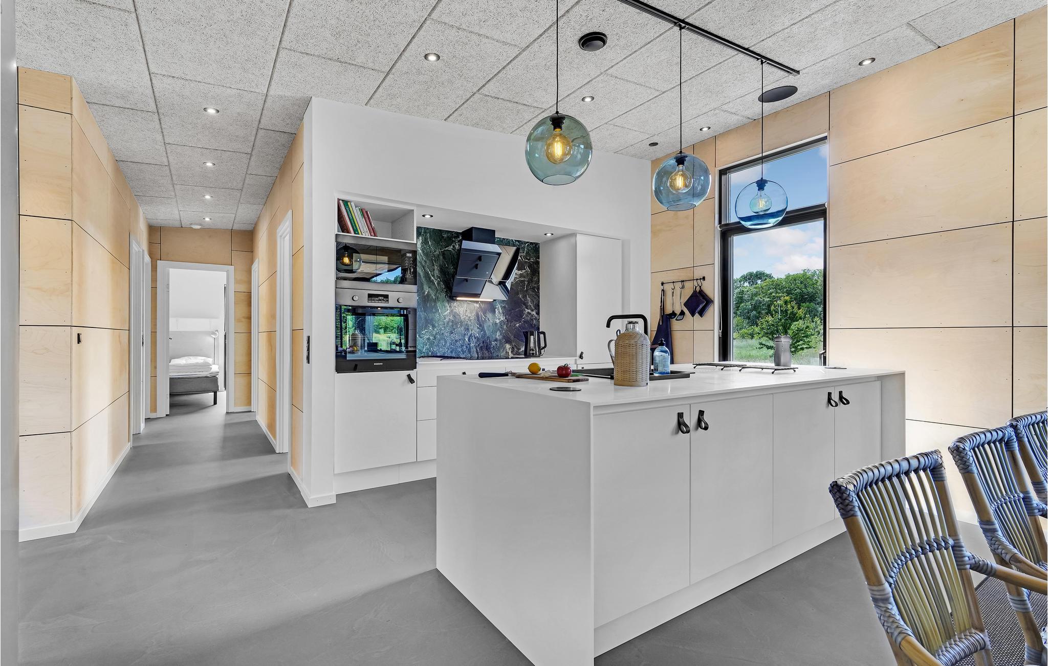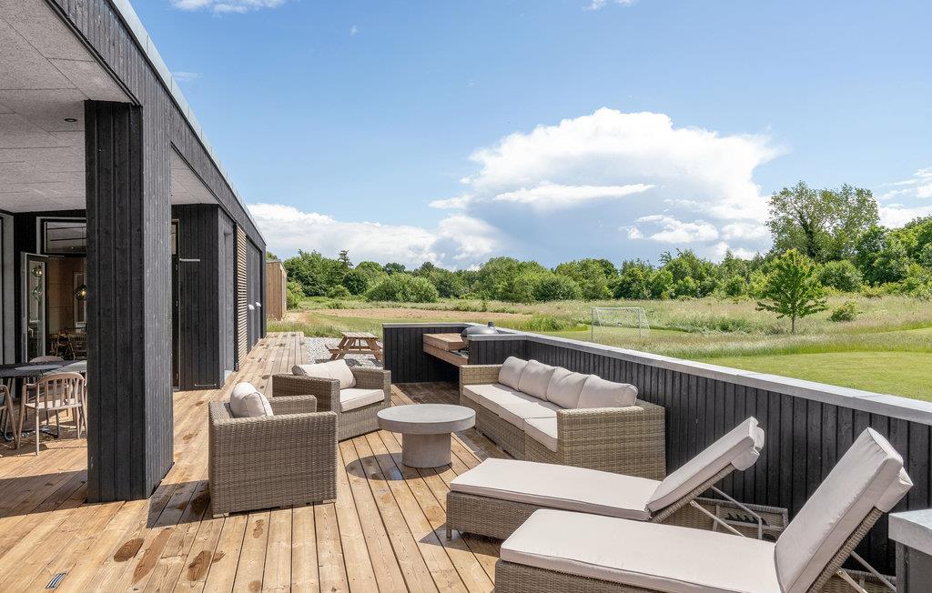 Det moderne sommerhus af træ ligger i Hou og har plads til 10 personer, som kan fordele sig i de fem soveværelser samt to badeværelser. Indretningen er moderne og stilfuld, der er attraktive betongulve i hele huset, og gulvet er opvarmet. Fra de store vinduer i opholdsstuen har I en smuk udsigt til det omkringliggende grønne område.