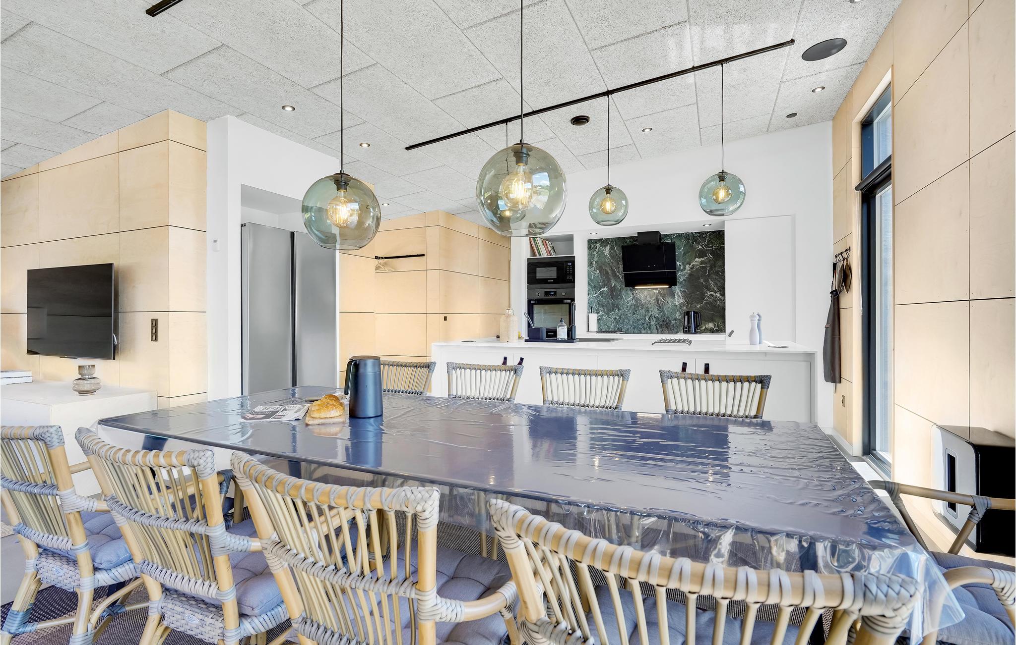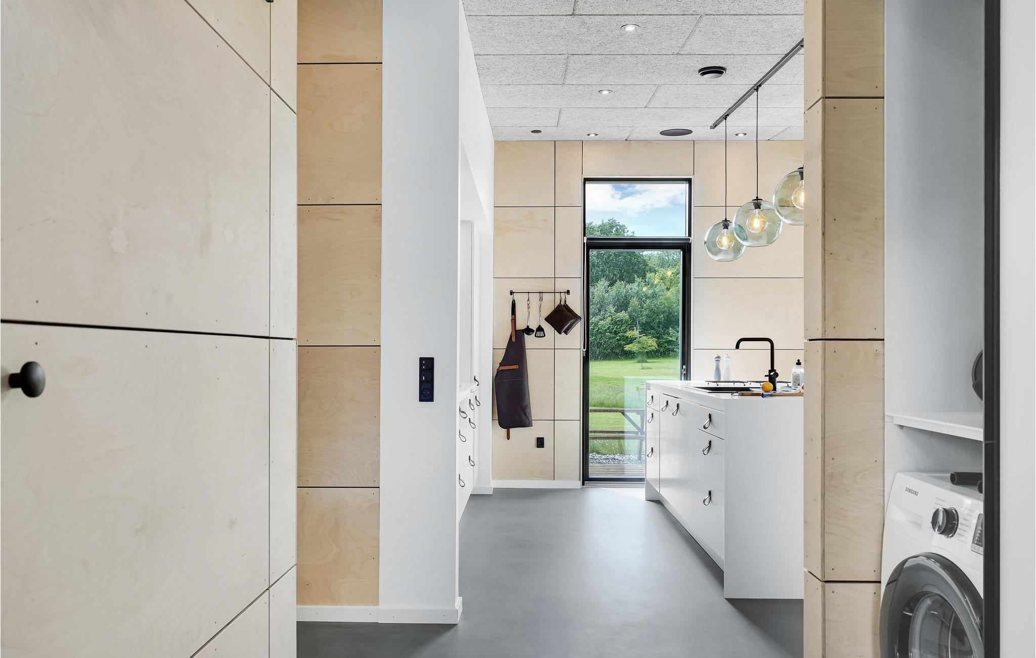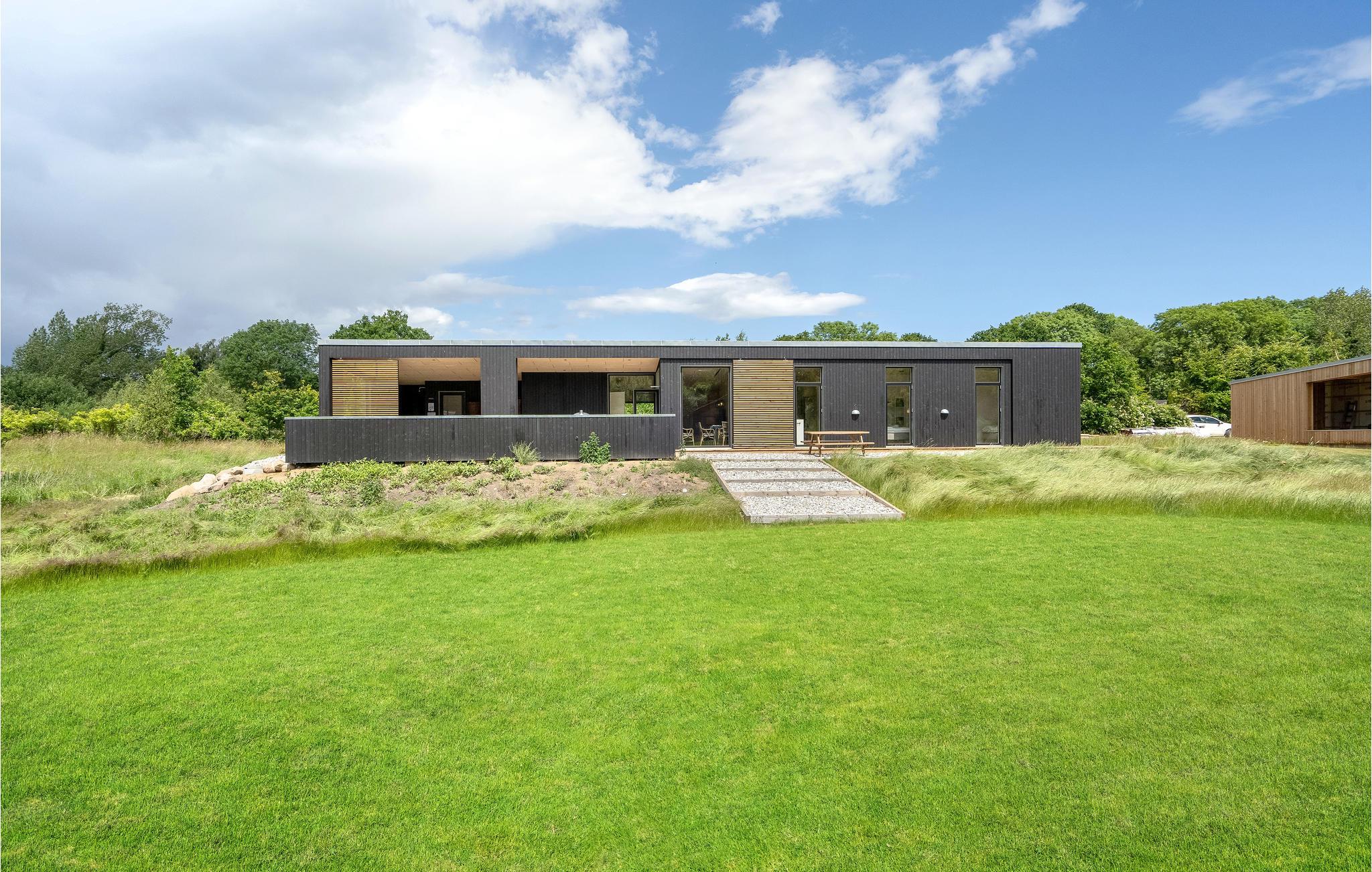 Det moderne sommerhus af træ ligger i Hou og har plads til 10 personer, som kan fordele sig i de fem soveværelser samt to badeværelser. Indretningen er moderne og stilfuld, der er attraktive betongulve i hele huset, og gulvet er opvarmet. Fra de store vinduer i opholdsstuen har I en smuk udsigt til det omkringliggende grønne område.