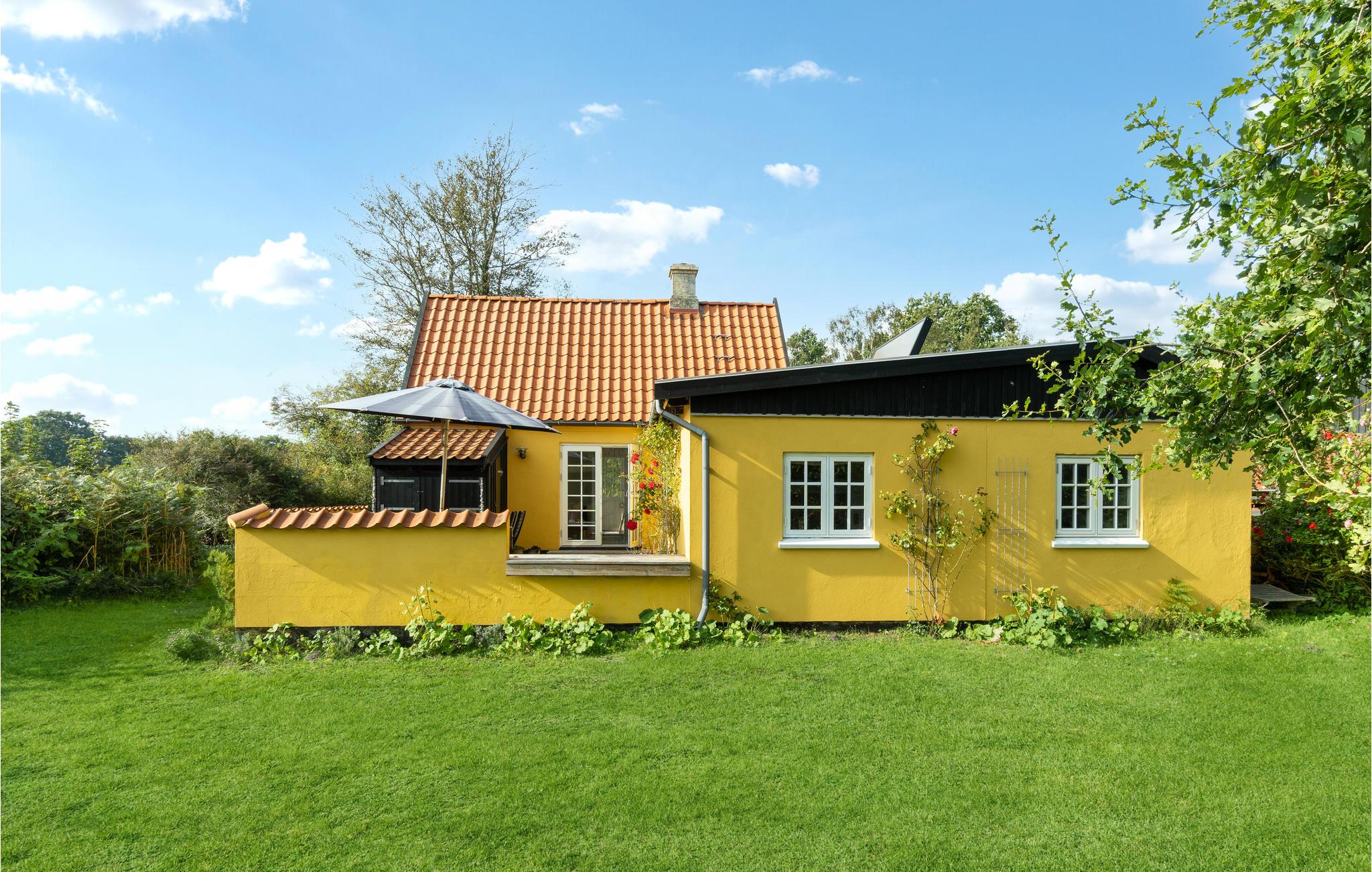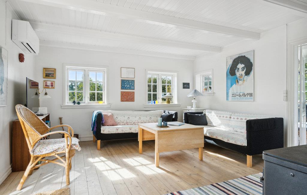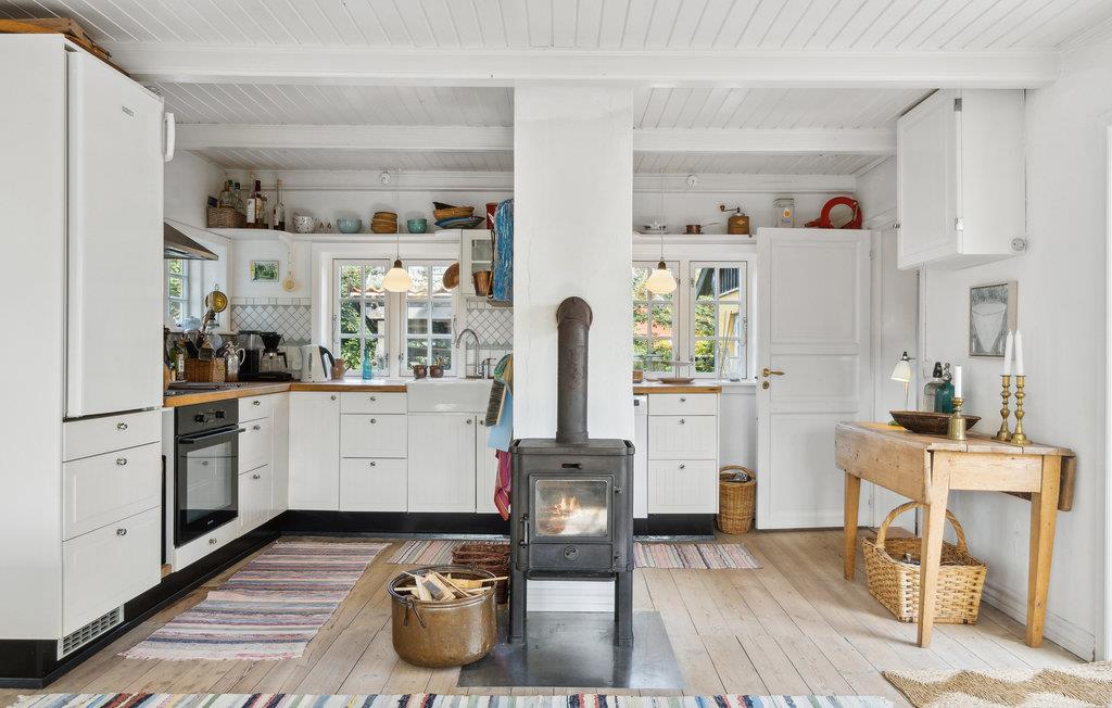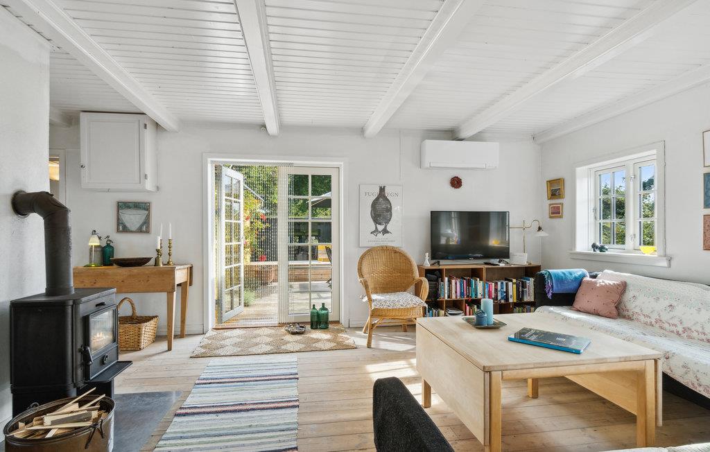 Nyd en afslappende ferie i dette familievenlige feriehus nær stranden. Den hyggelige stue og spisestuen med sprossevinduer bliver husets centrum, hvor hele familien kan samles om at lave mad, spise og hygge sig ved brændeovnen. Fra opholdsrummet kan I gå ud på den indbydende træterrasse og nyde en kølig drink og solen. I haven er der masser af plads til at lege sammen på græsplænen eller ligge på liggestolene og lytte til sin yndlingspodcast. En meget kort gåtur langs stien fører jer til den smukke stenstrand, hvor det krystalklare vand indbyder til forfriskning. Saml sten og skaller og kast fiskesnøren ud i skumringen.