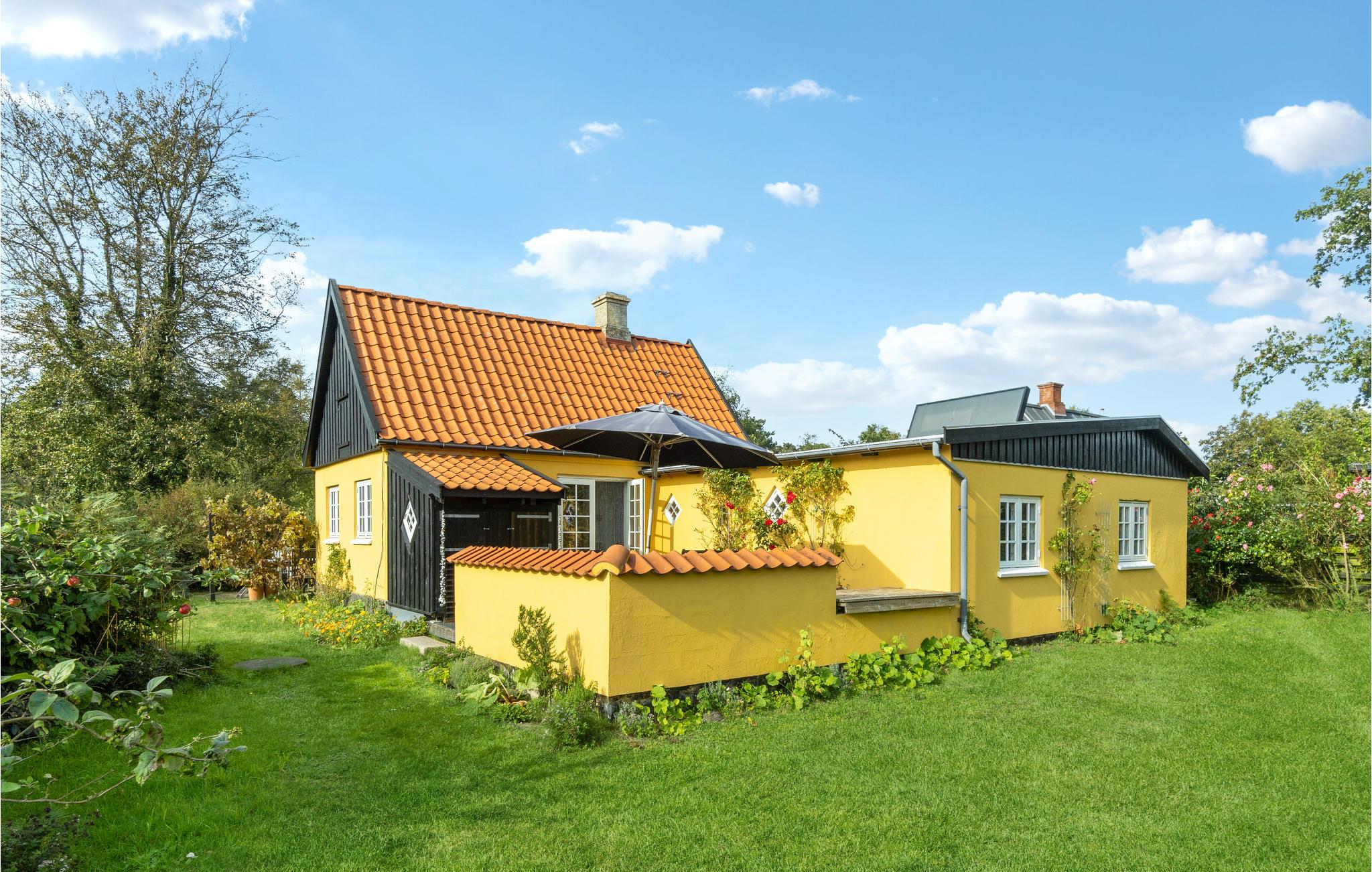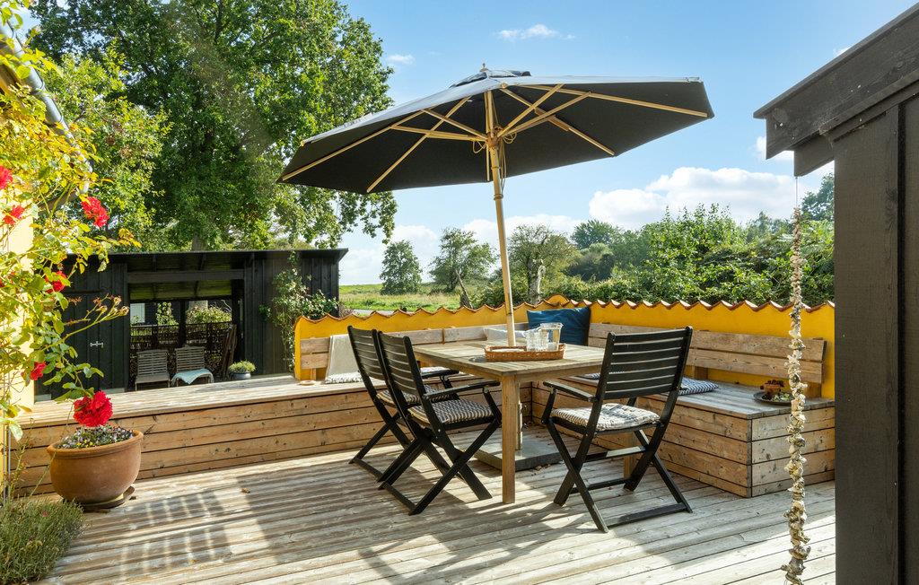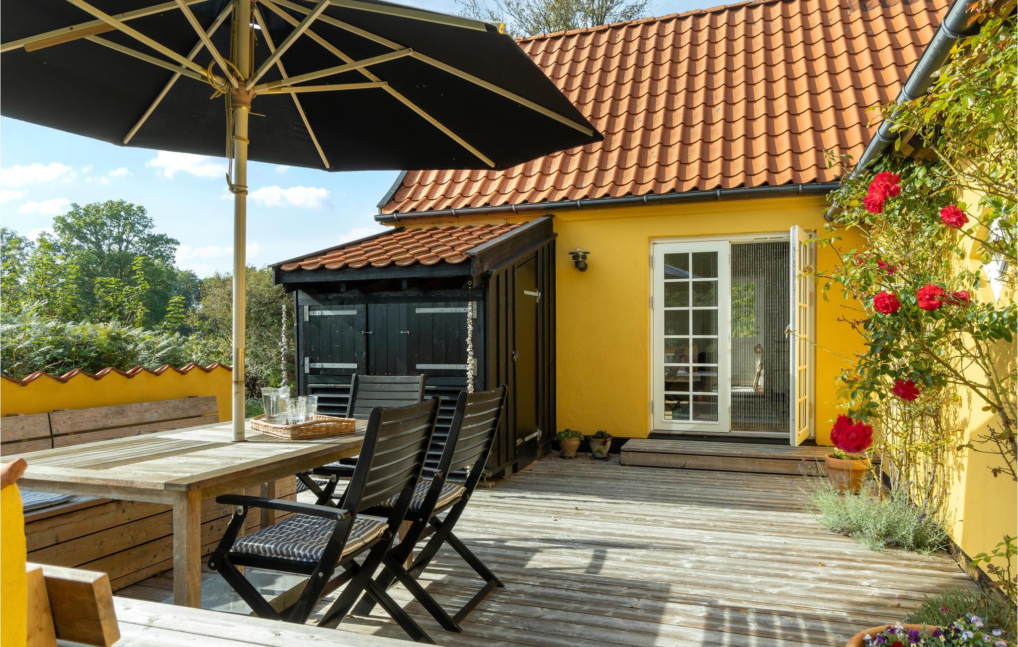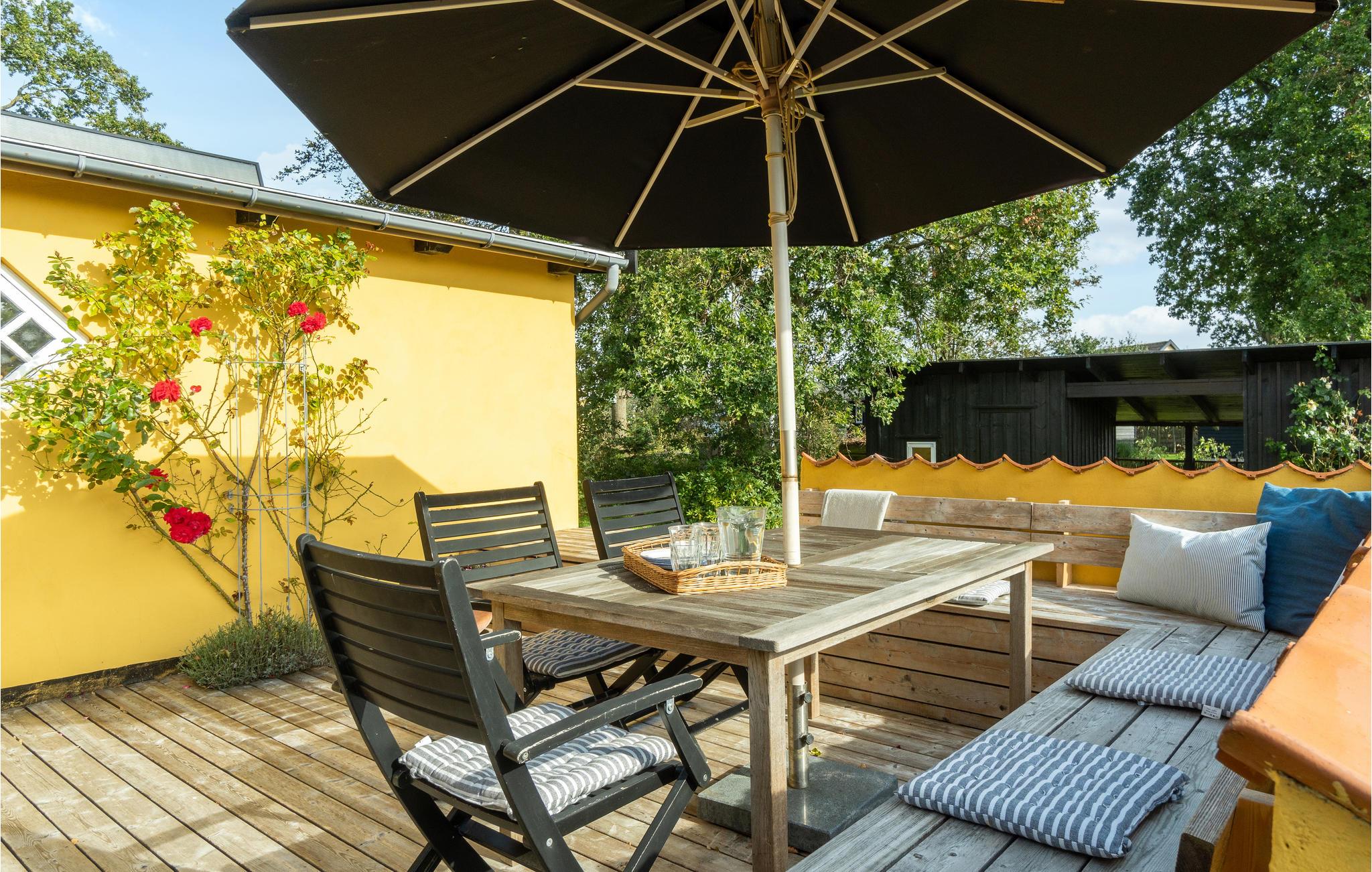 Nyd en afslappende ferie i dette familievenlige feriehus nær stranden. Den hyggelige stue og spisestuen med sprossevinduer bliver husets centrum, hvor hele familien kan samles om at lave mad, spise og hygge sig ved brændeovnen. Fra opholdsrummet kan I gå ud på den indbydende træterrasse og nyde en kølig drink og solen. I haven er der masser af plads til at lege sammen på græsplænen eller ligge på liggestolene og lytte til sin yndlingspodcast. En meget kort gåtur langs stien fører jer til den smukke stenstrand, hvor det krystalklare vand indbyder til forfriskning. Saml sten og skaller og kast fiskesnøren ud i skumringen.