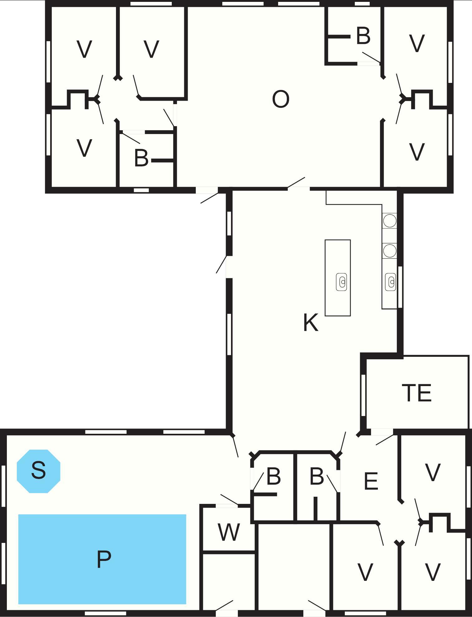 8 Soveværelser: (1DS)+(1DS)+(1DS)+(2S)+(2S)+(2S)+(2S)+(2S), barneseng