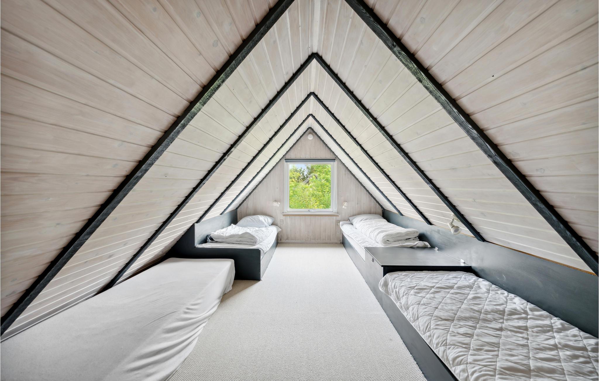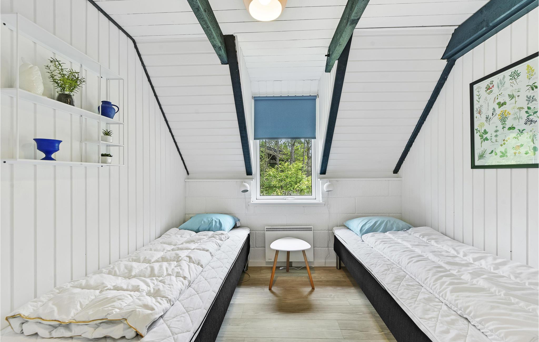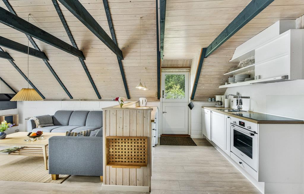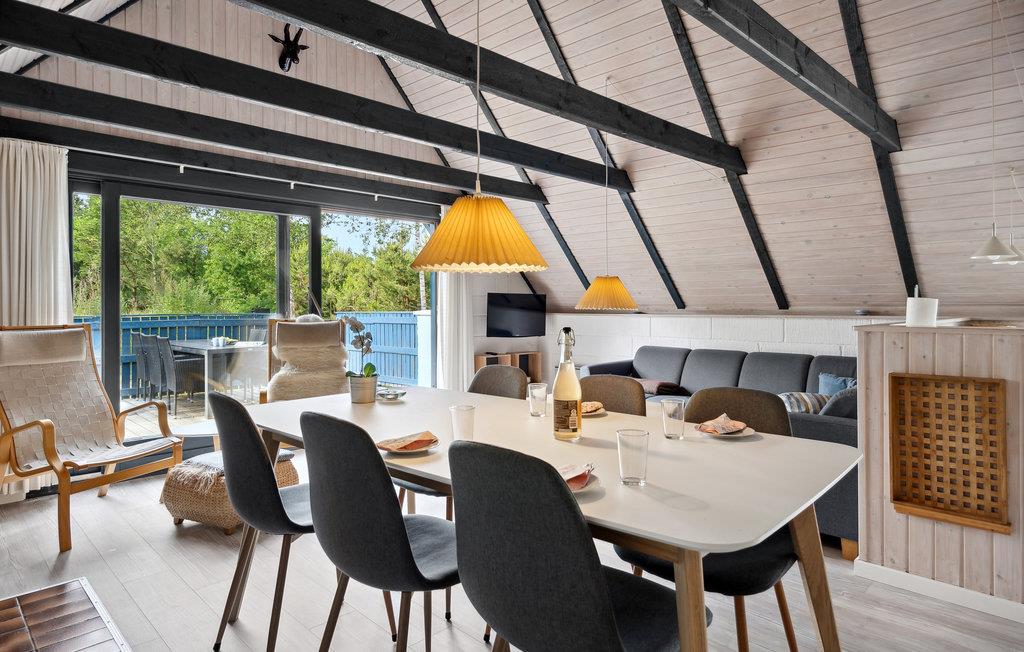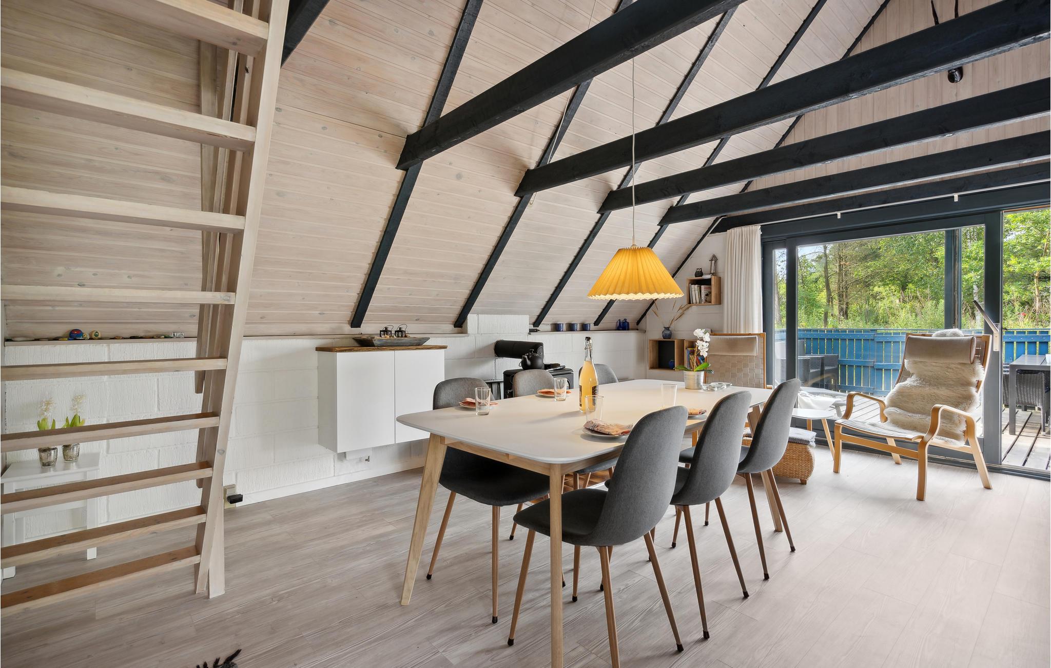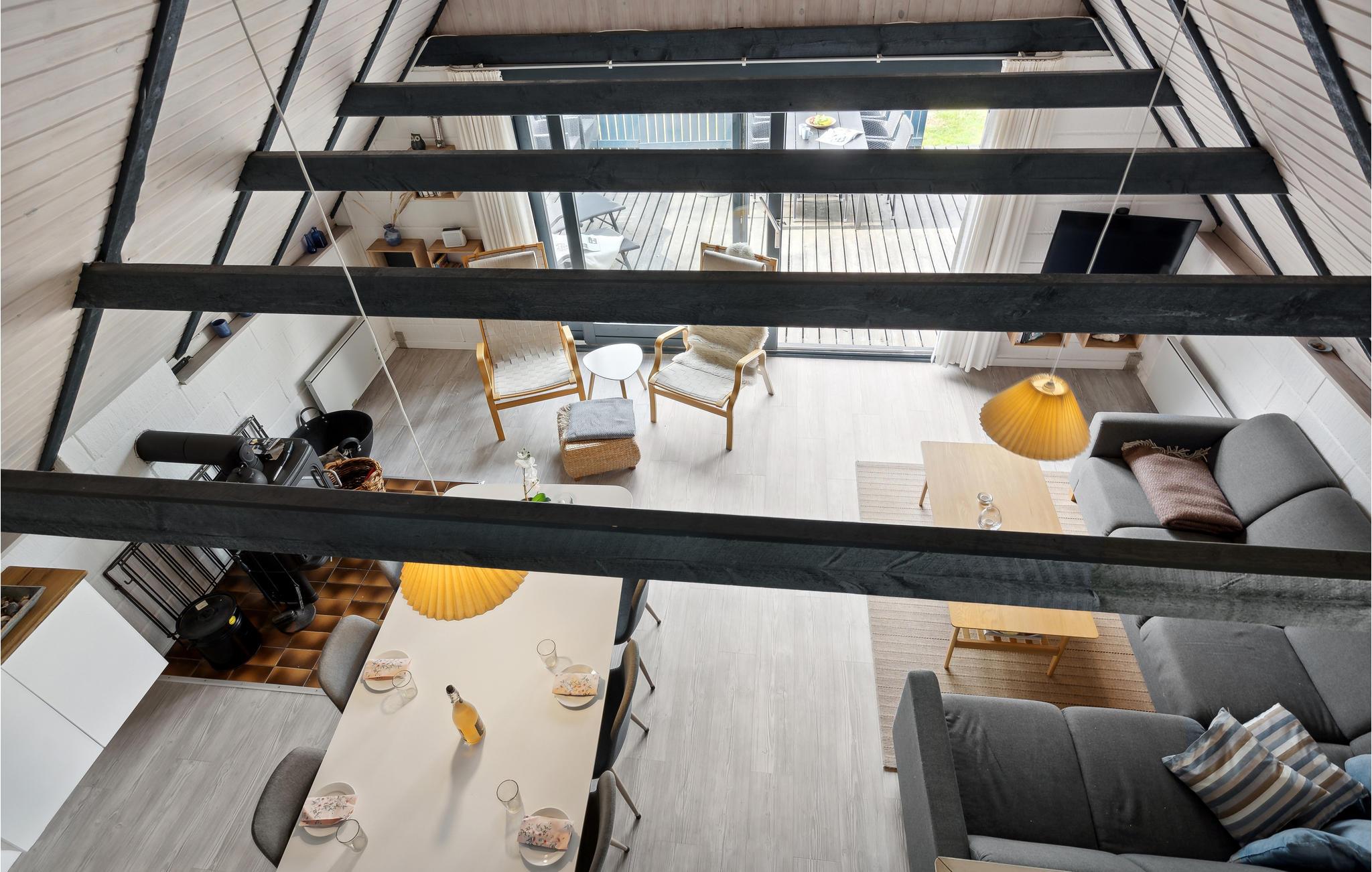 I rolige omgivelser finder I dette lyse og hyggeligt indrettede feriehus. Ud over de to soveværelser finder du yderligere hyggelige sovepladser på den åbne hems. Hjertet i huset er den rummelige stue med åbent køkken. Tilbring hyggelige timer ved måltiderne ved spisebordet, og slap af i de polstrede møbler med et krydsord eller en god film.