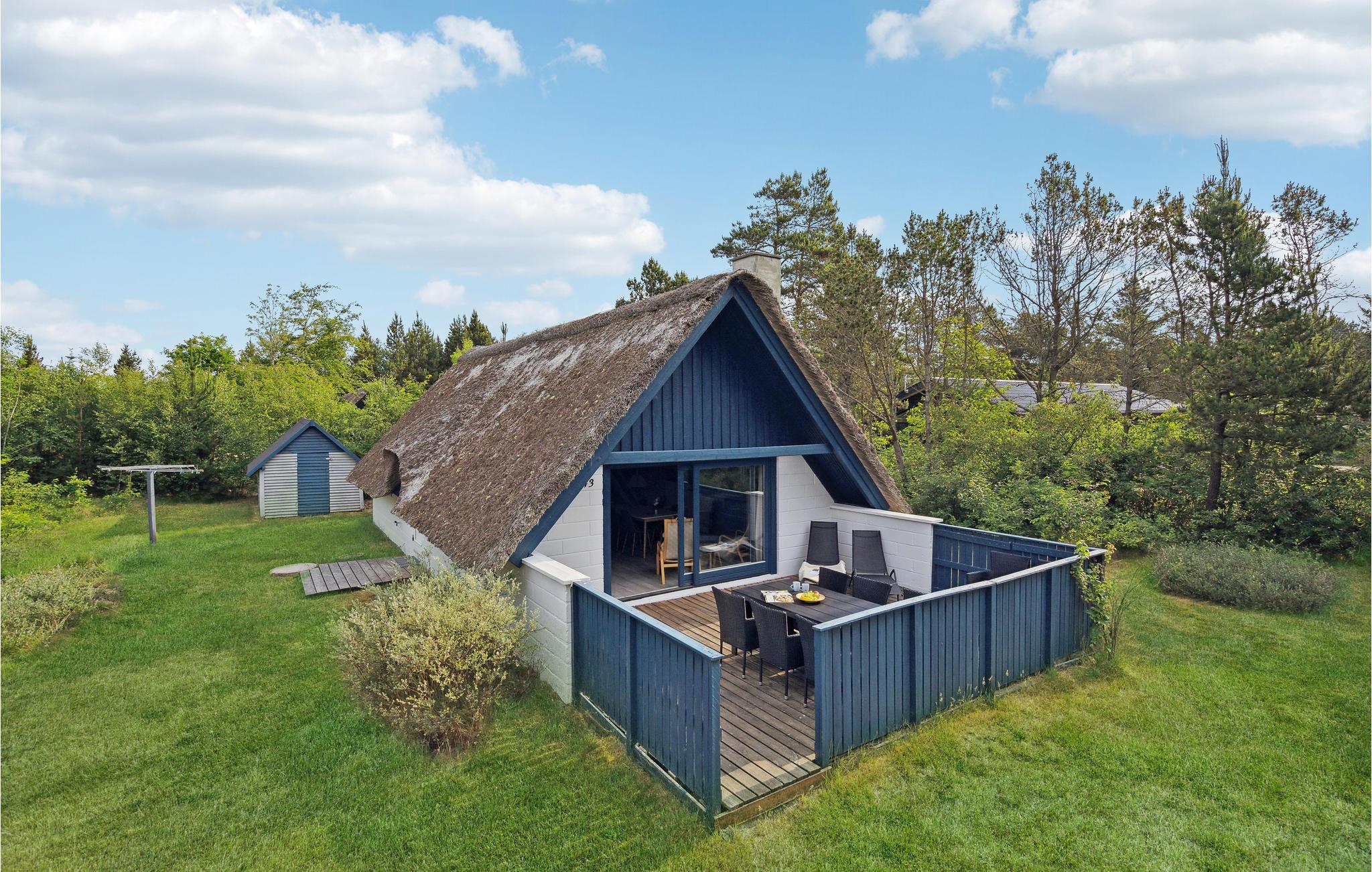 Charmerende feriehus med stråtag, brændeovn og åben terrasse i rolige omgivelser nær Vesterhavet.