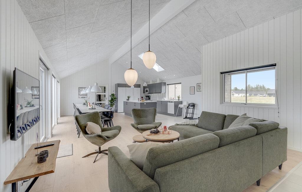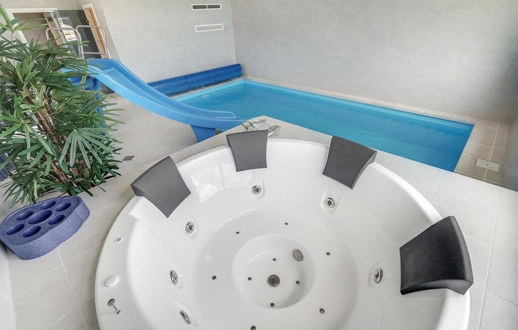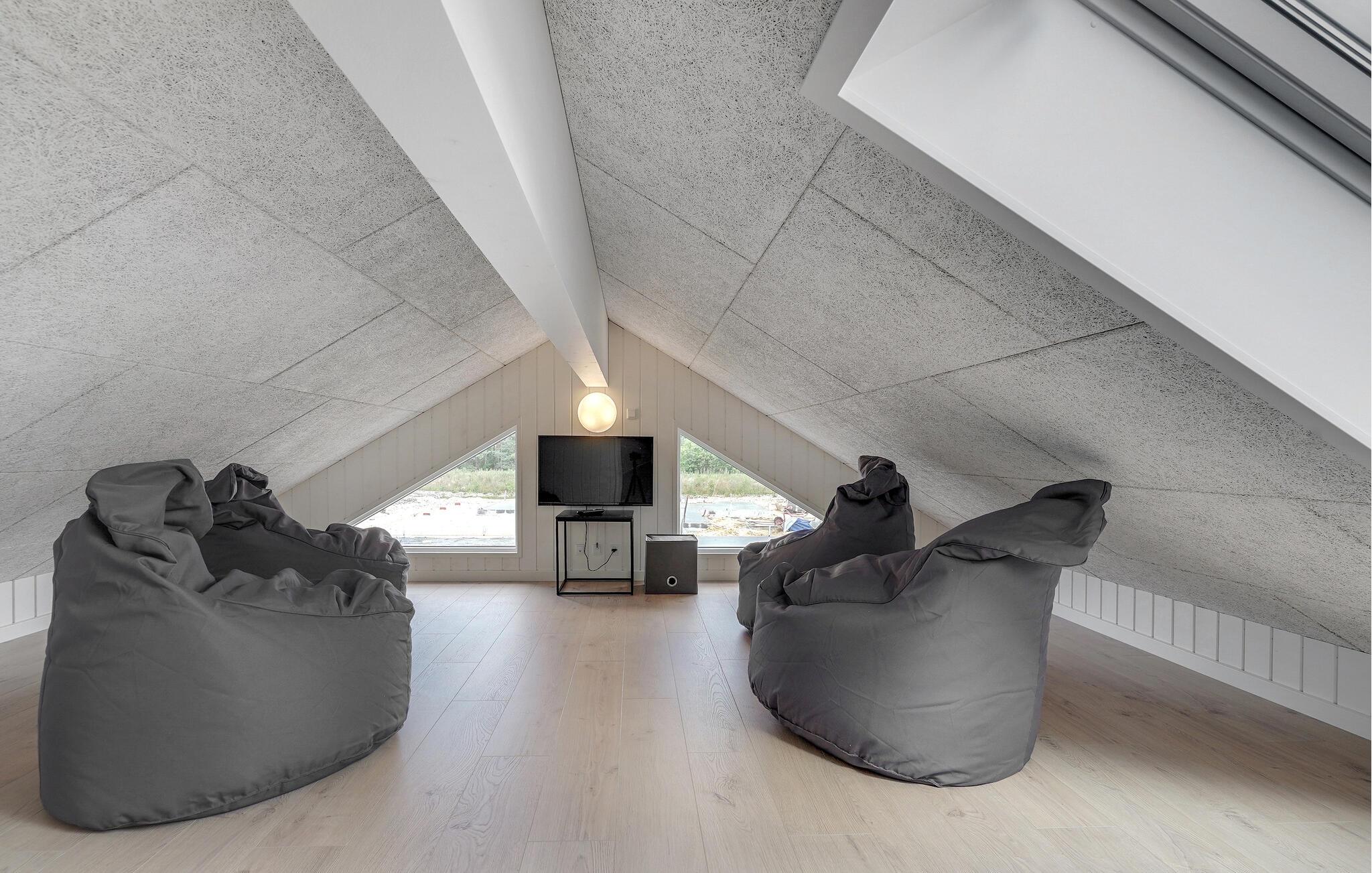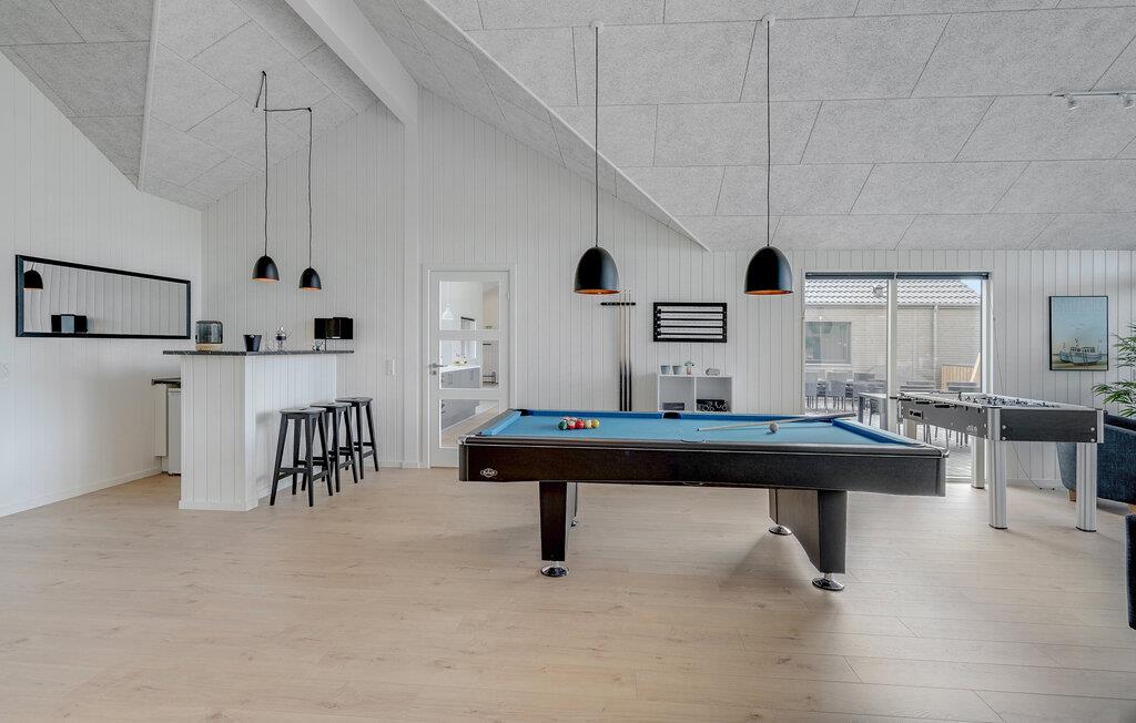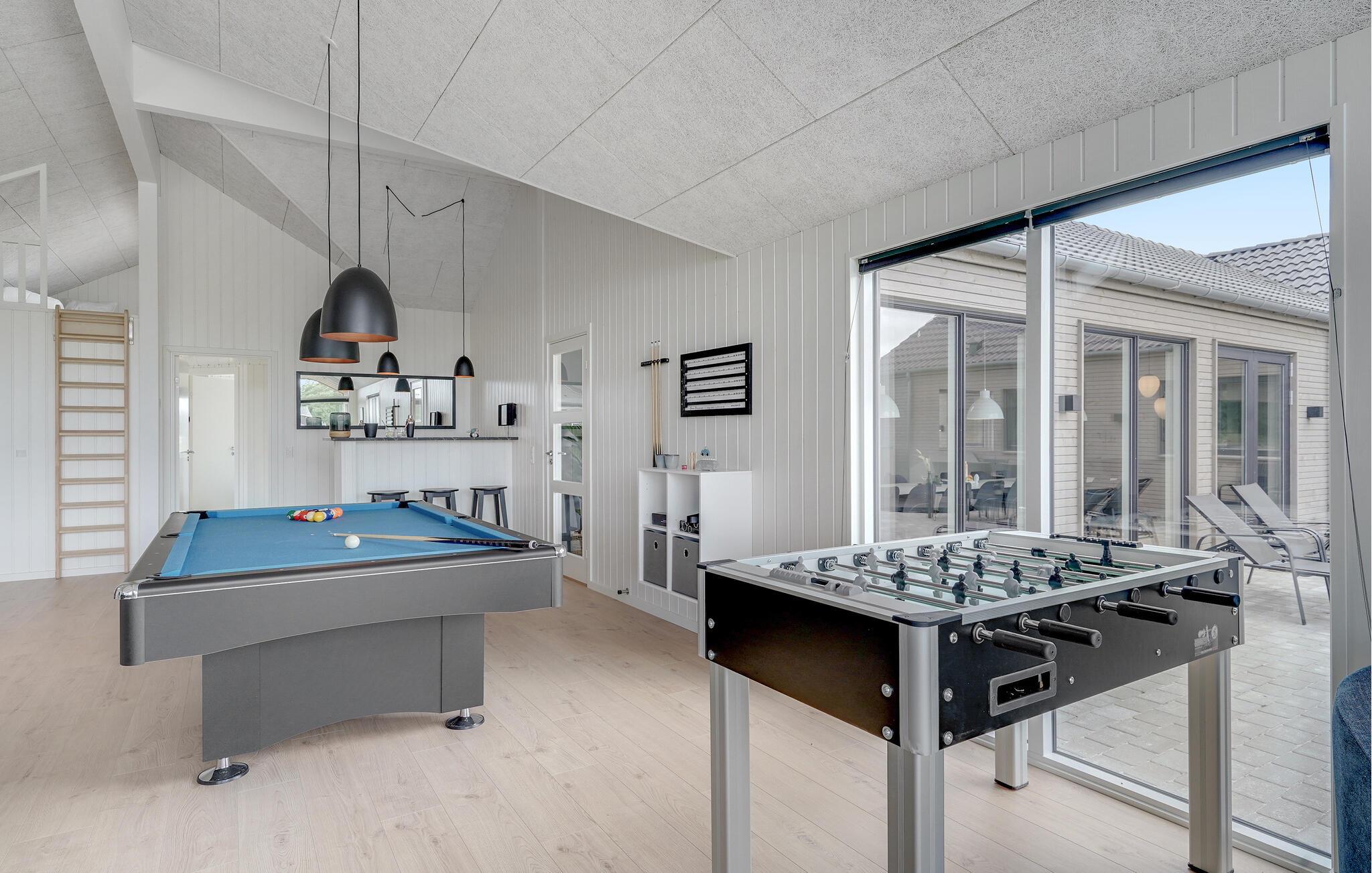 Det indre af dette sommerhus byder jer velkommen med et moderne design og rummelige, lyse værelser. Føl jer godt tilpas i den smagfuldt indrettede stue med en god film, spil billard, bordtennis eller Playstation4 og udfordr jer selv ved bordfodboldbordet. Forkæl jer selv med afslappende timer i jeres indendørs pool eller sauna. Tilbered kulinariske delikatesser sammen i køkkenet af høj kvalitet.