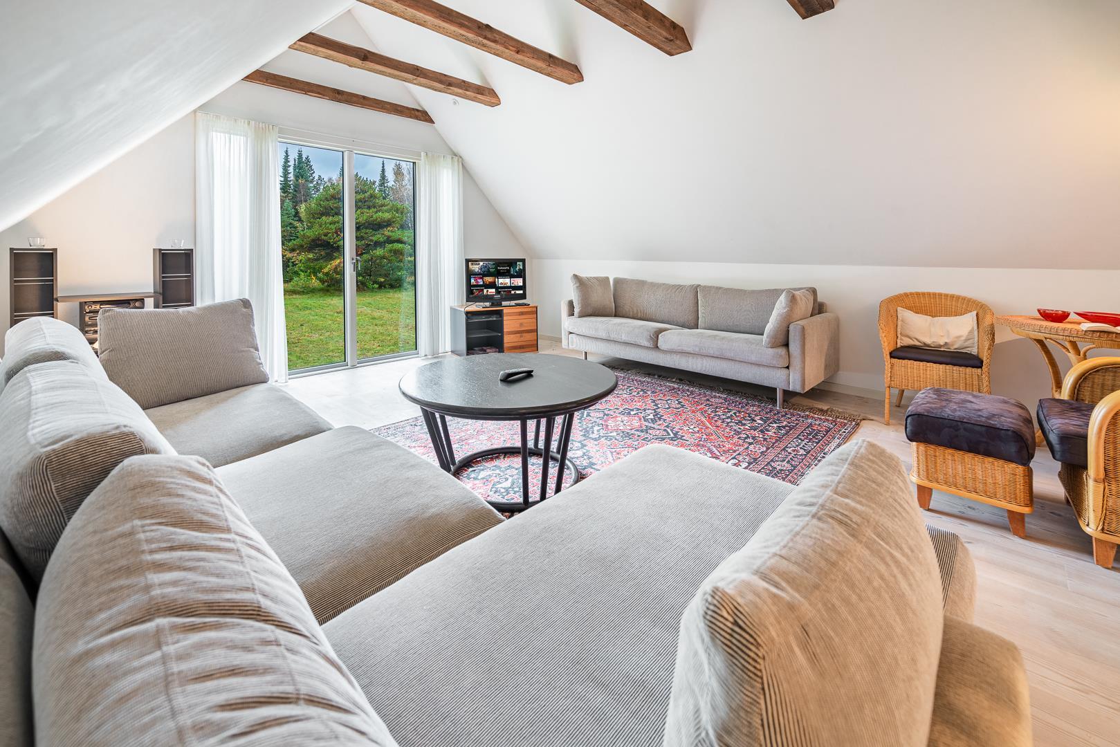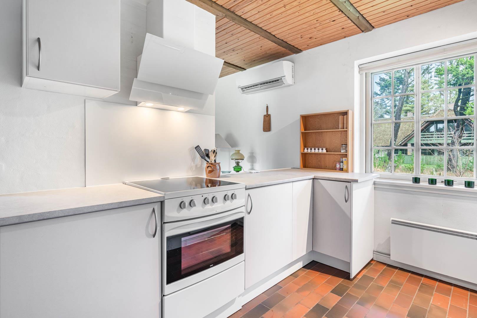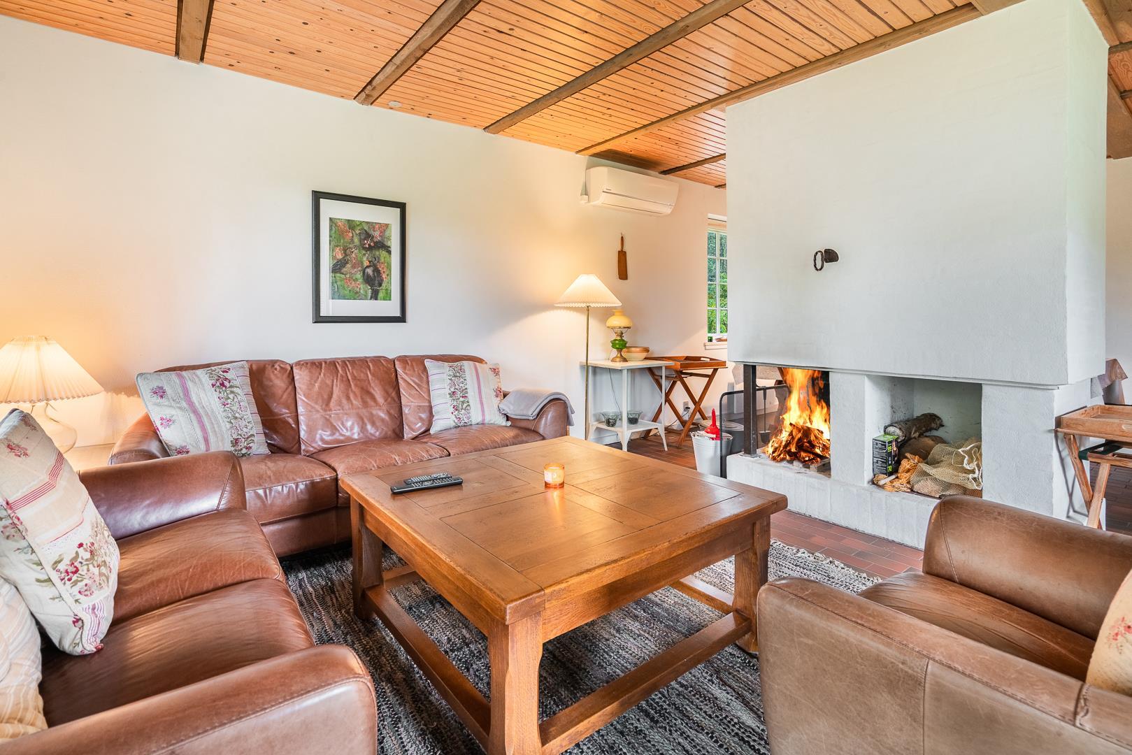 Sommerhusets hjerte er den store, lyse stue, hvor du kan slappe af foran brændeovnen og nyde den behagelige varme. Varmepumpen og gulvvarmen sørger for et dejligt indeklima året rundt – perfekt til både vinterferie og sommerdage ved havet.