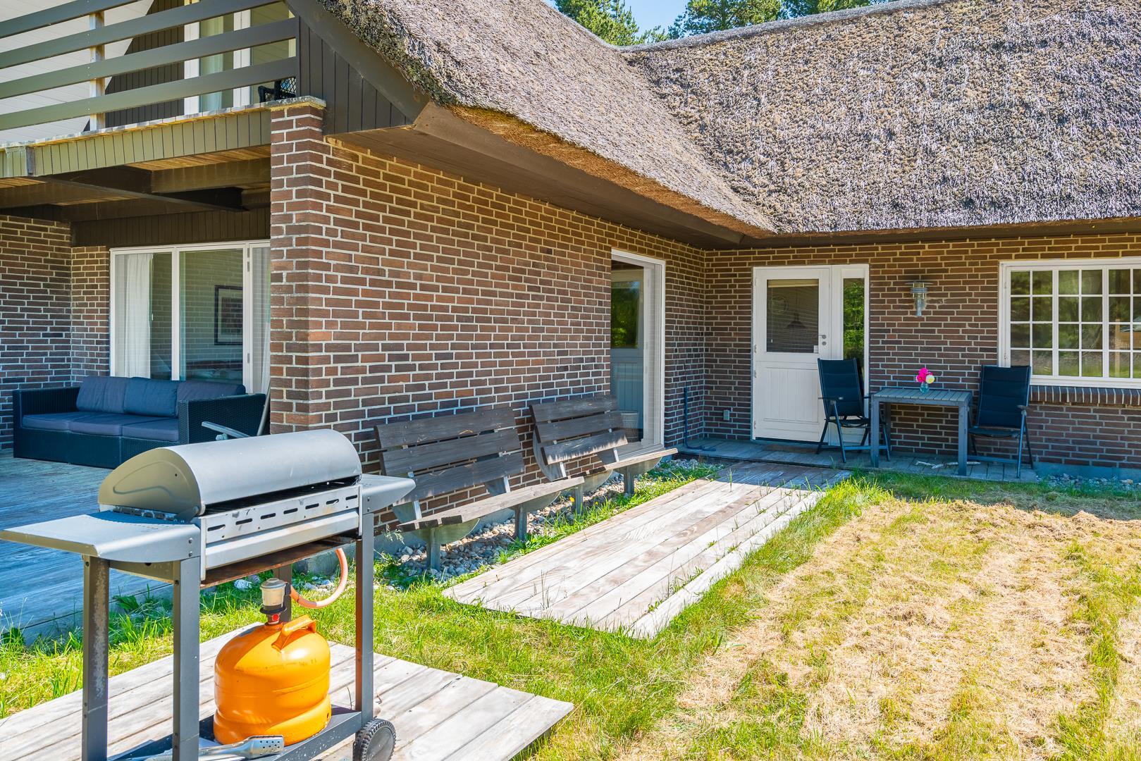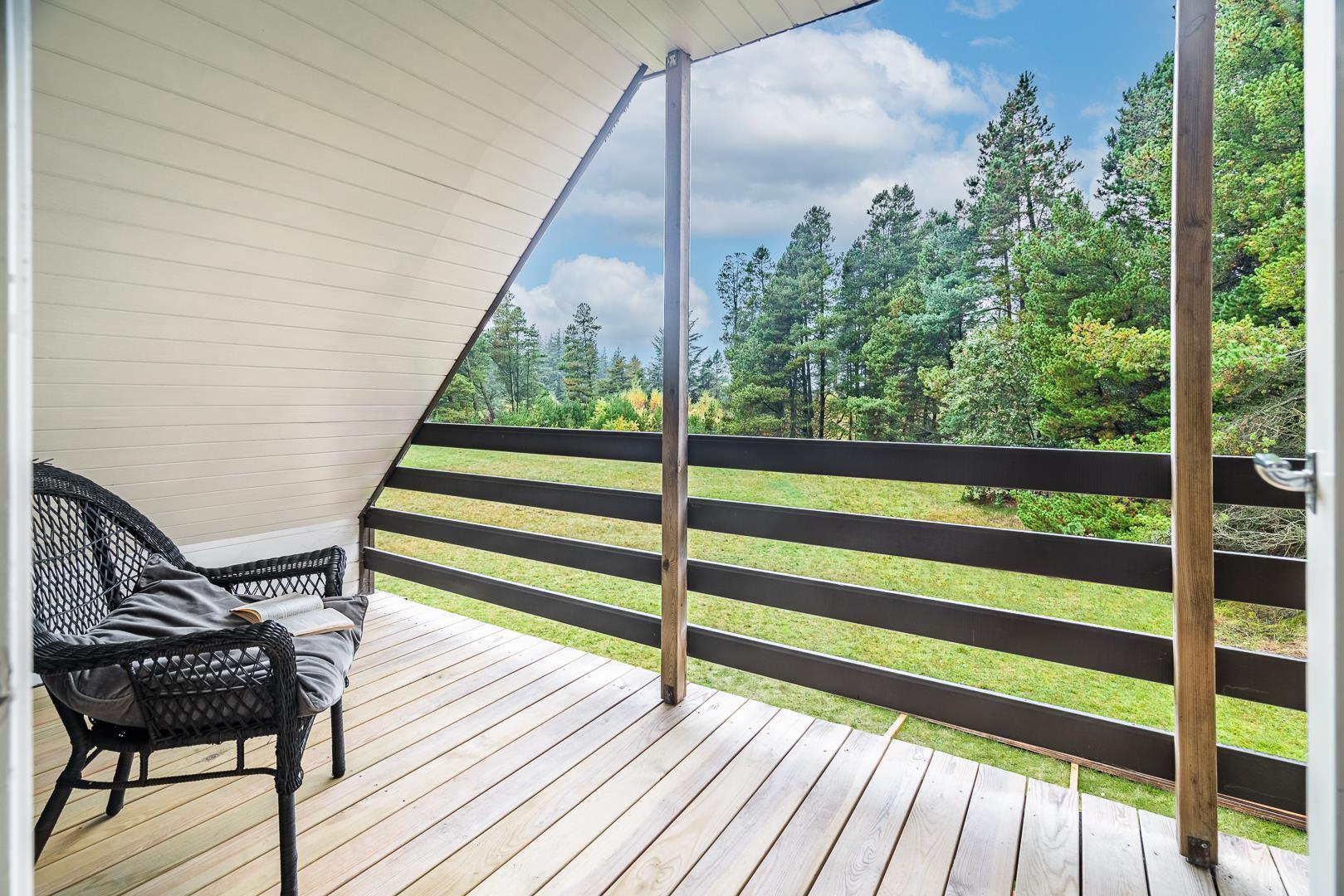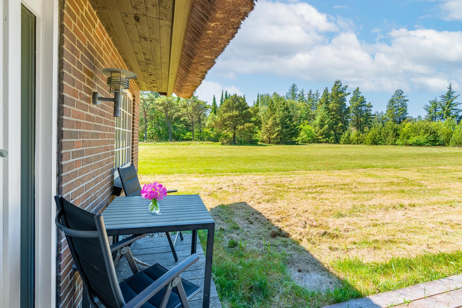 Sommerhuset ligger på en fredelig naturgrund omgivet af smuk vestjysk natur. Den overdækkede terrasse bliver hurtigt et af feriens højdepunkter – perfekt til morgenmad i solen, grillmiddage eller afslappende aftener under åben himmel.