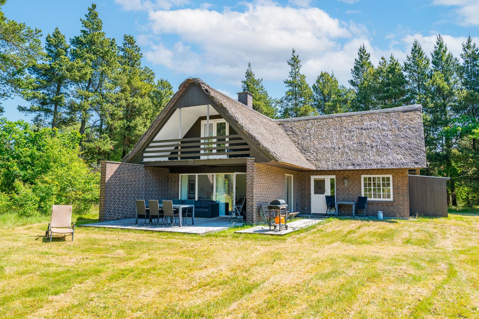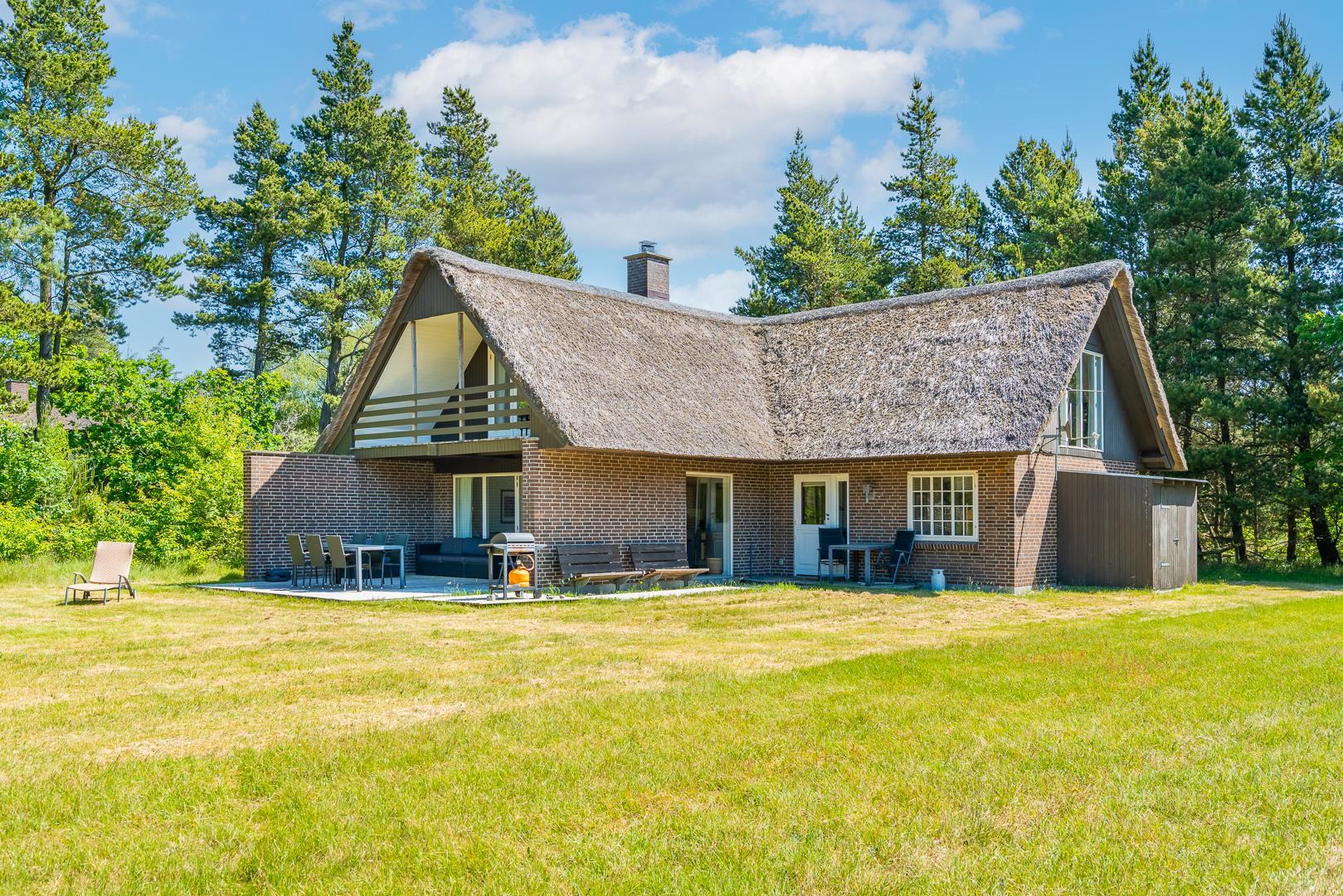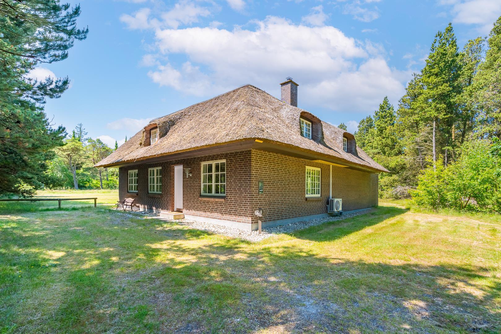 Så er dette stråtækte sommerhus i Houstrup det oplagte valg. Her får du 173 m² ægte dansk feriestemning – med brændeovn, gulvvarme, moderne faciliteter og en idyllisk placering mellem klitter, skov og Vesterhavet.