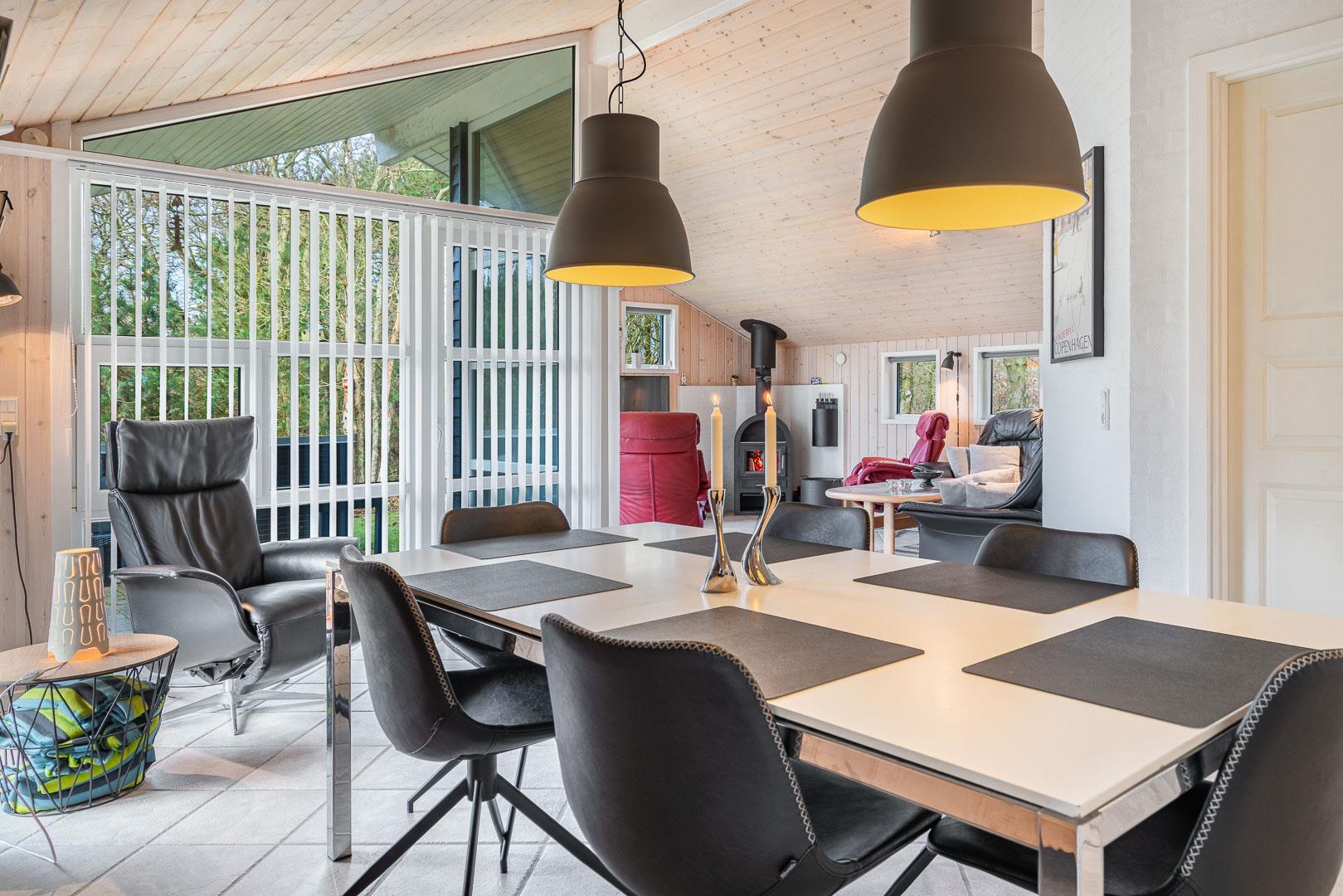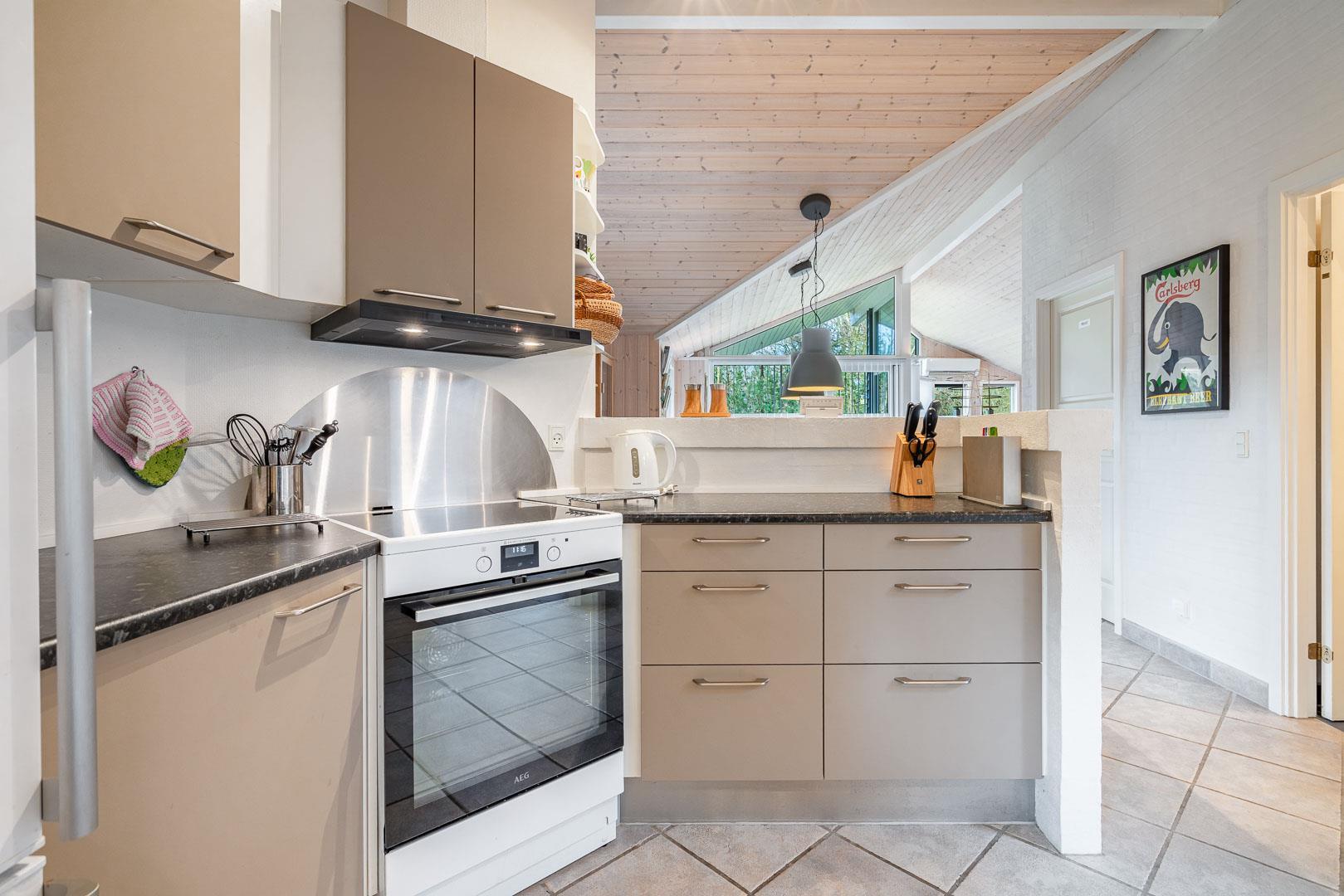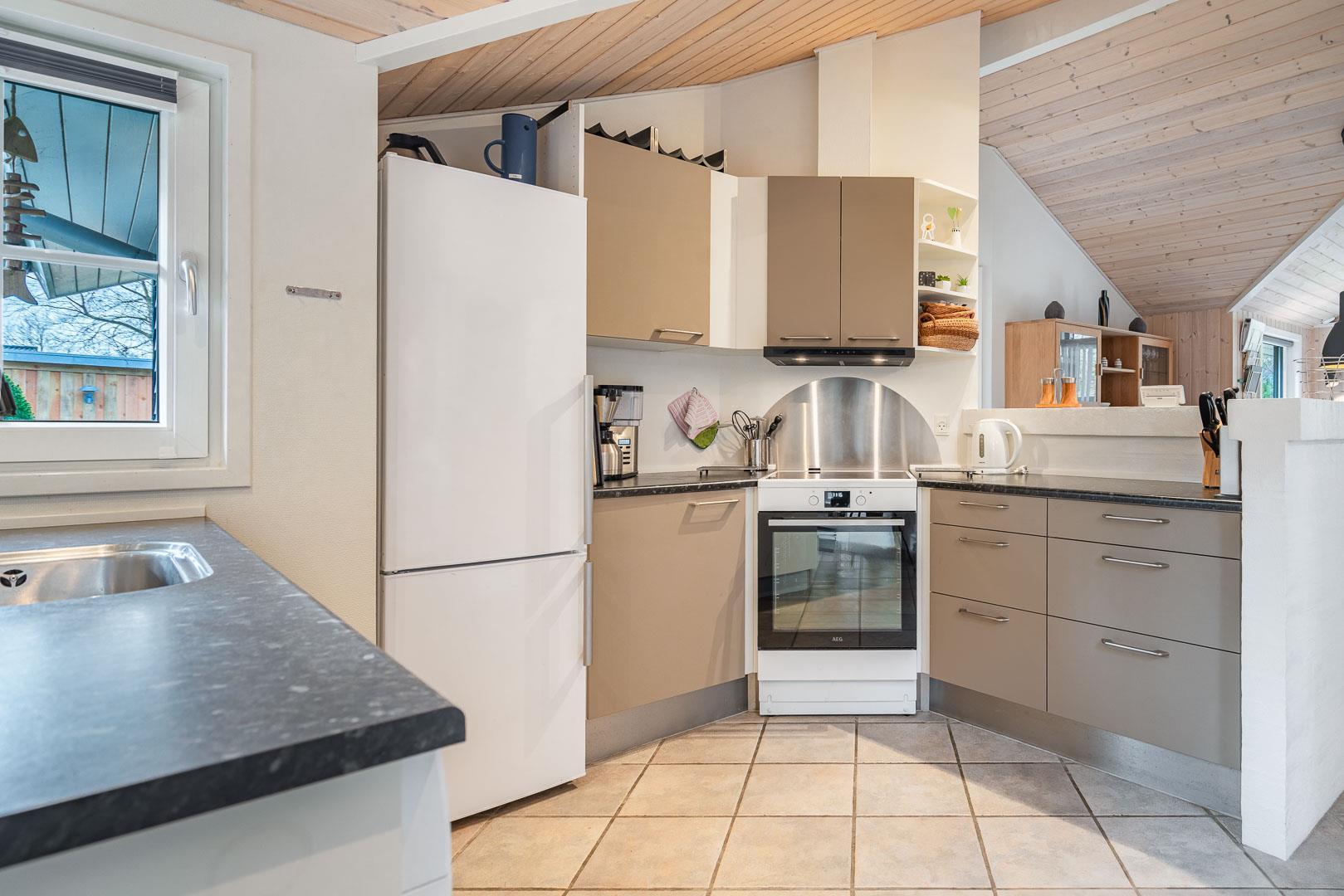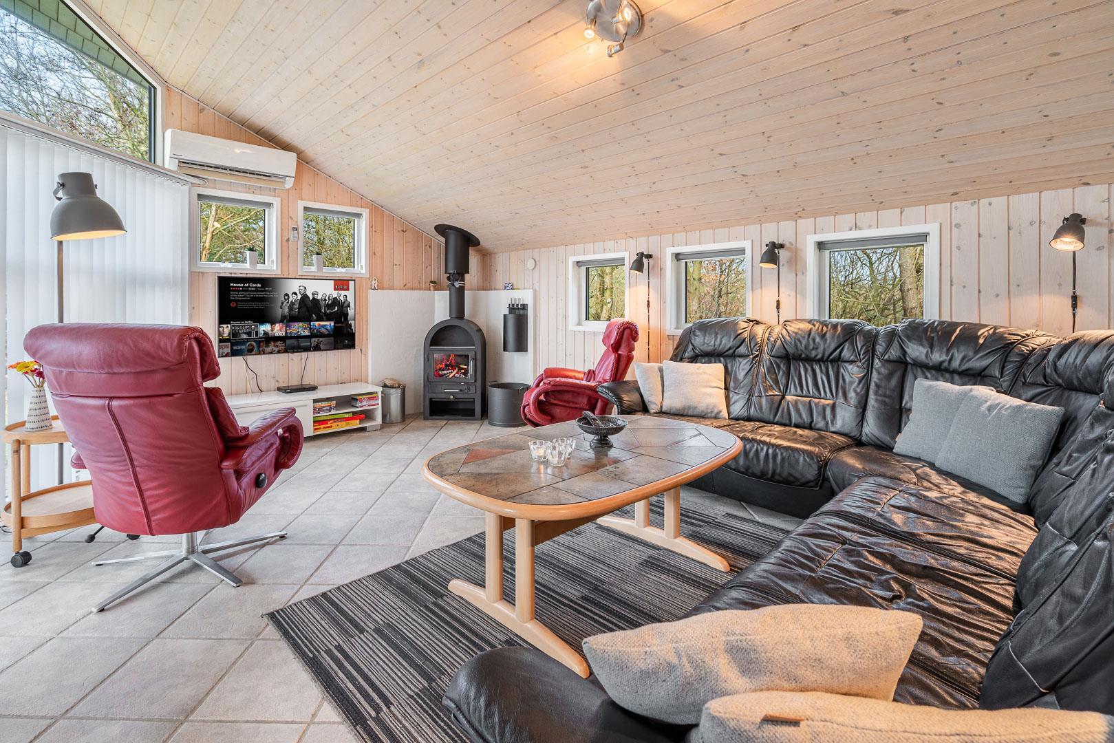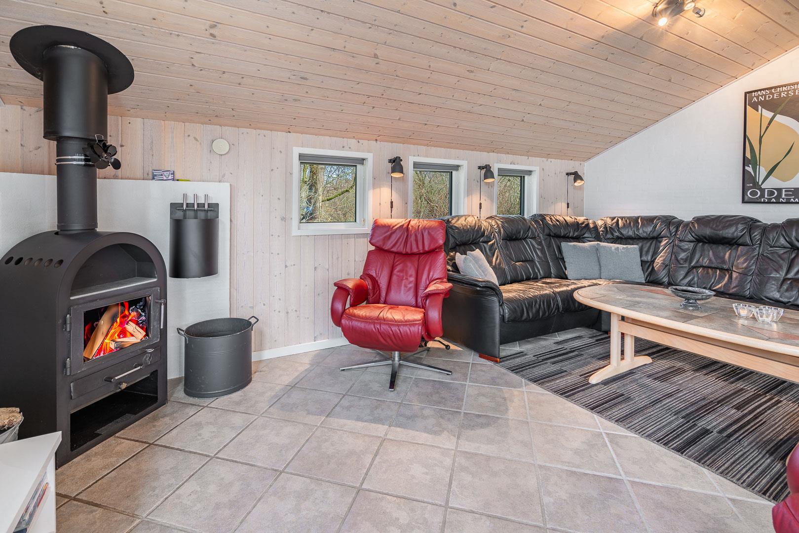 Feriehuset er udstyret med et dejligt køkken fra 2024, hvor madlavning bliver en fornøjelse. Stuen er indrettet med komfortable møbler, hvor hele familien kan samles. Brændeovnen og varmepumpen sørger for både hygge og varme, uanset årstiden.