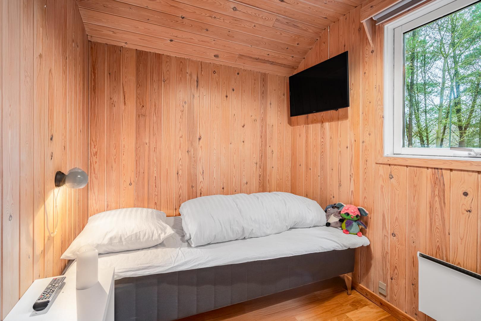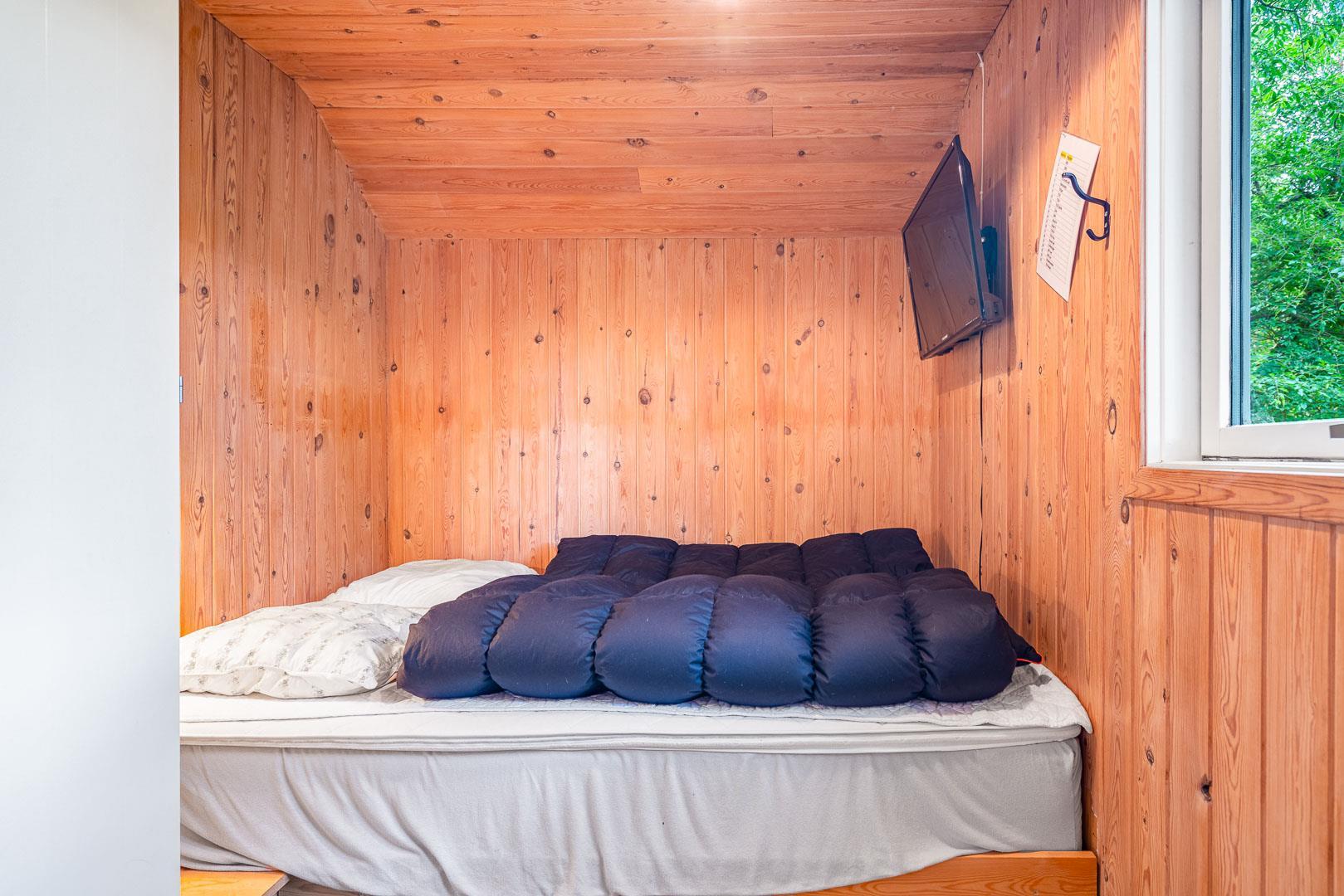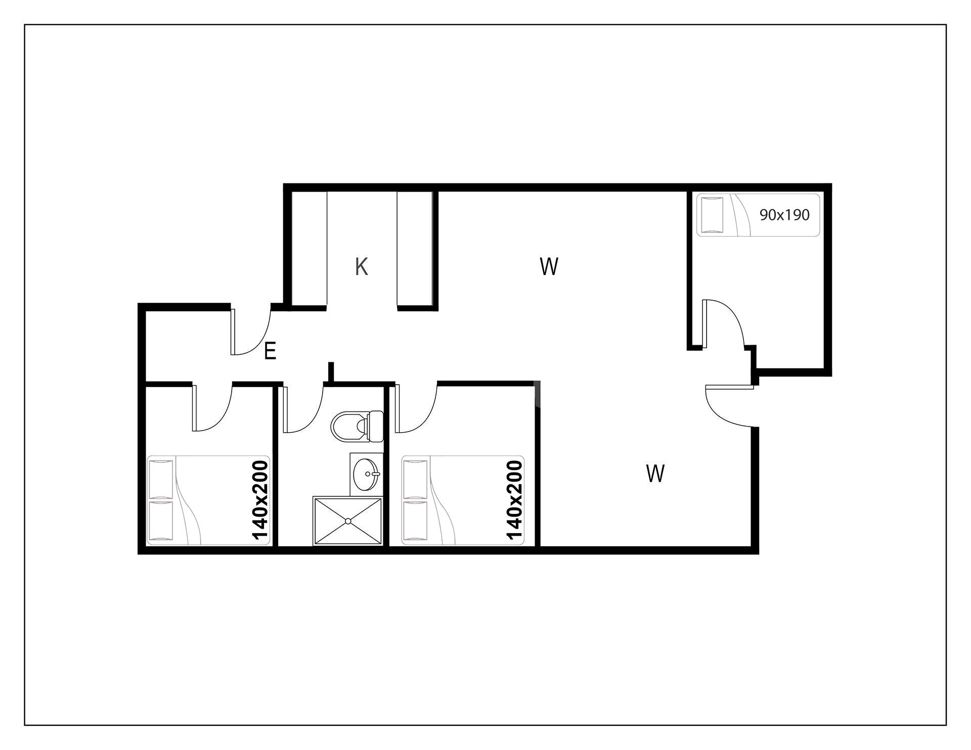 Sengestørrelse: 2 dobbeltsenge 140 x 200 cm + 1 enkeltseng 90 x 190 cm.