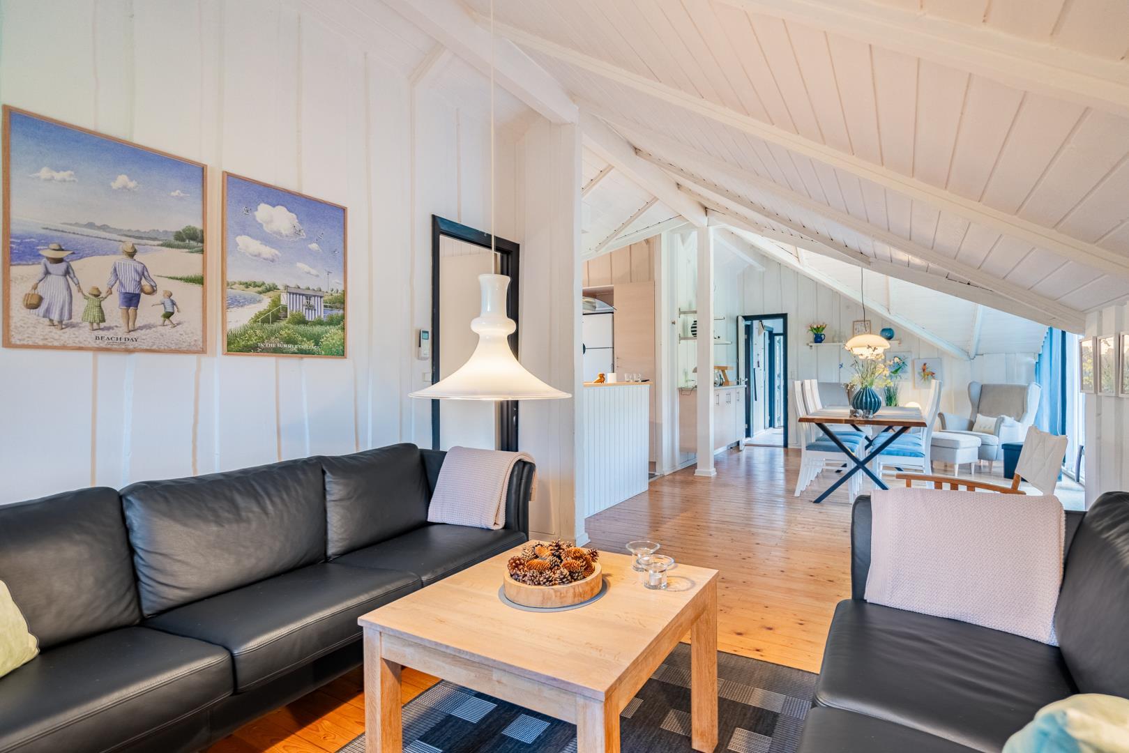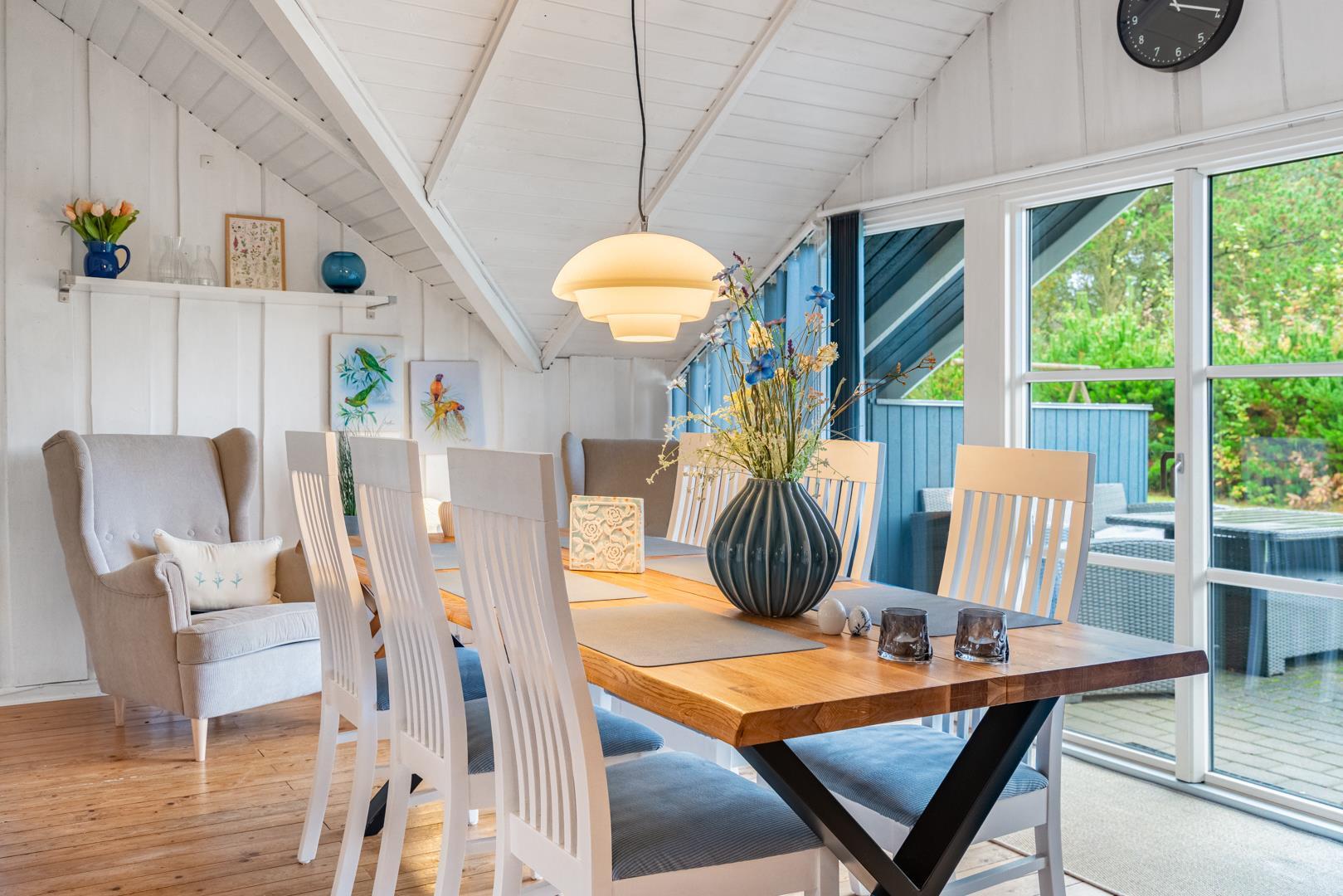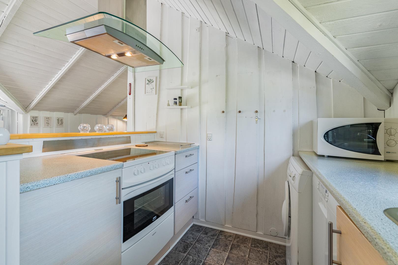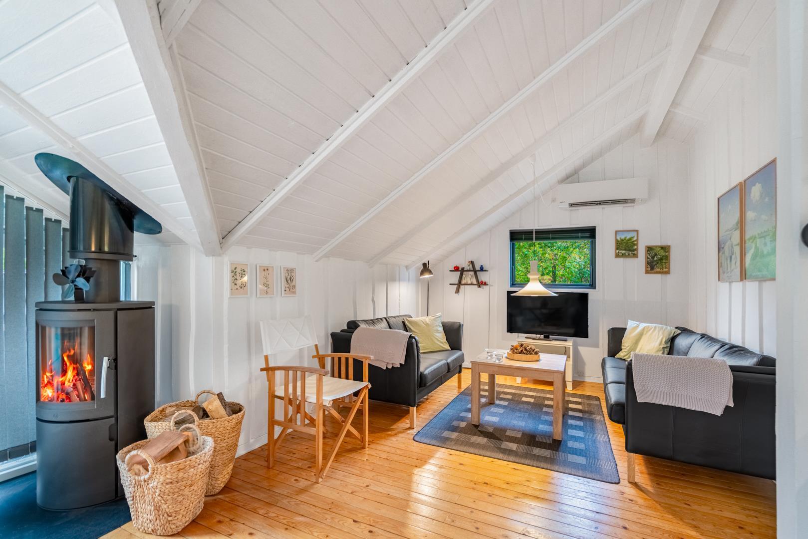 Huset fremstår meget velholdt og er smagfuldt indrettet. Det funktionelle køkken er udstyret med keramisk komfur, mikroovn og opvaskemaskine – og ligger i åben forbindelse med den lyse opholdsstue. Her er komfortable møbler og en brændeovn til hygge.