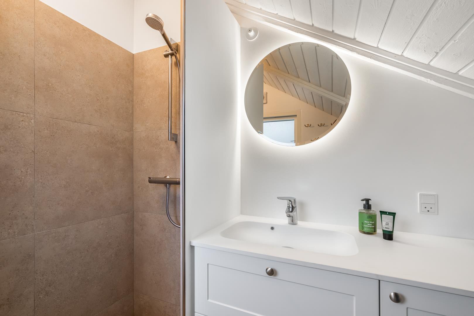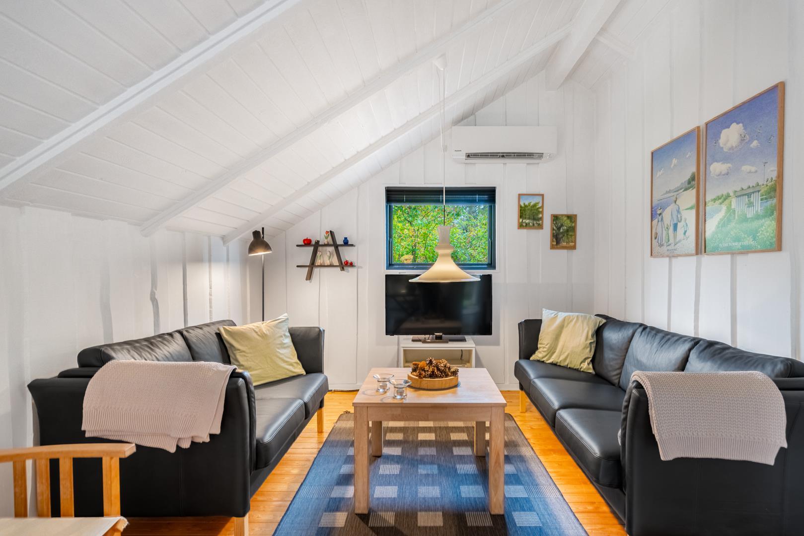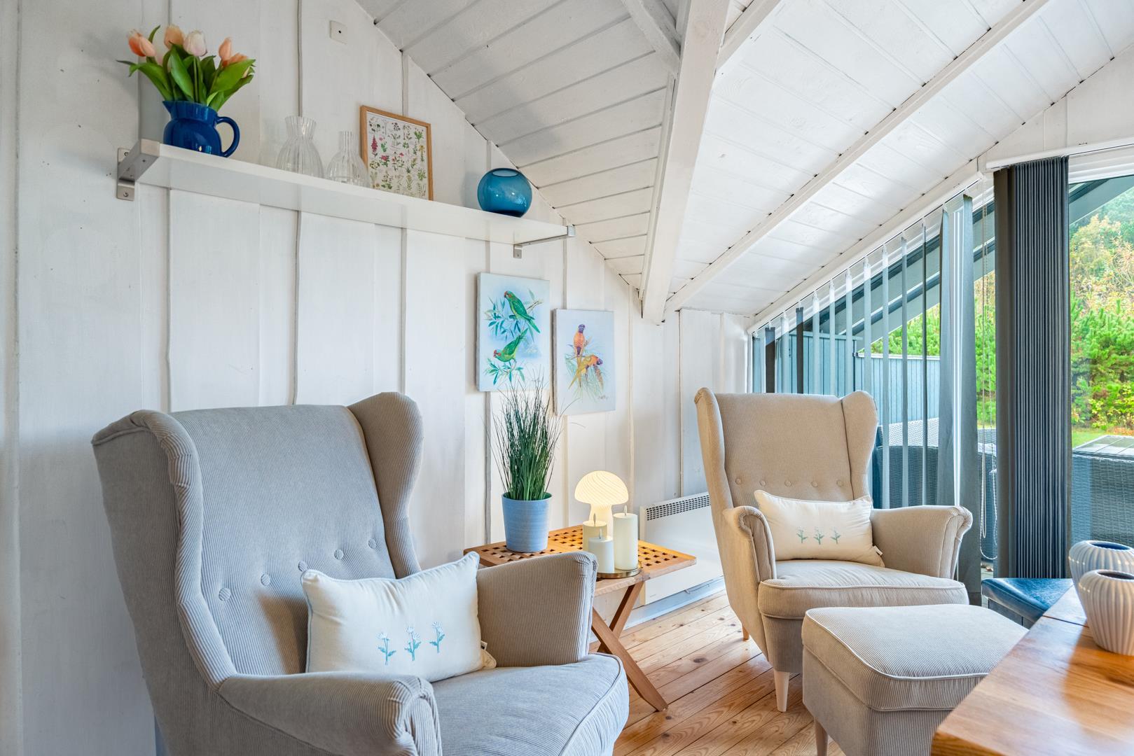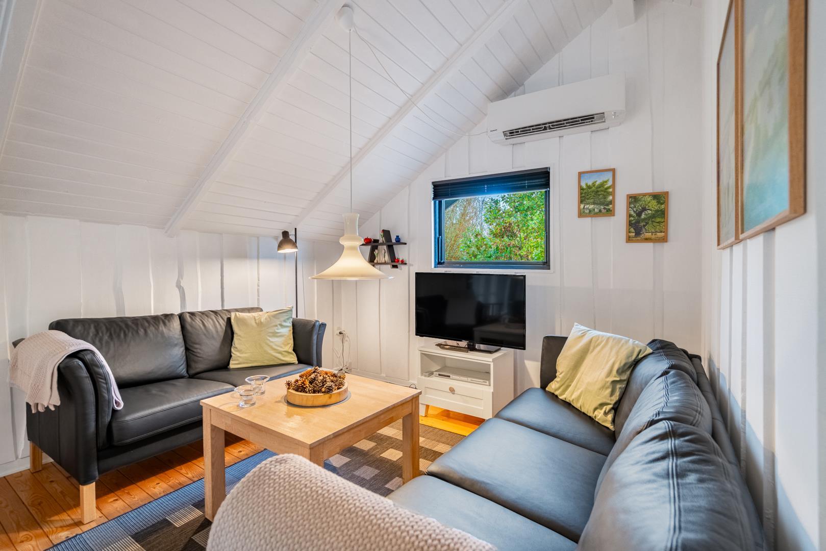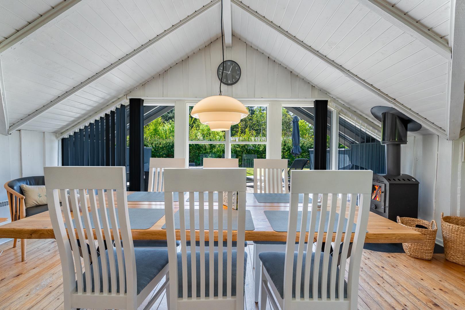 Huset fremstår meget velholdt og er smagfuldt indrettet. Det funktionelle køkken er udstyret med keramisk komfur, mikroovn og opvaskemaskine – og ligger i åben forbindelse med den lyse opholdsstue. Her er komfortable møbler og en brændeovn til hygge.