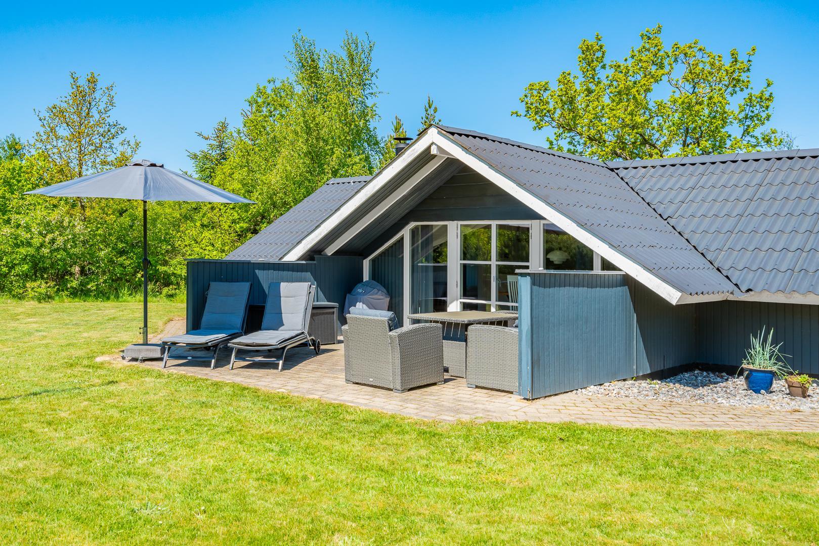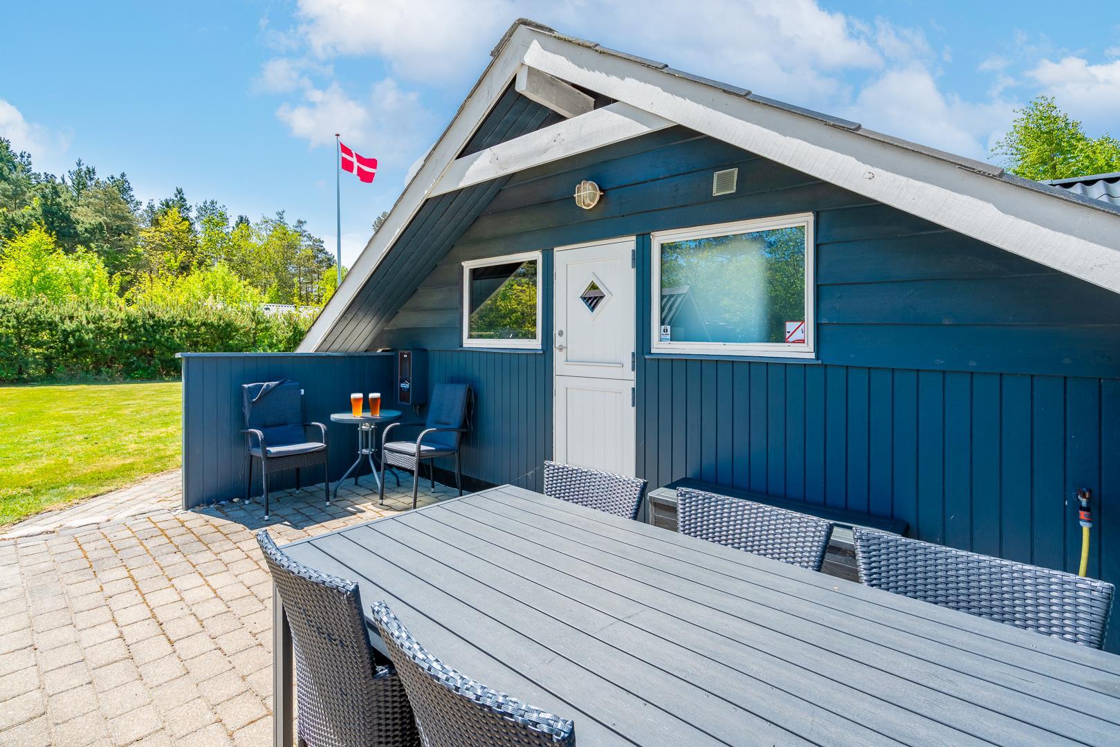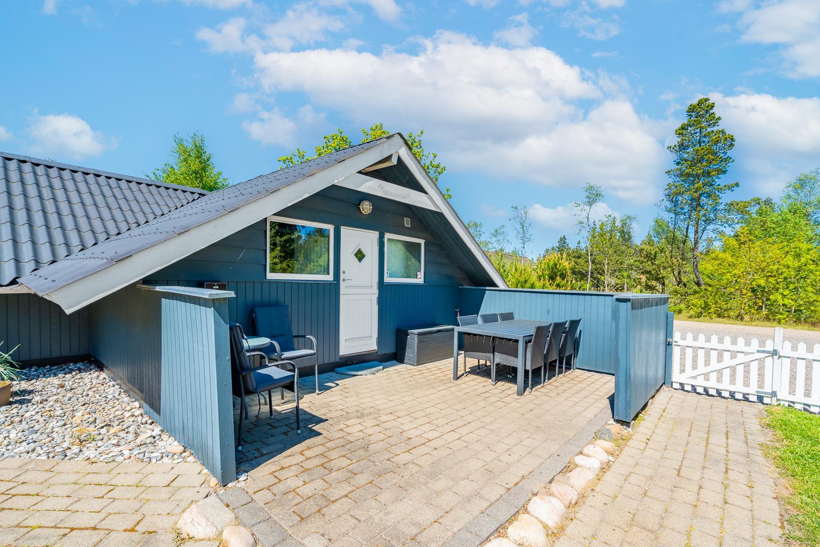 Dette indbydende feriehus i træ ligger på en dejlig, lukket naturgrund med græsplæne – omgivet af høje træer, der giver god læ og privatliv. Huset har hele tre solrige terrasser som er godt afskærmet – perfekte til både afslapning, måltider og udeliv. Grunden er indhegnet, så dine hunde kan færdes frit og sikkert.