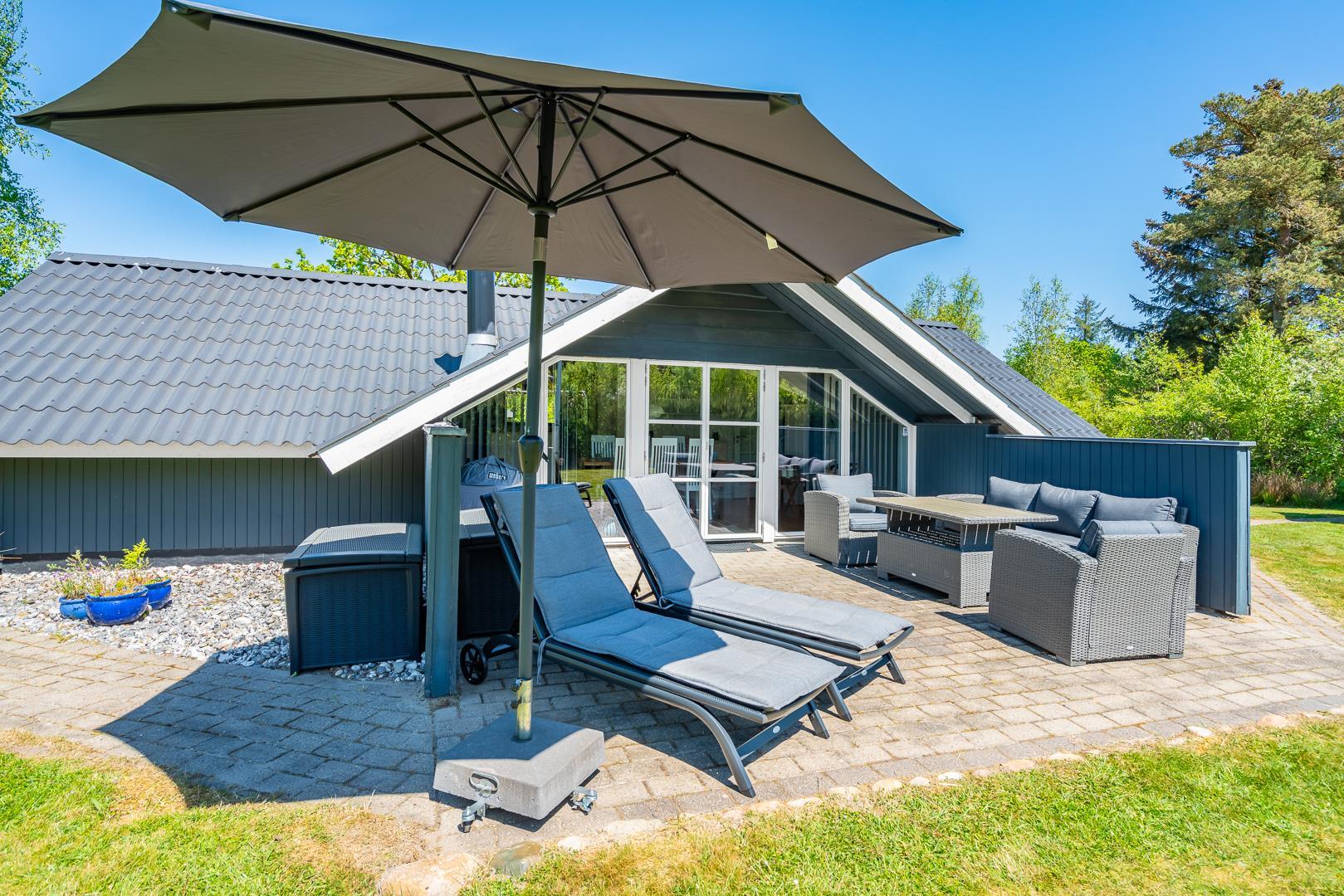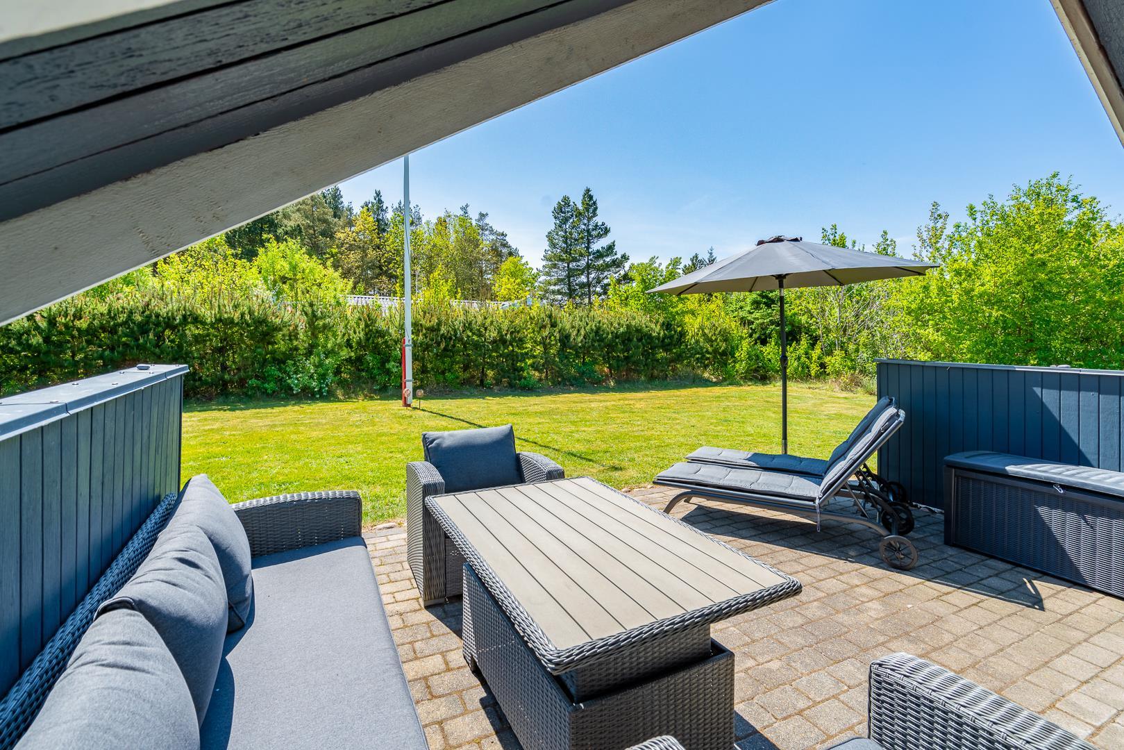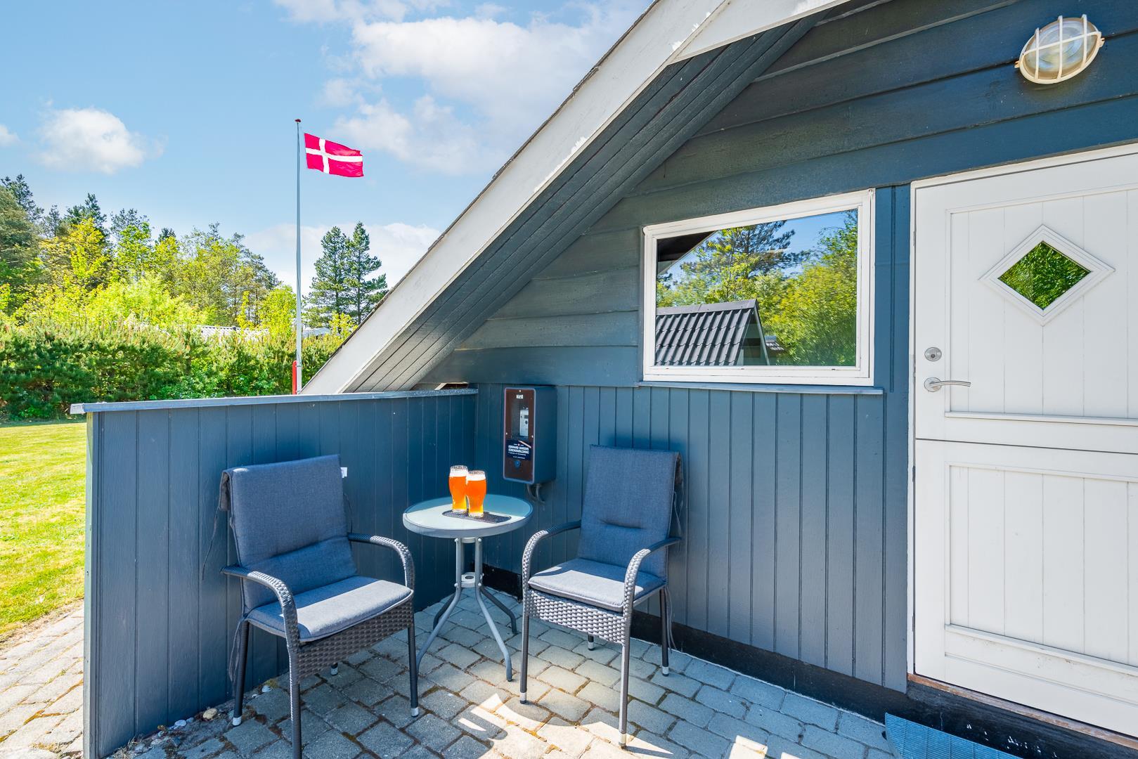 Dette indbydende feriehus i træ ligger på en dejlig, lukket naturgrund med græsplæne – omgivet af høje træer, der giver god læ og privatliv. Huset har hele tre solrige terrasser som er godt afskærmet – perfekte til både afslapning, måltider og udeliv. Grunden er indhegnet, så dine hunde kan færdes frit og sikkert.