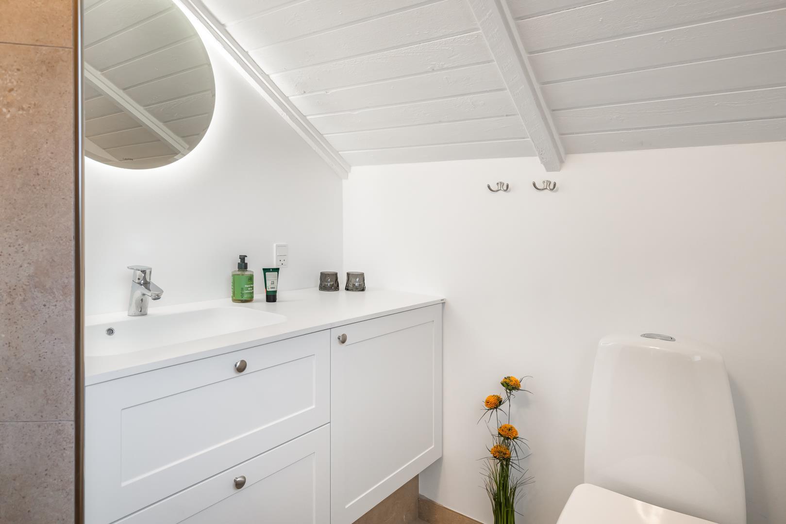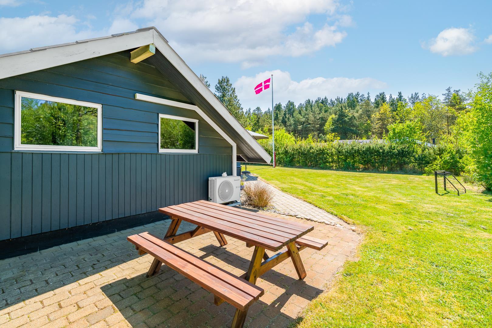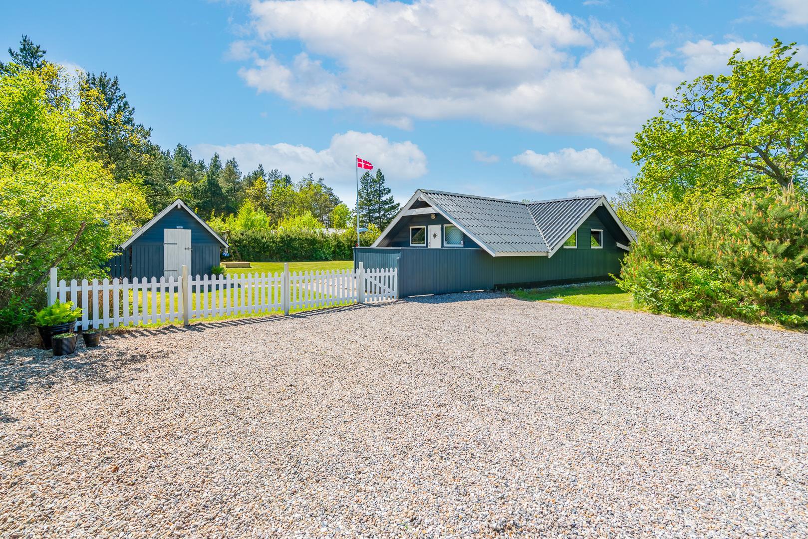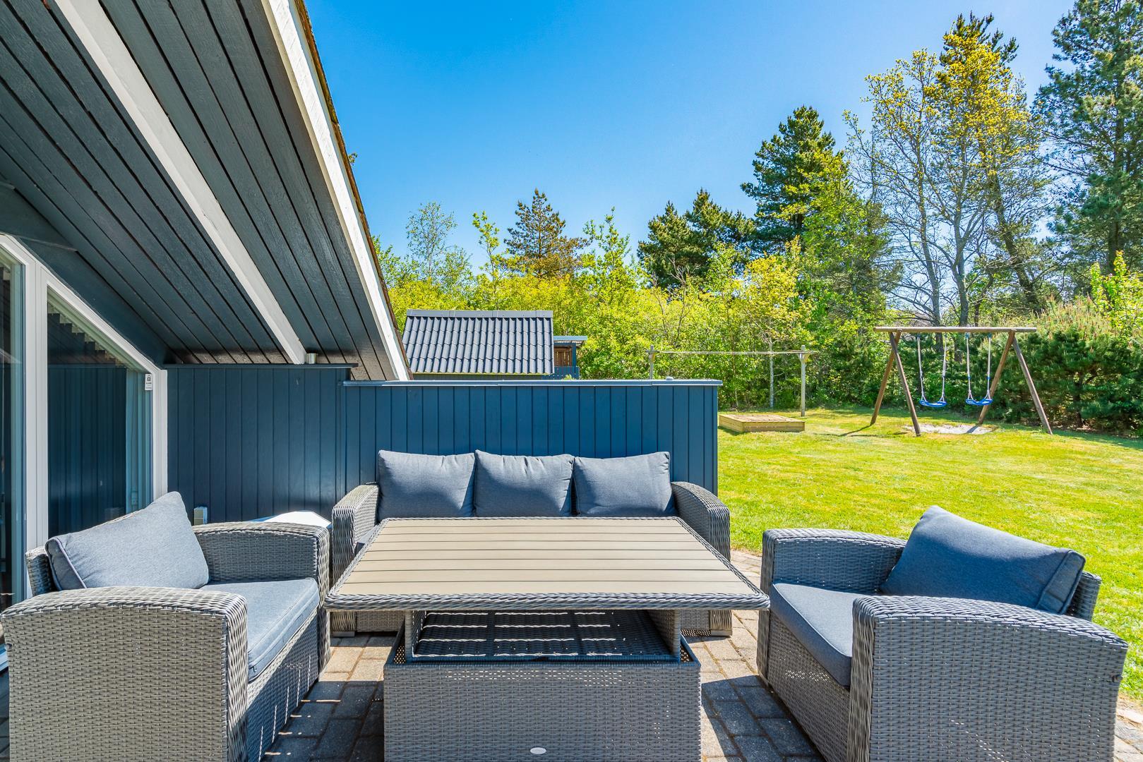 Kun tre minutters gang fra huset finder du en stor offentlig skovlegeplads – perfekt til børn og aktive familier. På den indhegnede grund er der også gynge og sandkasse til de mindste gæster. Dette feriehus er et oplagt valg for jer, der ønsker en afslappende ferie i rolige, naturskønne omgivelser – med plads til både børn og hunde.
