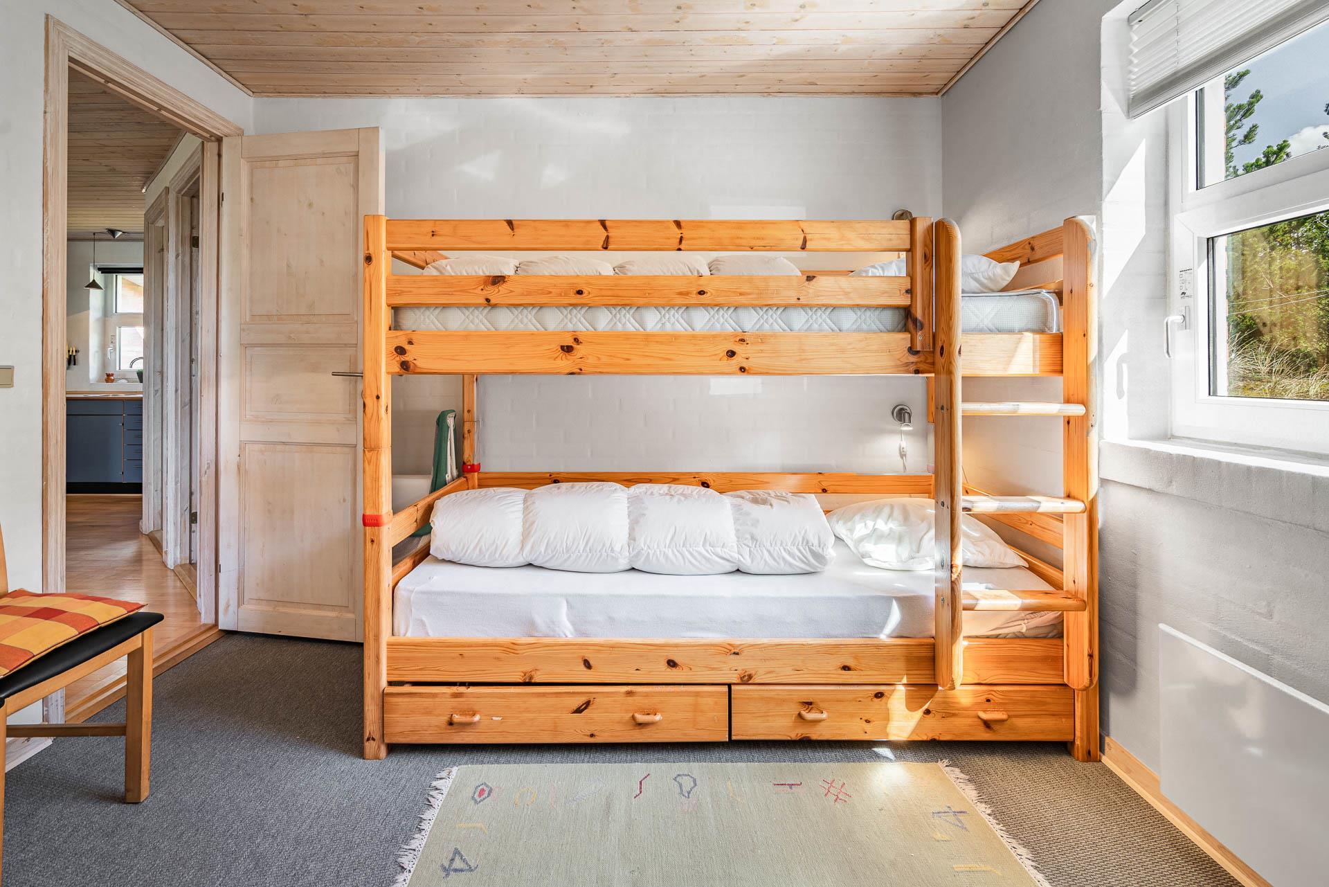 Sengestørrelser: 2 dobbeltsenge 180 x 200 cm + 1 køjeseng 90 x 200 cm.