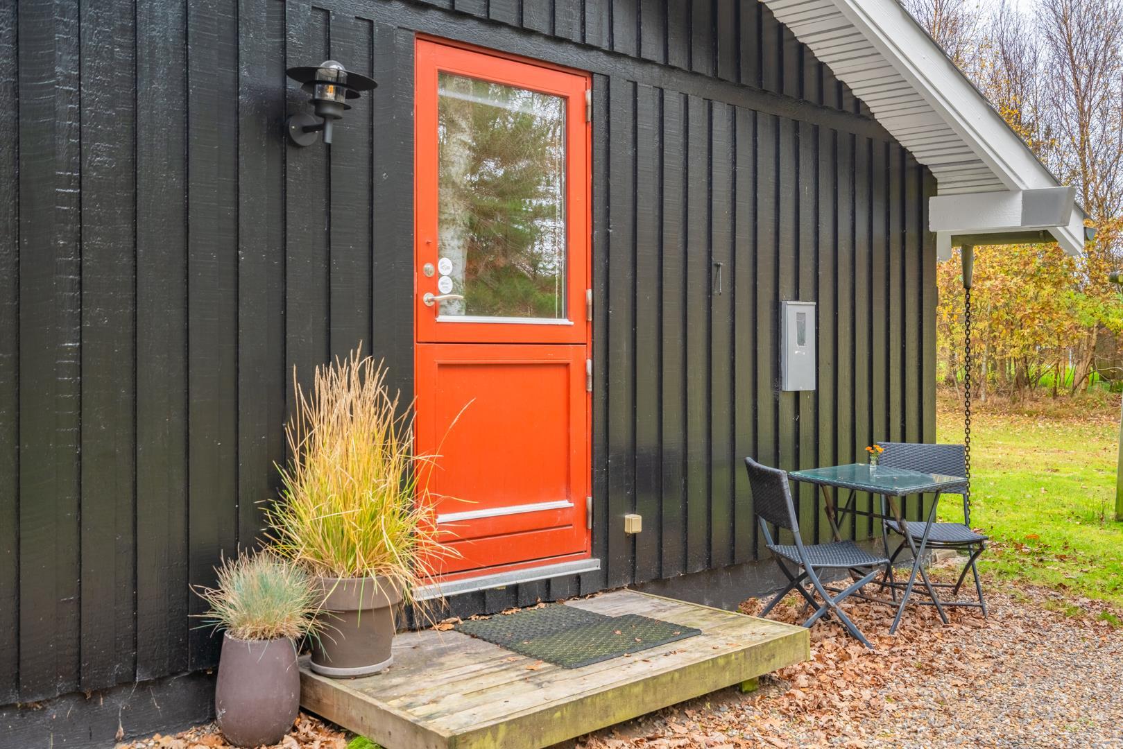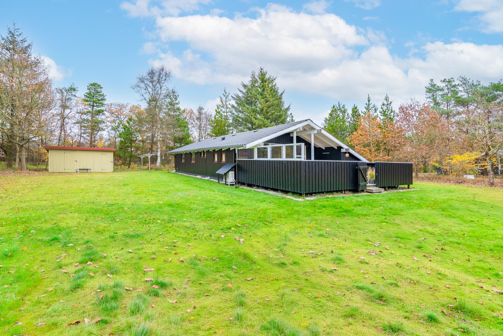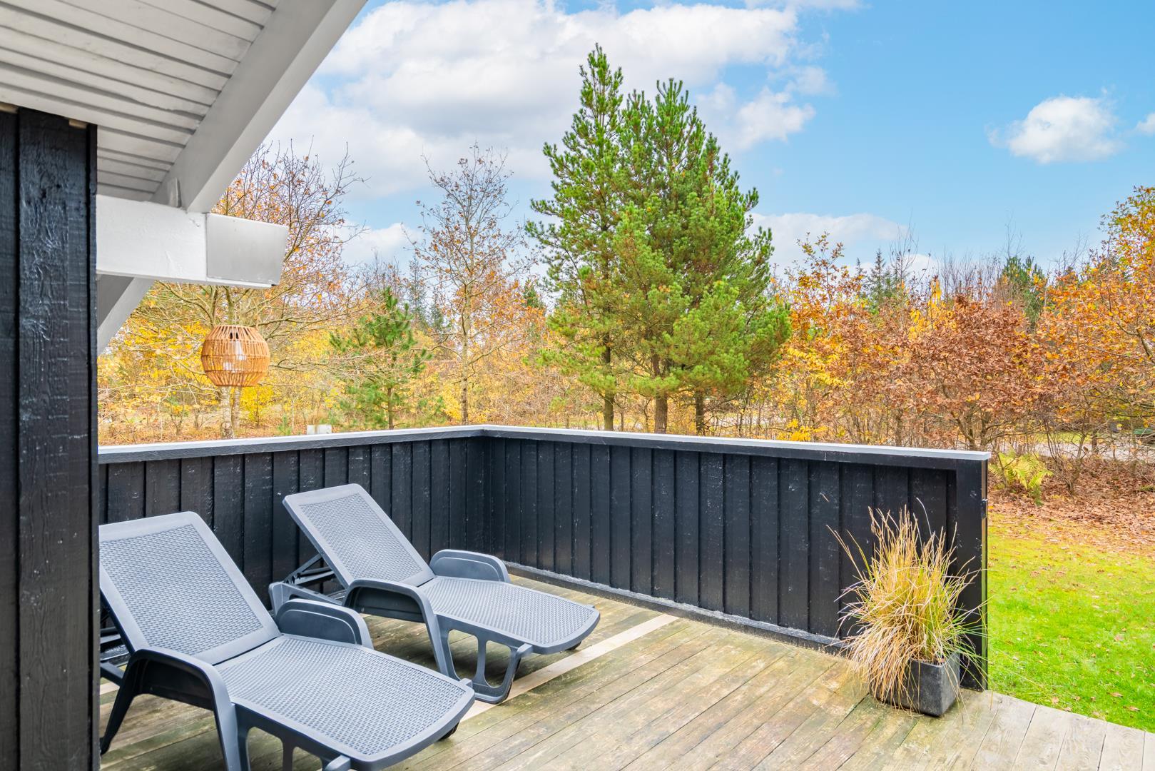 Fra stuen er der udgang til en stor træterrasse med delvis overdækning, liggestole og havemøbler – perfekt til udeliv hele dagen. Grunden er ideel til leg og afslapning i trygge omgivelser. Området omkring Houstrup byder på gode gåture og masser af natur lige uden for døren - og Henne Strand ligger kun 15 minutters kørsel derfra.