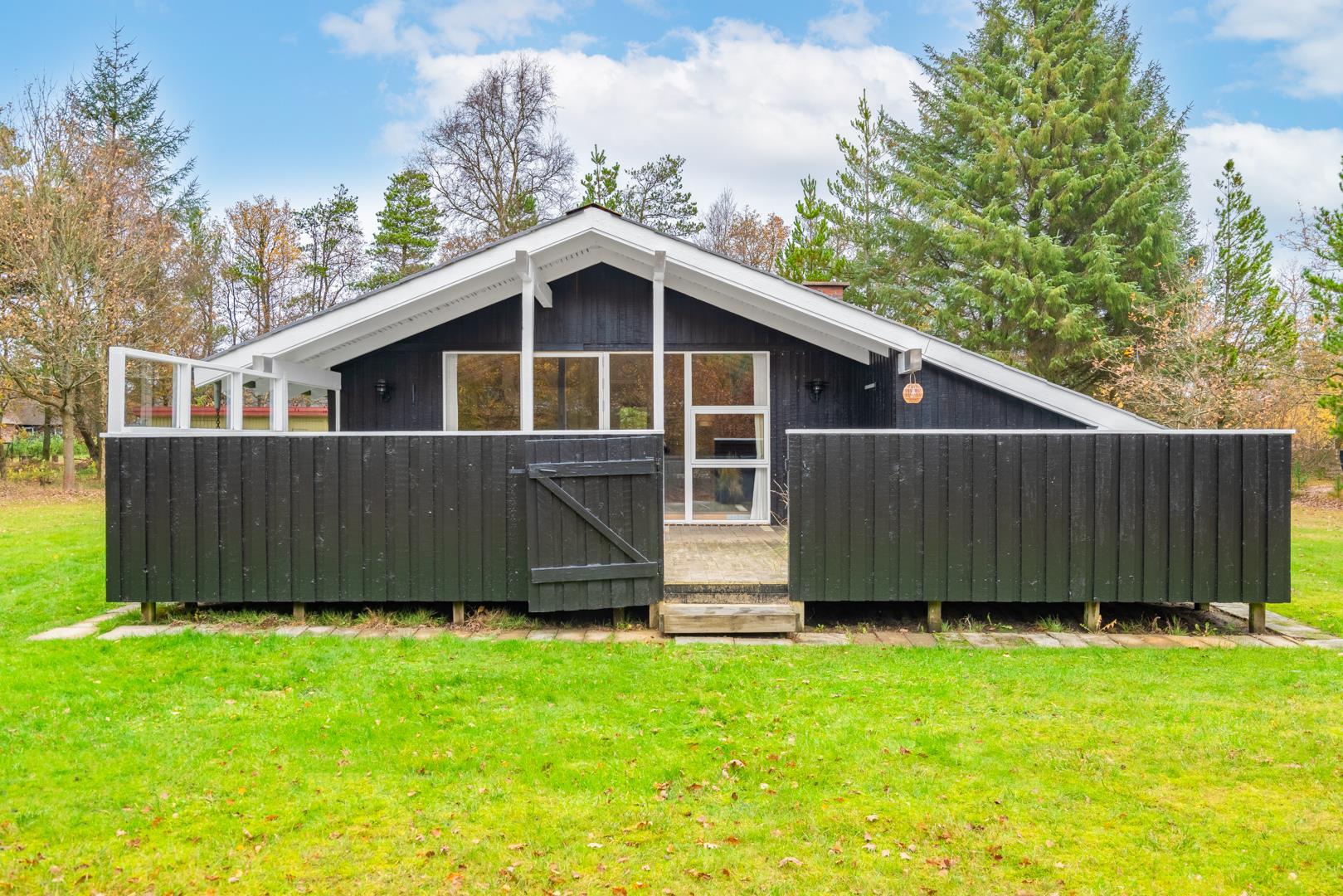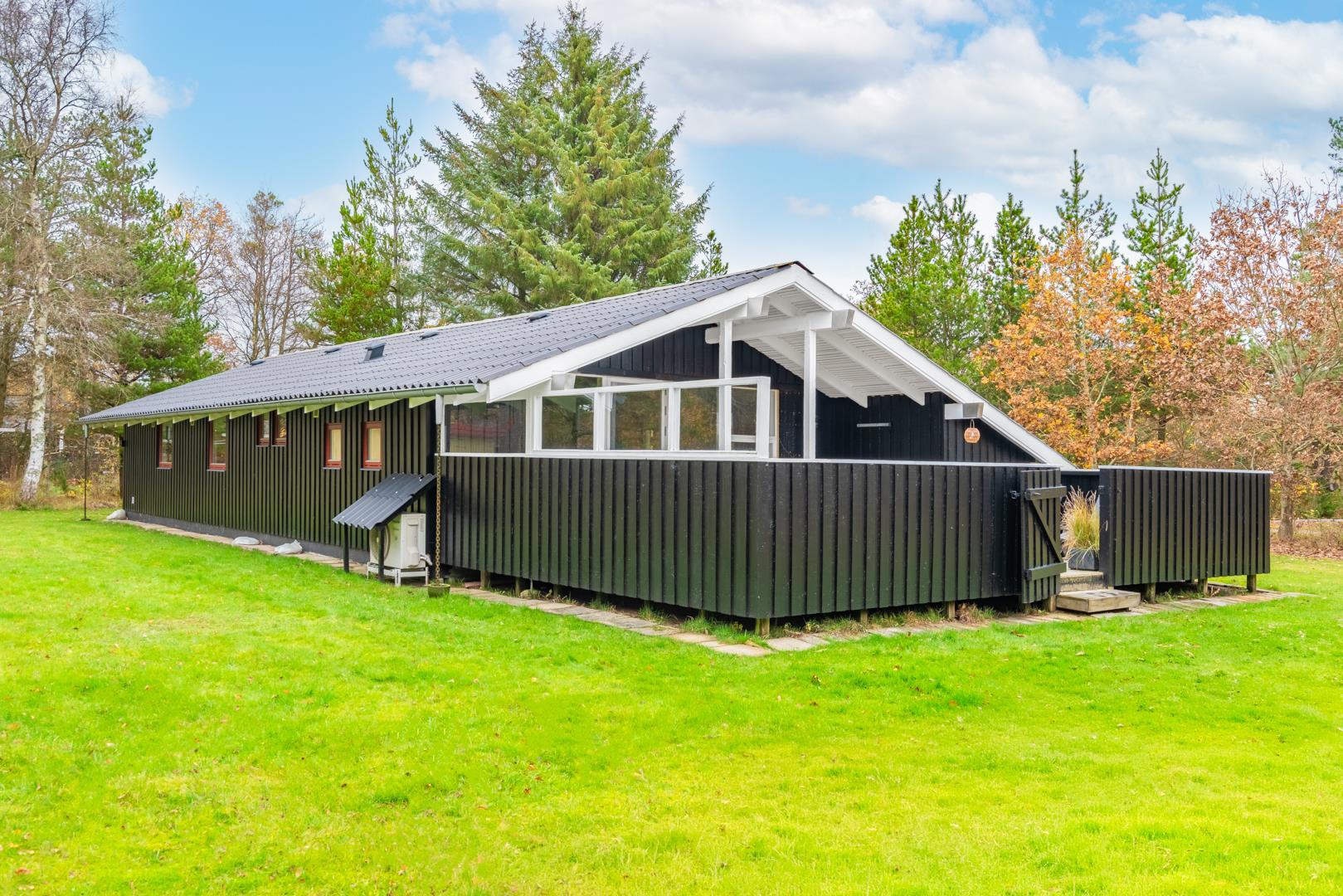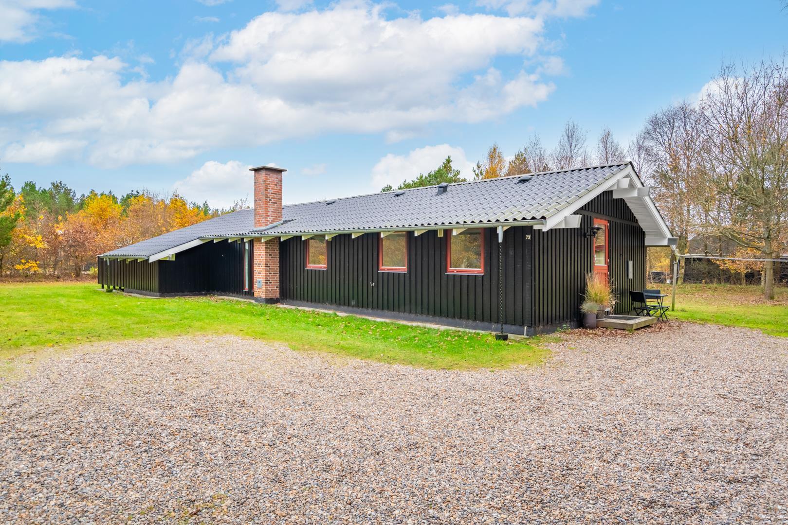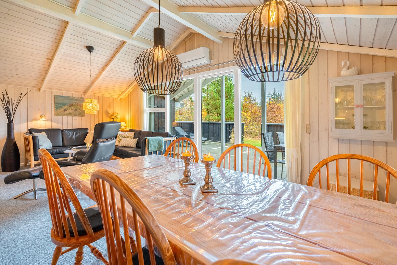 Fra stuen er der udgang til en stor træterrasse med delvis overdækning, liggestole og havemøbler – perfekt til udeliv hele dagen. Grunden er ideel til leg og afslapning i trygge omgivelser. Området omkring Houstrup byder på gode gåture og masser af natur lige uden for døren - og Henne Strand ligger kun 15 minutters kørsel derfra.