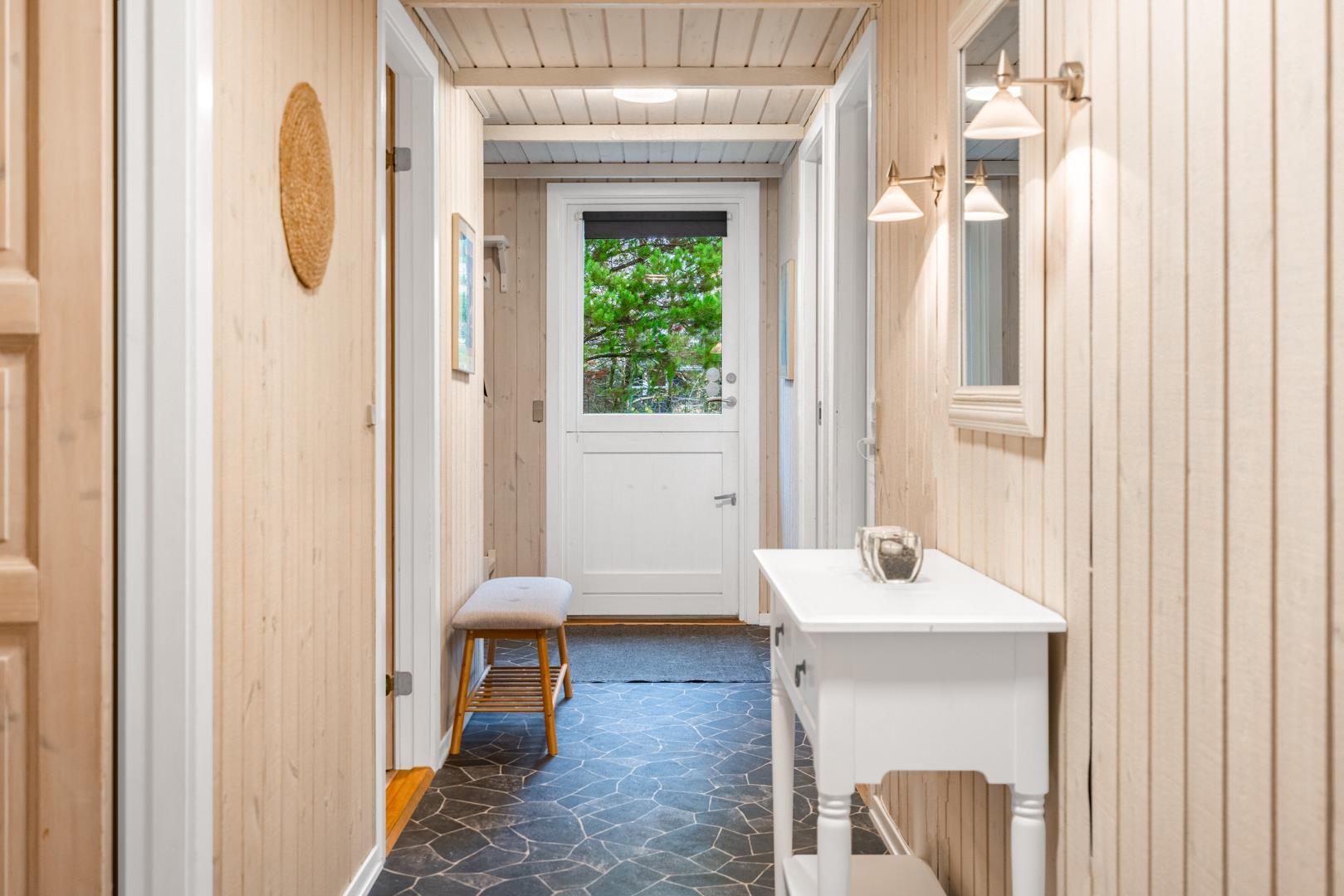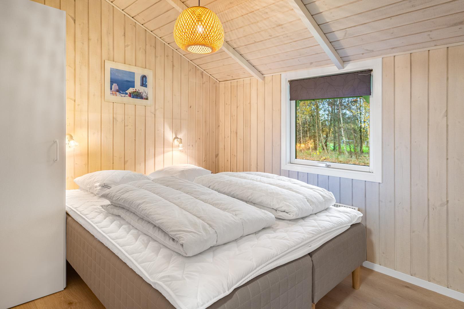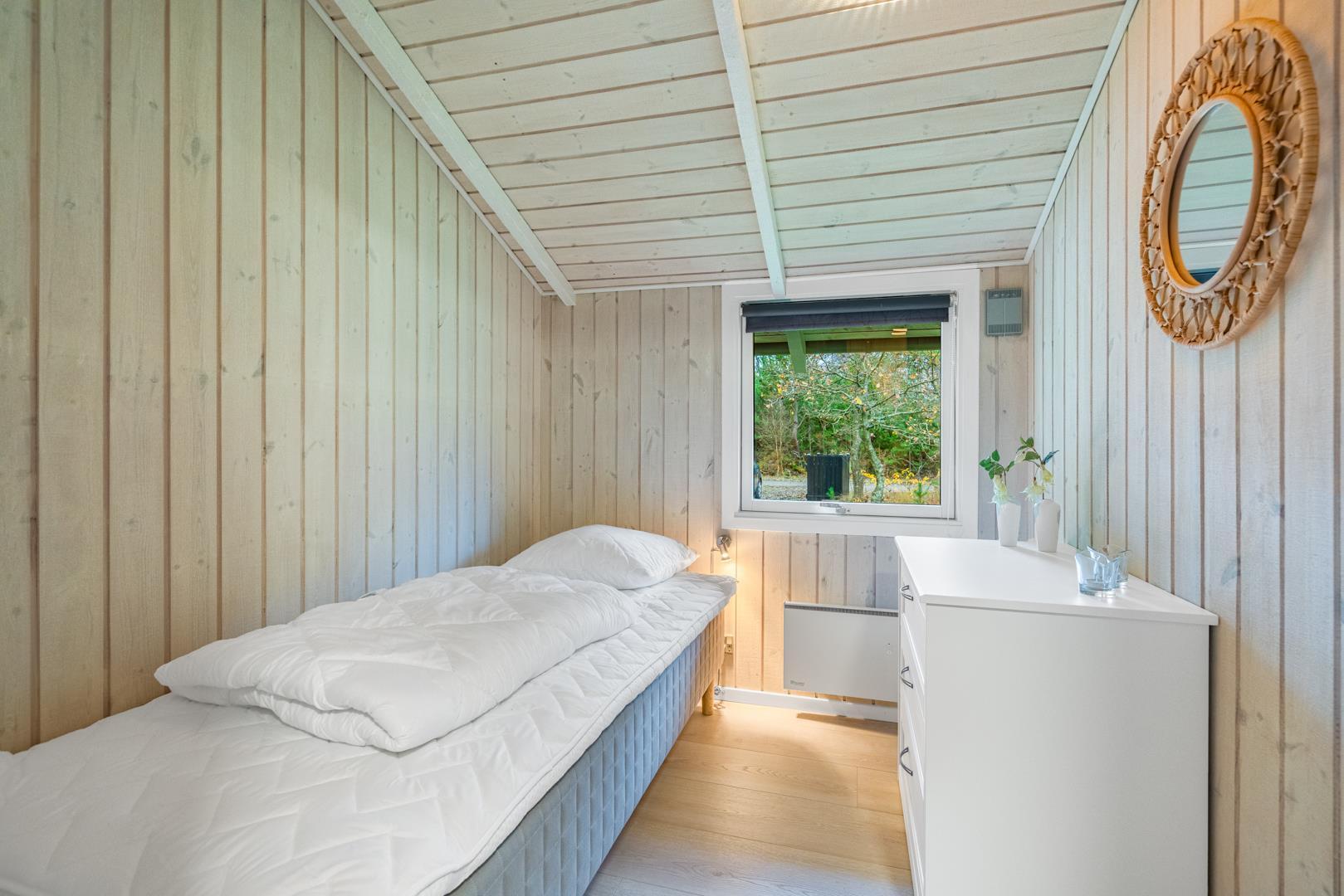 Dette hyggelige sommerhus ligger fredeligt på en dejligt naturgrund med græsplæne – oplagt til familier med børn. Huset byder på en god planløsning med fire soveværelser: to med dobbeltseng, ét med enkeltseng og ét med køjeseng. Alle rum fremstår lyse, venlige og funktionelle.