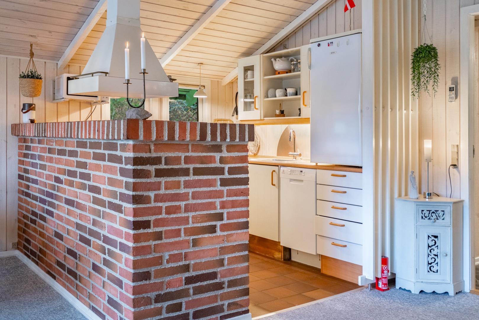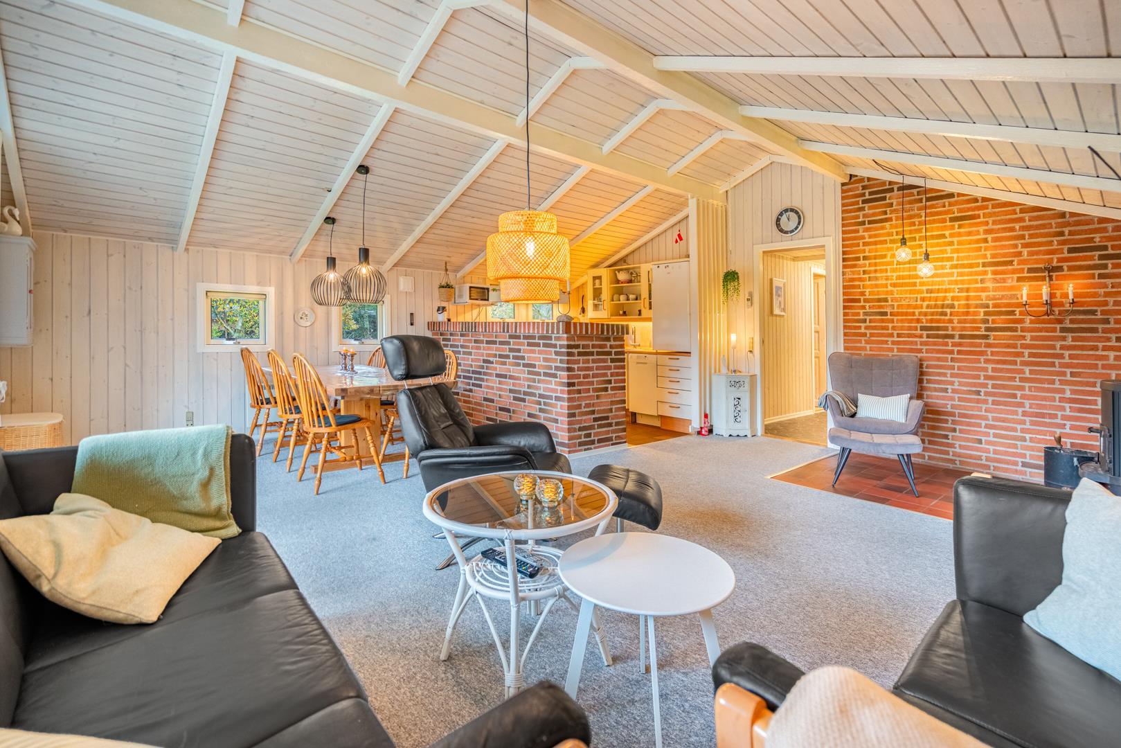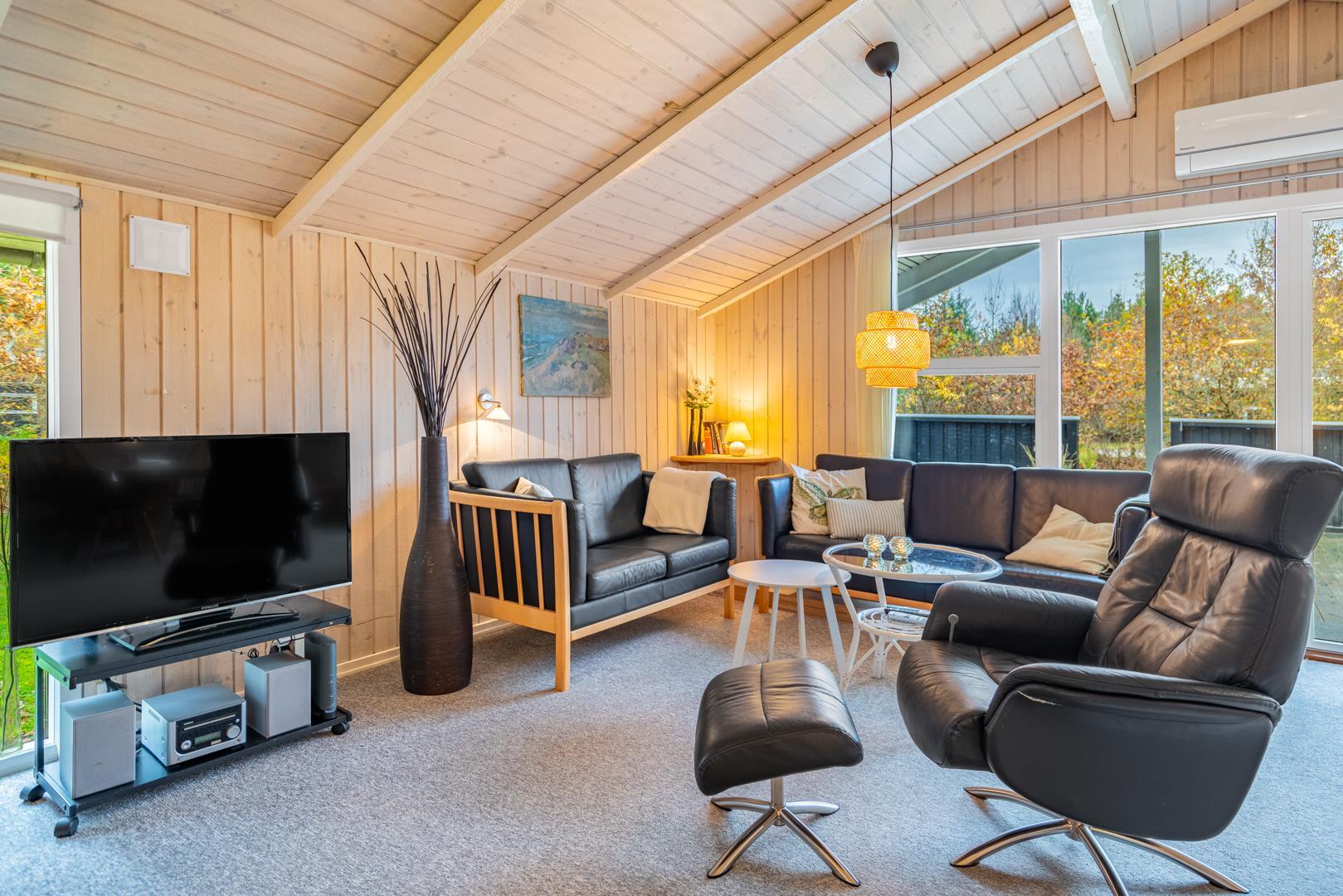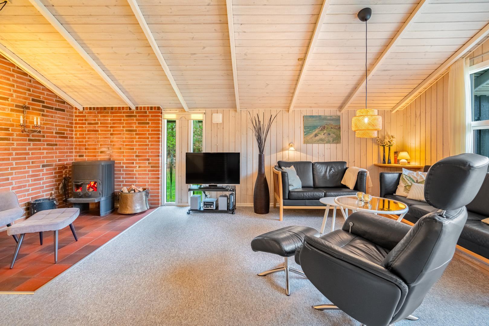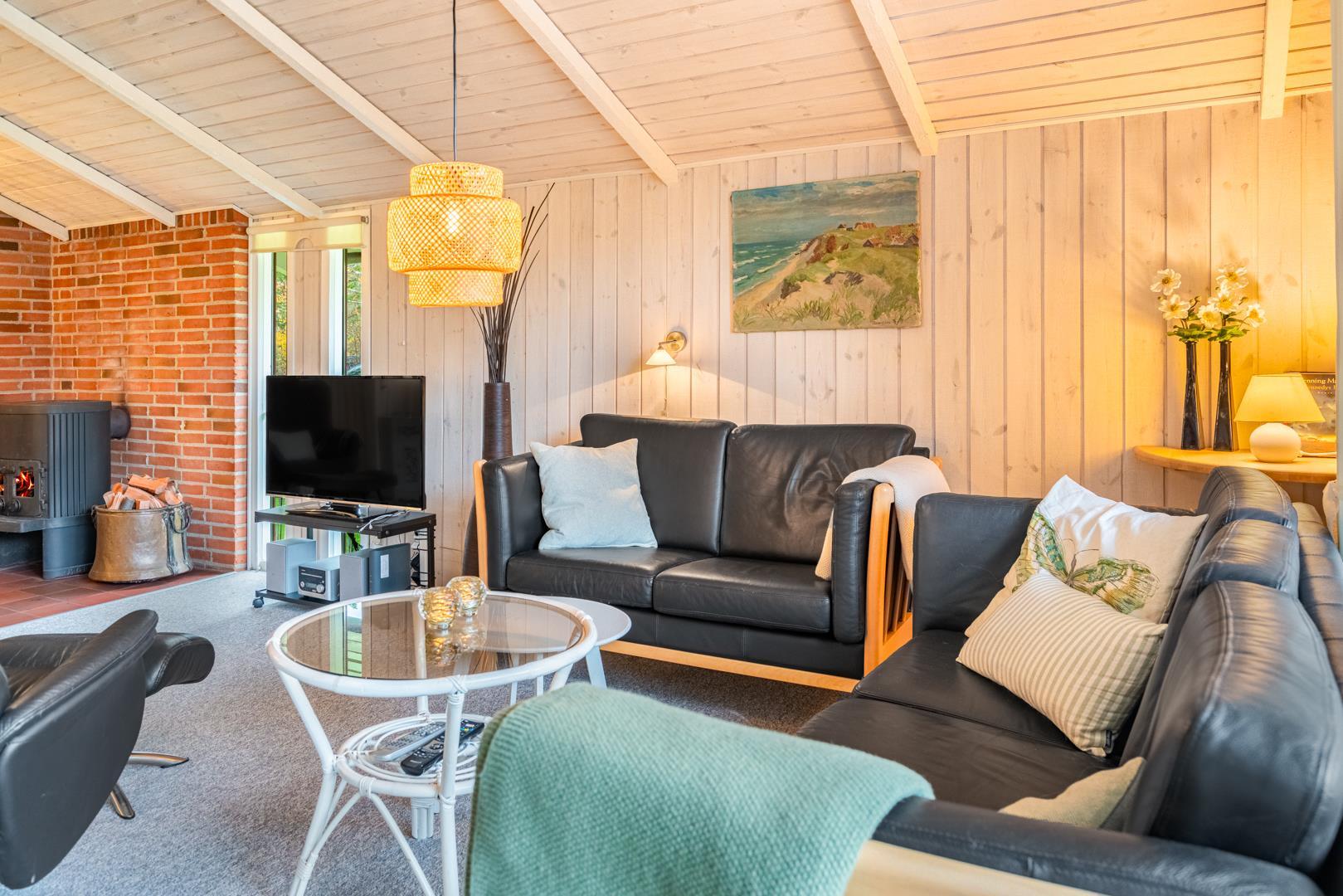 Opholdsstuen rummer sofaområde, spiseplads og tv – med brændeovn som hyggelig varmekilde. Desuden bidrager en luft-til-luft varmepumpe til at holde strømomkostninger ned. Køkkenet er åbent og veludstyret med bl.a. opvaskemaskine, mikroovn og fryser. Store vinduespartier giver masser af dagslys og en afslappet stemning. Badeværelset er funktionelt og har bruseniche samt adgang til husets sauna.