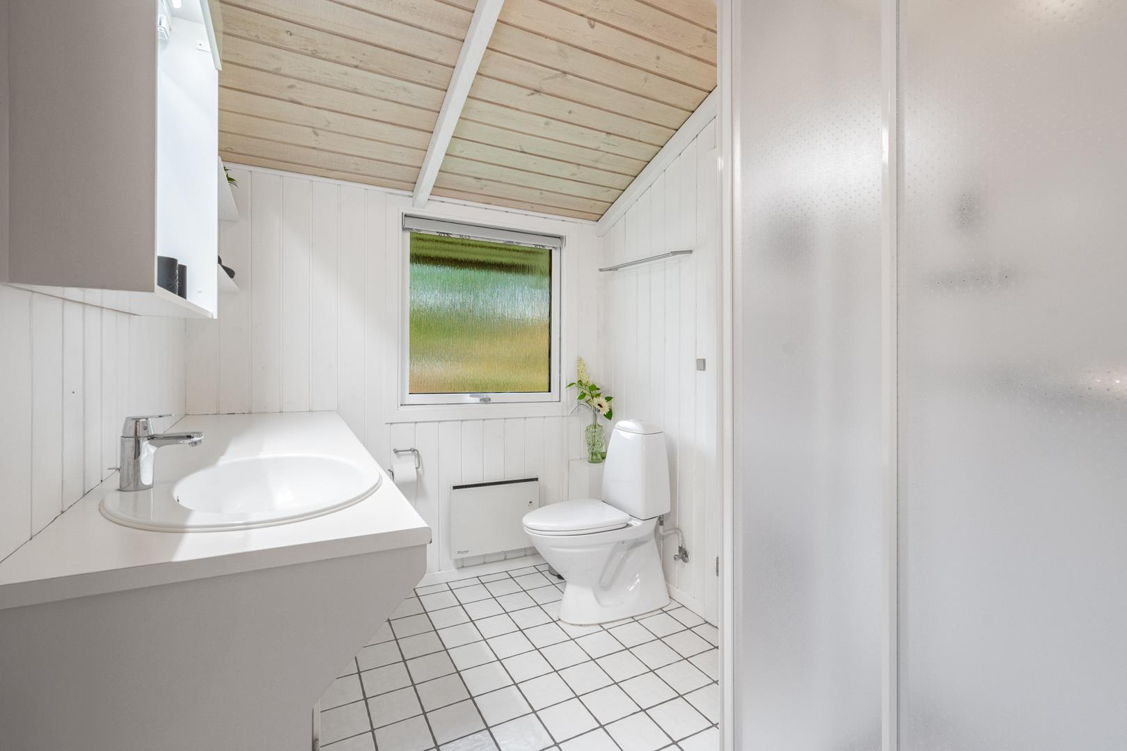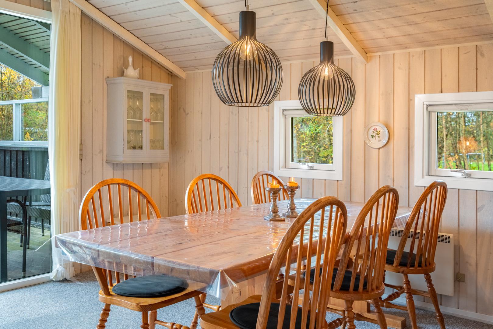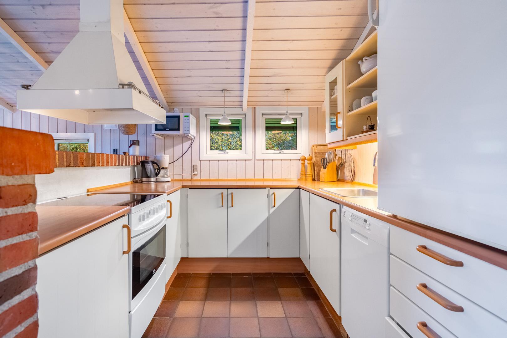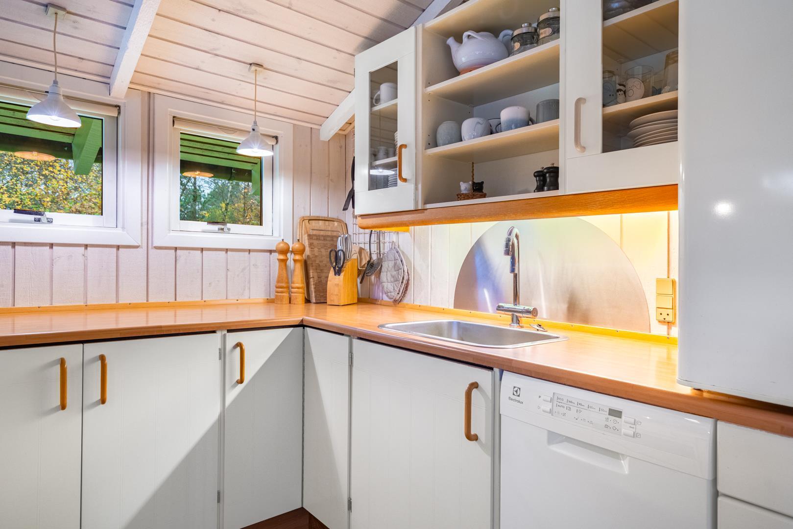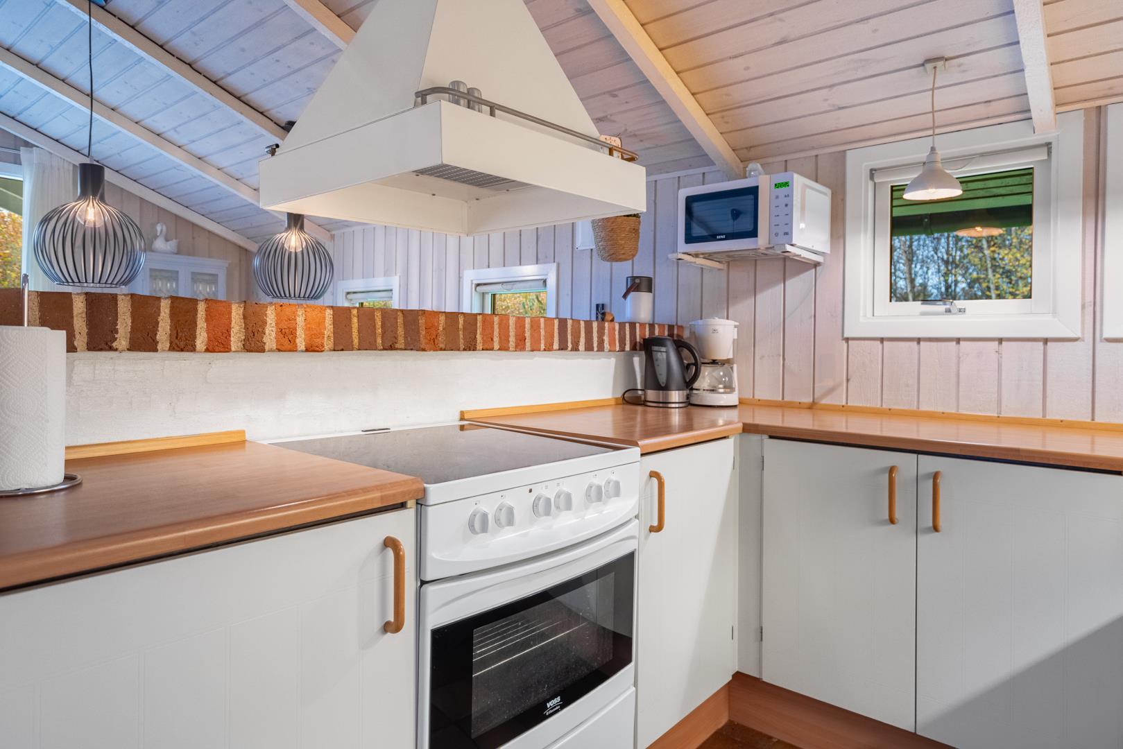 Opholdsstuen rummer sofaområde, spiseplads og tv – med brændeovn som hyggelig varmekilde. Desuden bidrager en luft-til-luft varmepumpe til at holde strømomkostninger ned. Køkkenet er åbent og veludstyret med bl.a. opvaskemaskine, mikroovn og fryser. Store vinduespartier giver masser af dagslys og en afslappet stemning. Badeværelset er funktionelt og har bruseniche samt adgang til husets sauna.