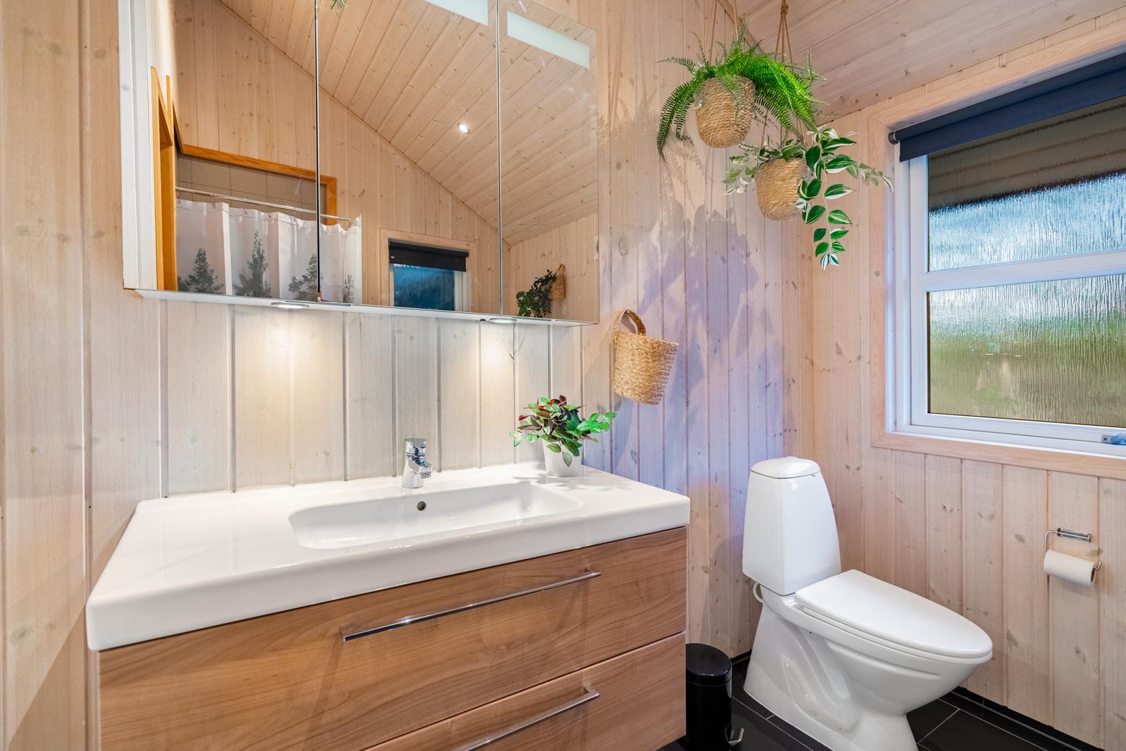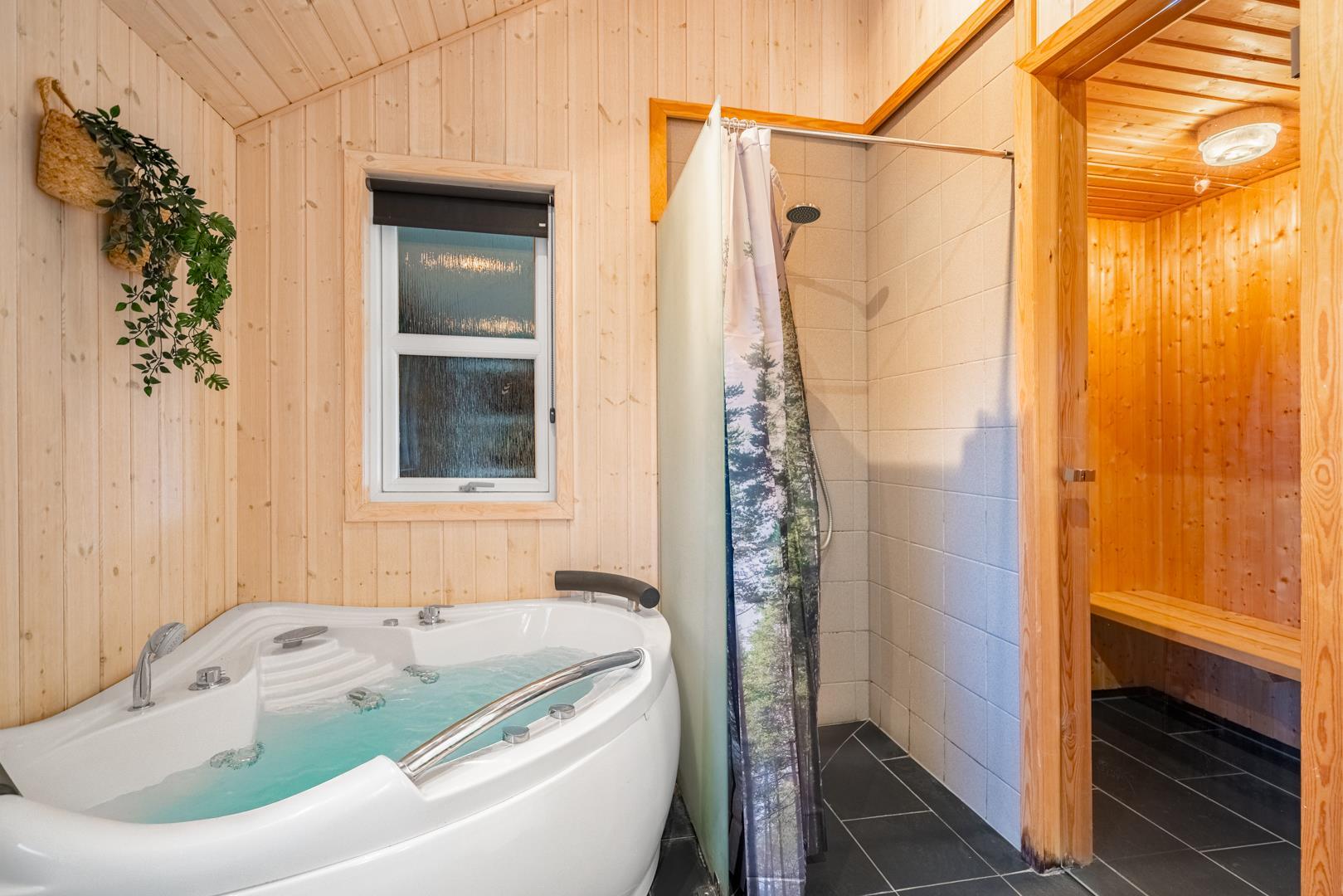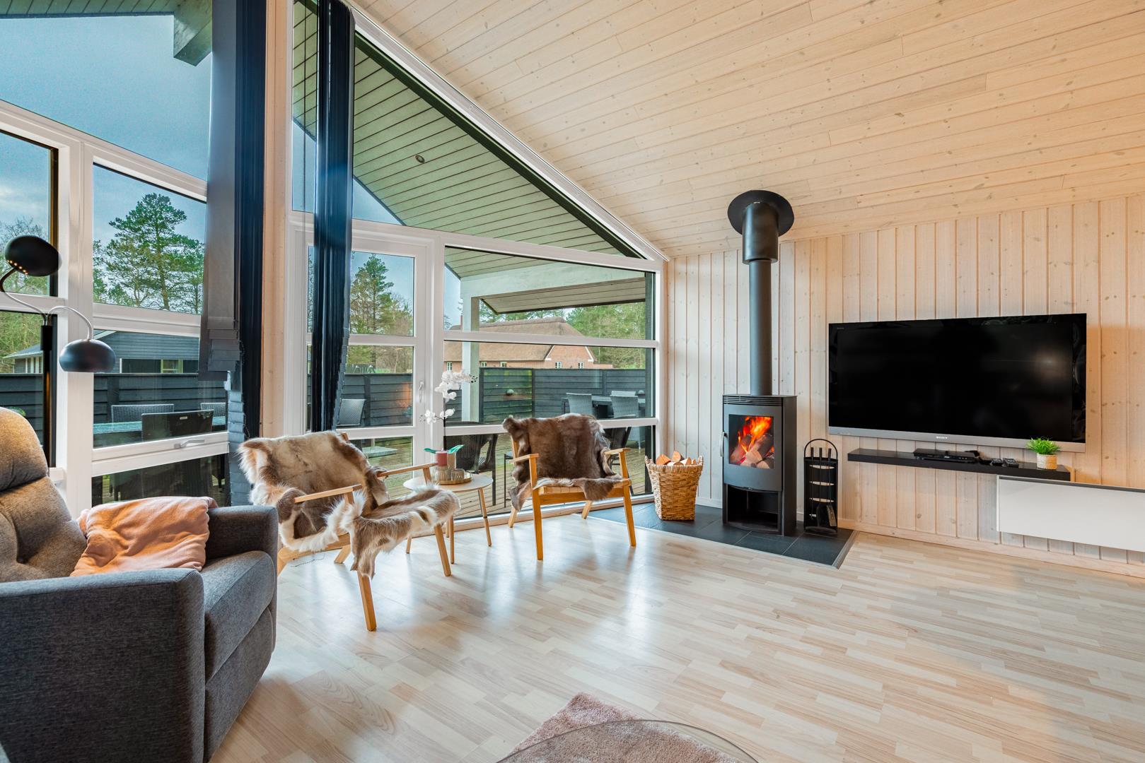 I enden af huset findes endnu en hems med madras med plads til 1 person. 2 badeværelser, det ene med spa og sauna, men begge med gulvvarme. Åbent køkken med separat fryser på ca. 50 liter, mikroovn og opvaskemaskine. Stue med tv og brændeovn i forbindelse med spiseplads. Huset er lyst og venligt og her er højt til loftet med gode lysindfald fra store vinduespartier. Fra stuen er der adgang til stor sydvendt terrasse, hvoraf en del er overdækket. Carport samt skur til rådighed.