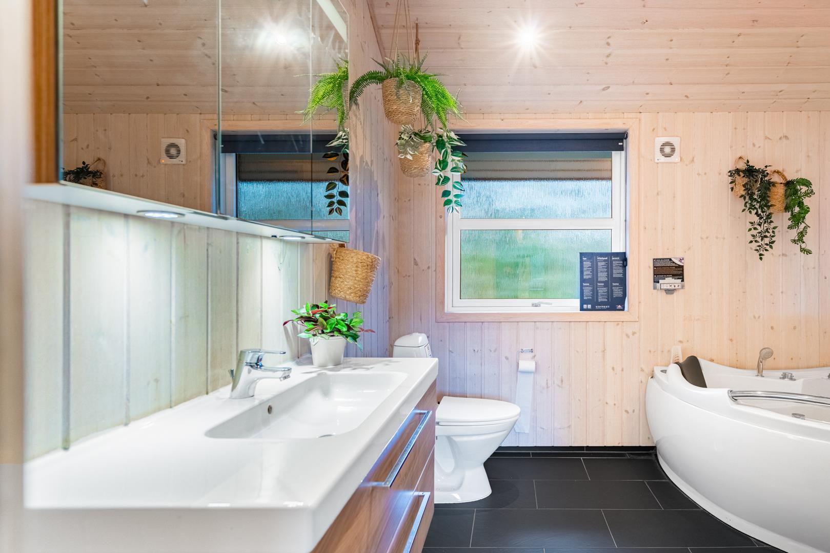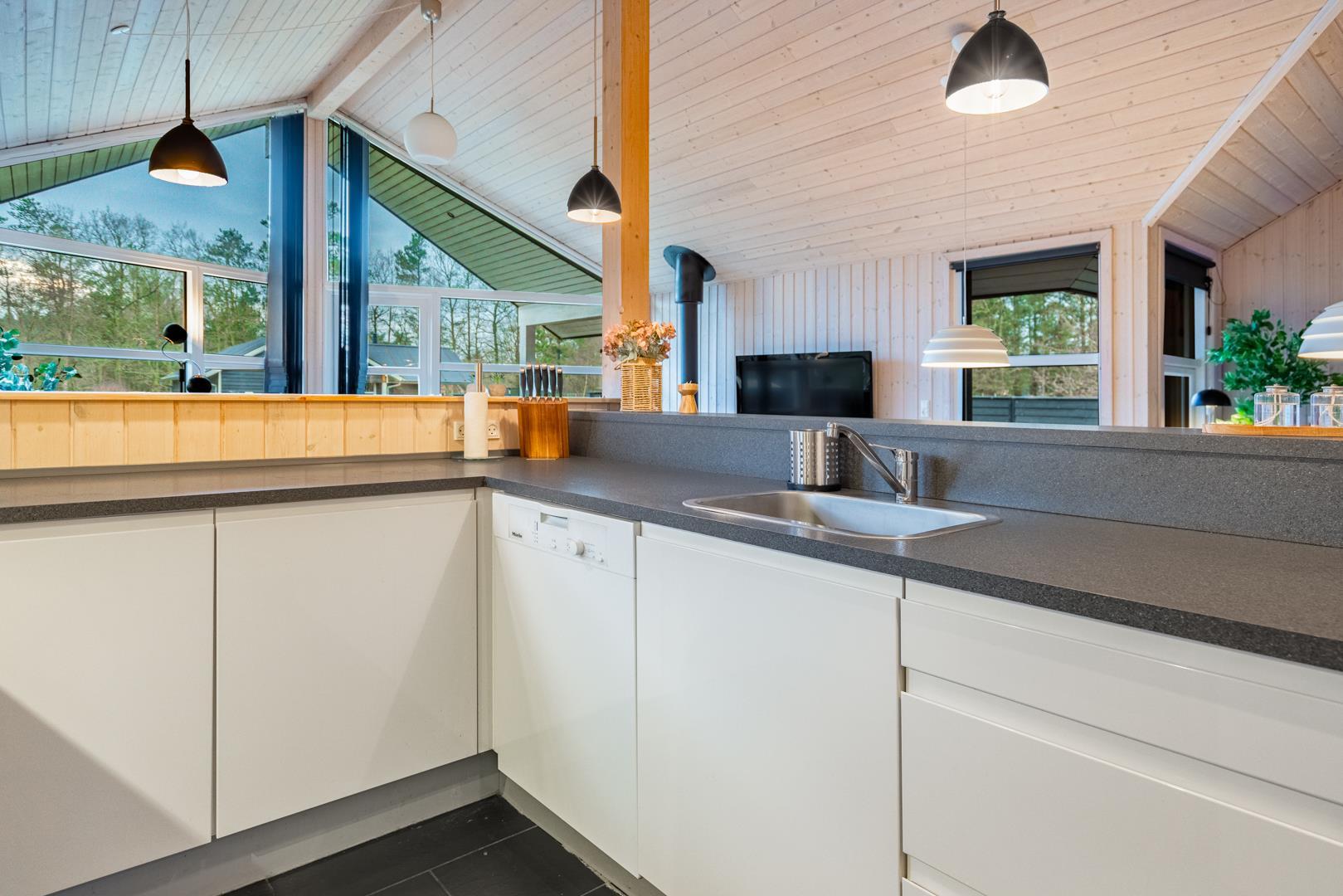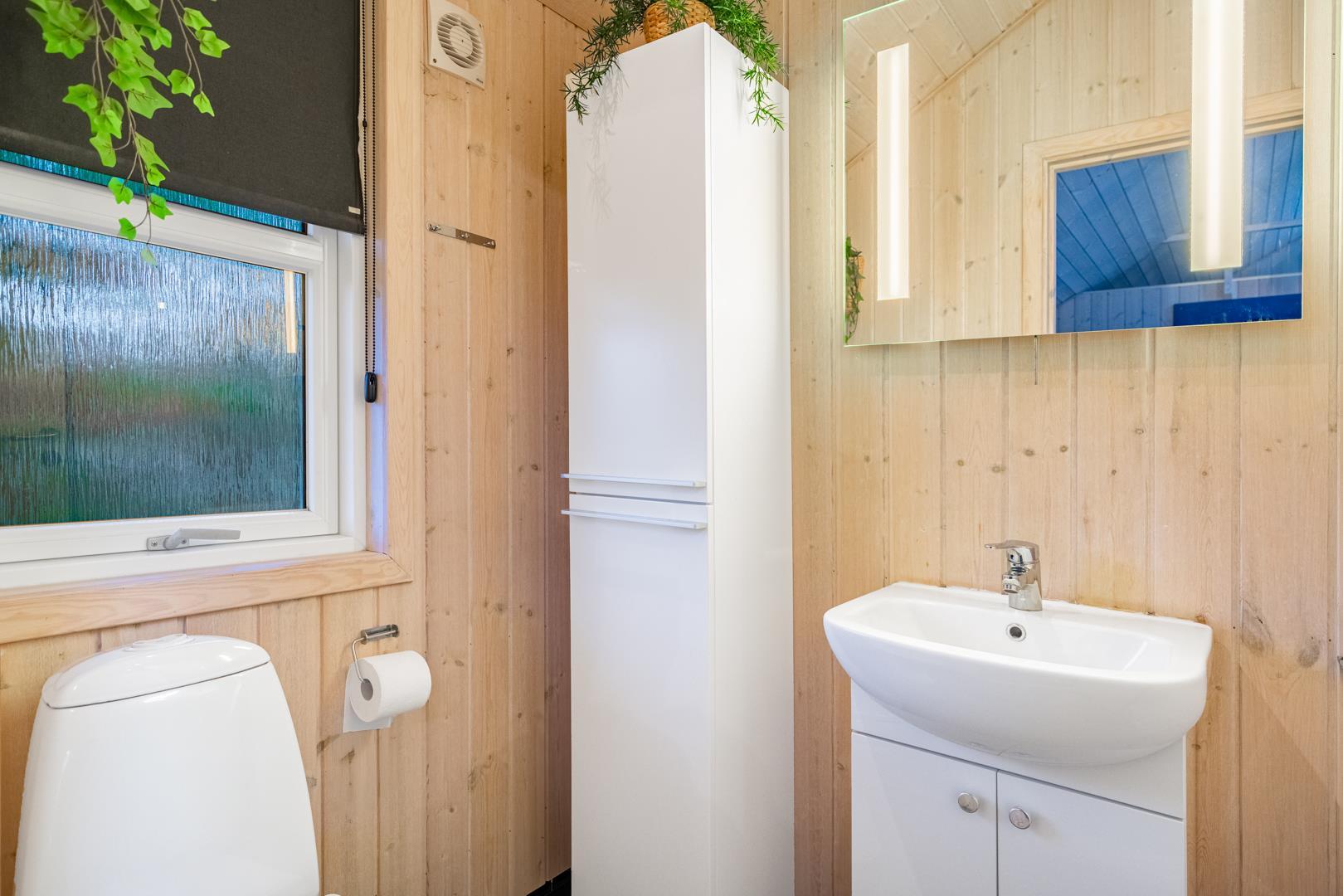 I enden af huset findes endnu en hems med madras med plads til 1 person. 2 badeværelser, det ene med spa og sauna, men begge med gulvvarme. Åbent køkken med separat fryser på ca. 50 liter, mikroovn og opvaskemaskine. Stue med tv og brændeovn i forbindelse med spiseplads. Huset er lyst og venligt og her er højt til loftet med gode lysindfald fra store vinduespartier. Fra stuen er der adgang til stor sydvendt terrasse, hvoraf en del er overdækket. Carport samt skur til rådighed.