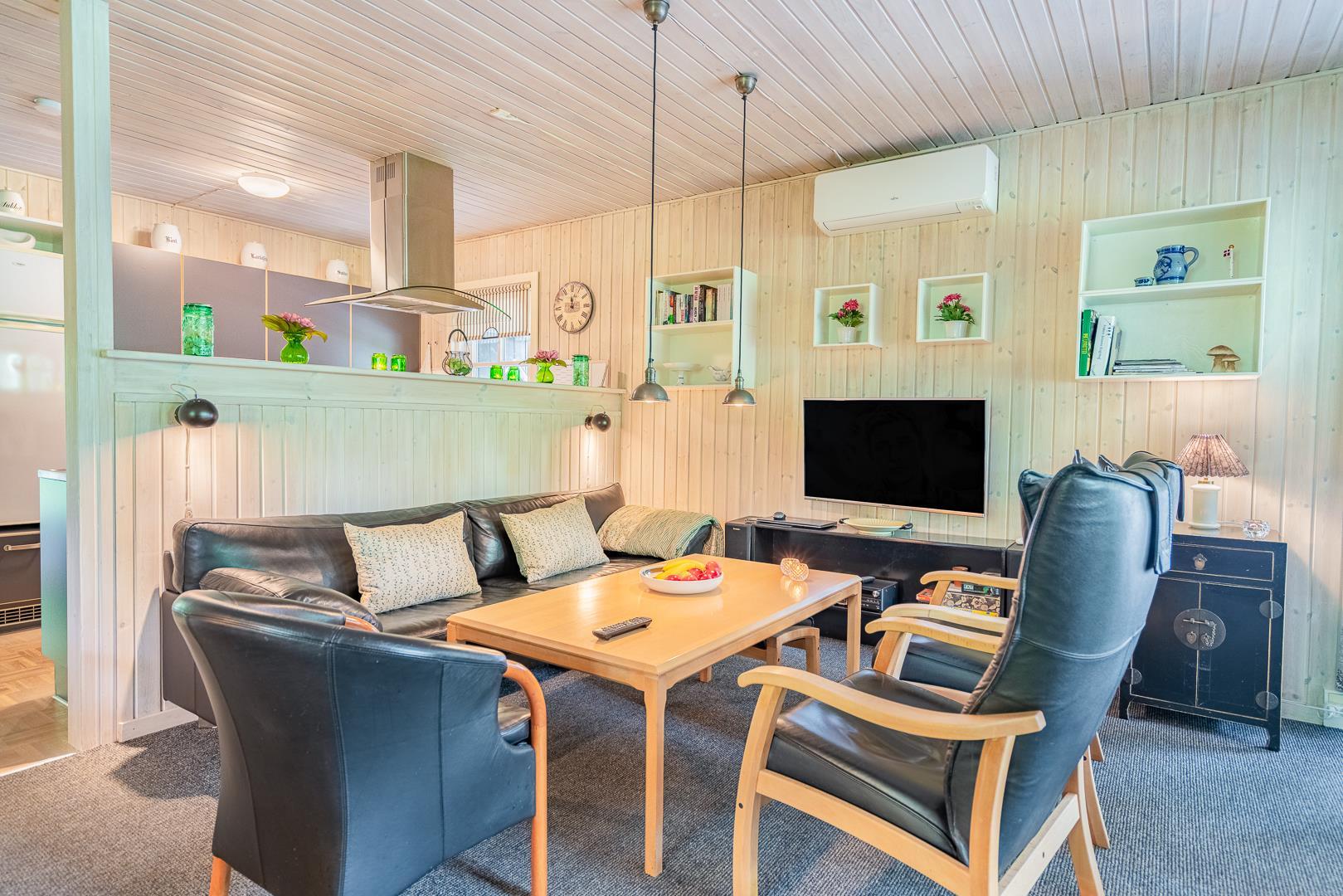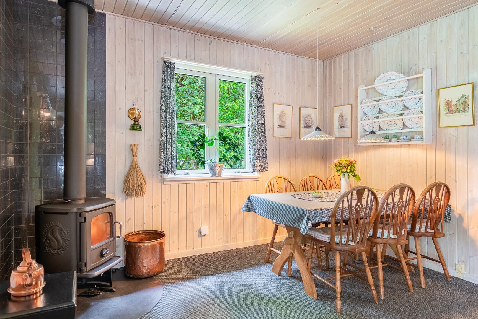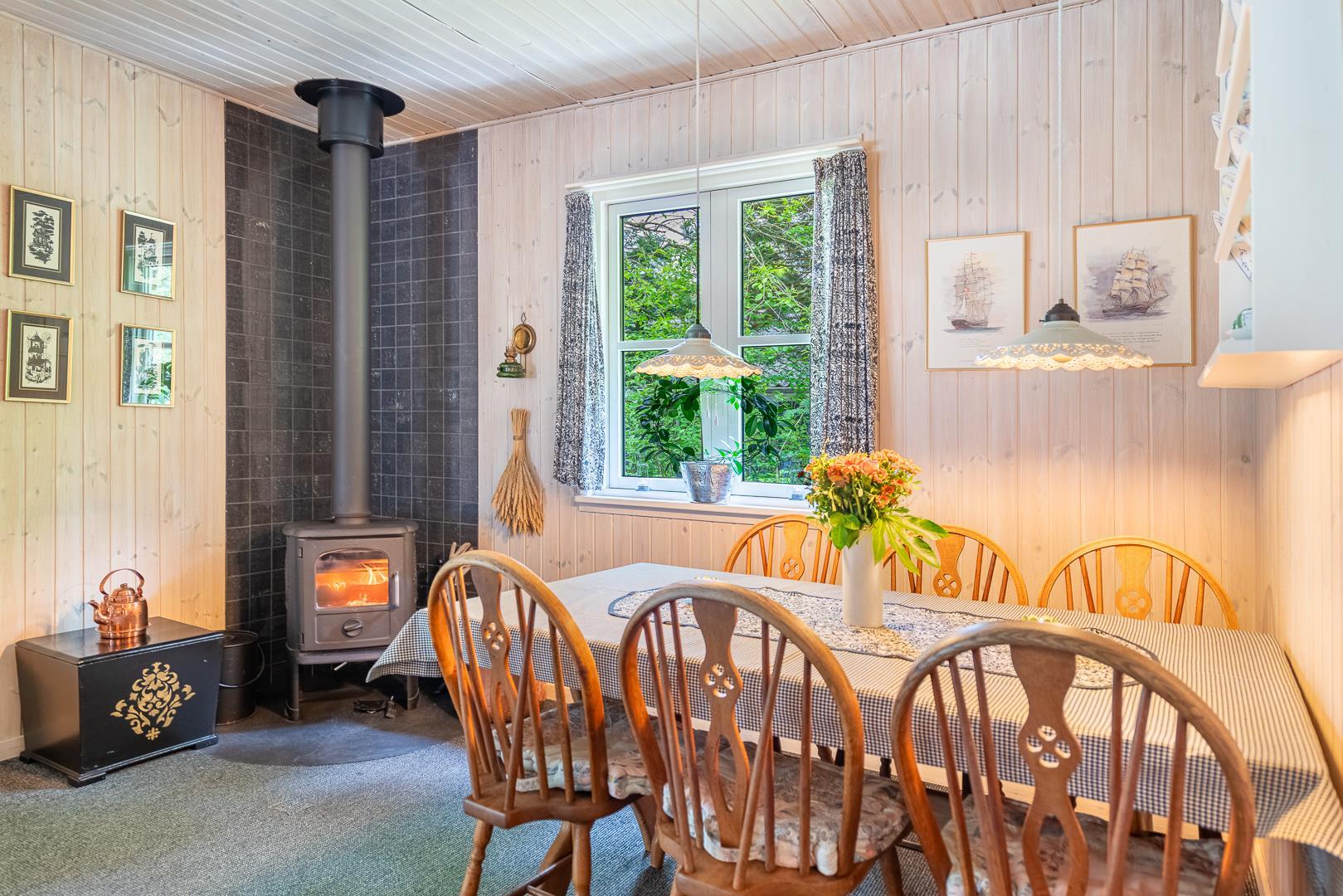 Hyggelig stue med brændeovn og varmepumpe, samt komfortable møbler. Stuen er kombineret med spiseplads og veludstyret køkken med opvaskemaskine.