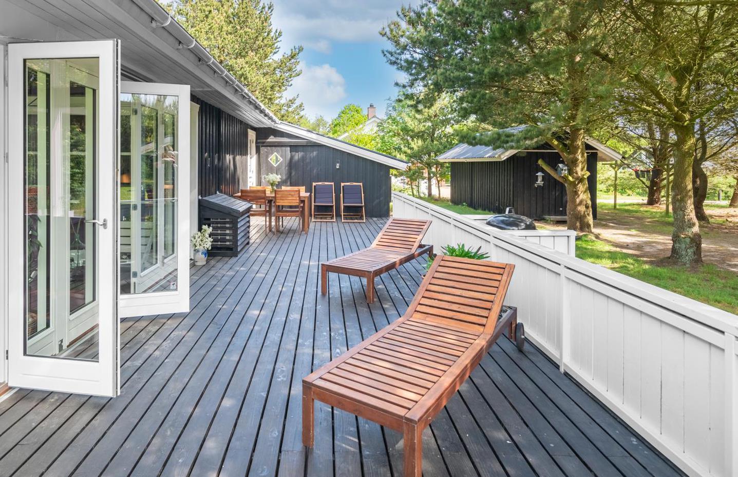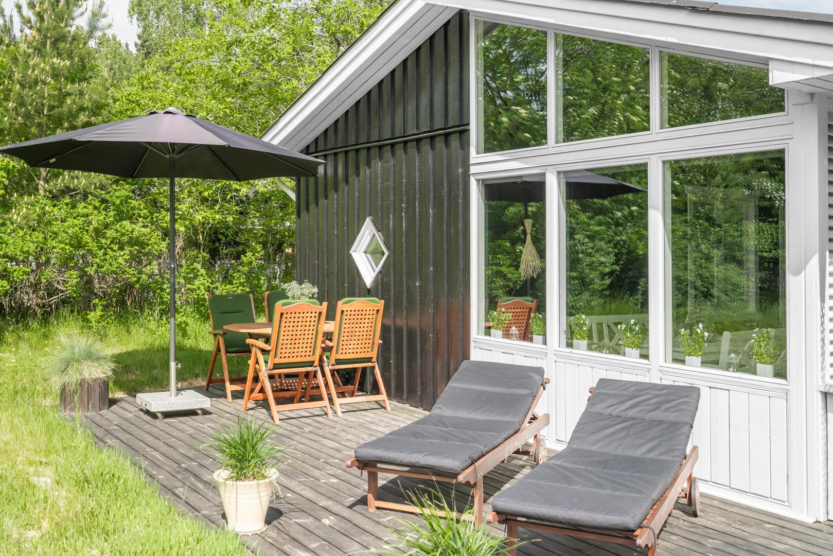 Lækker syd- og østvendt træbelagt terrasse på i alt 70 m2. Der er gode havemøbler og solparasol.