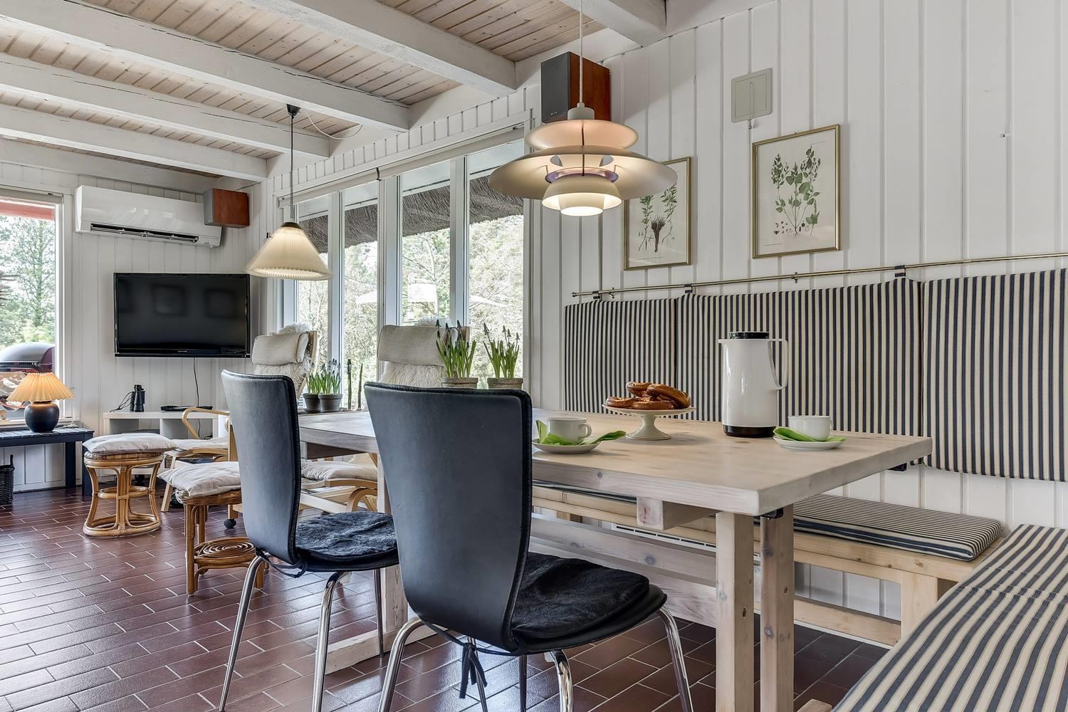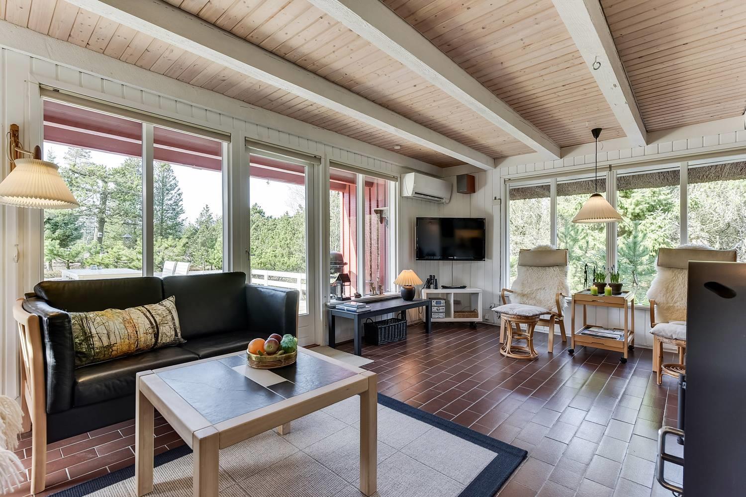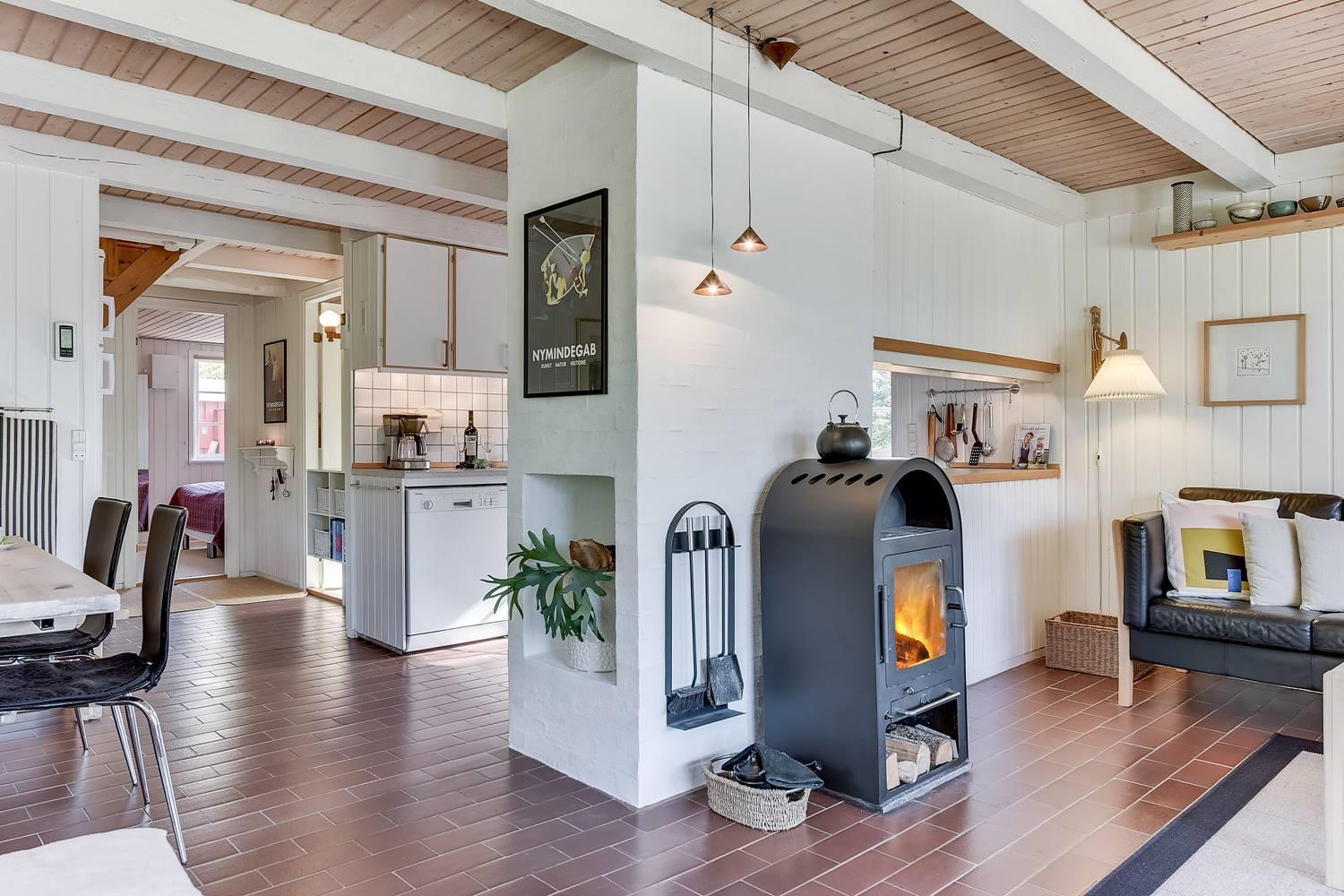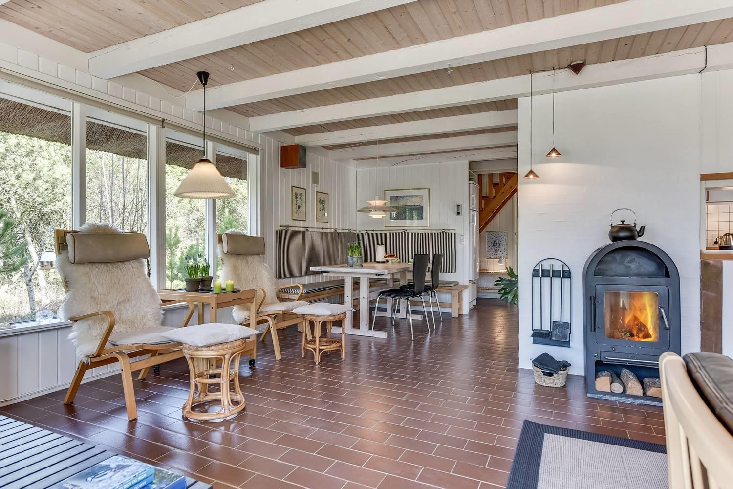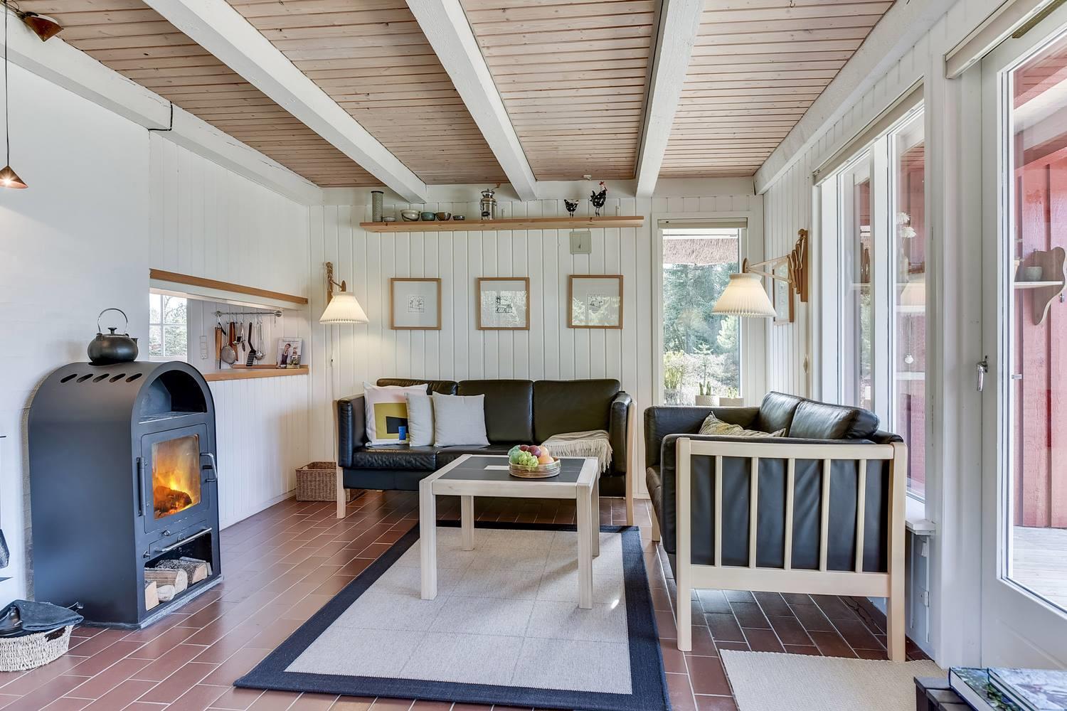 Den indbydende opholdsstue er sommerhusets hjerte. Her sørger brændeovnen for behagelig varme og ægte hygge på kølige dage, mens varmepumpen sikrer et behageligt indeklima året rundt.