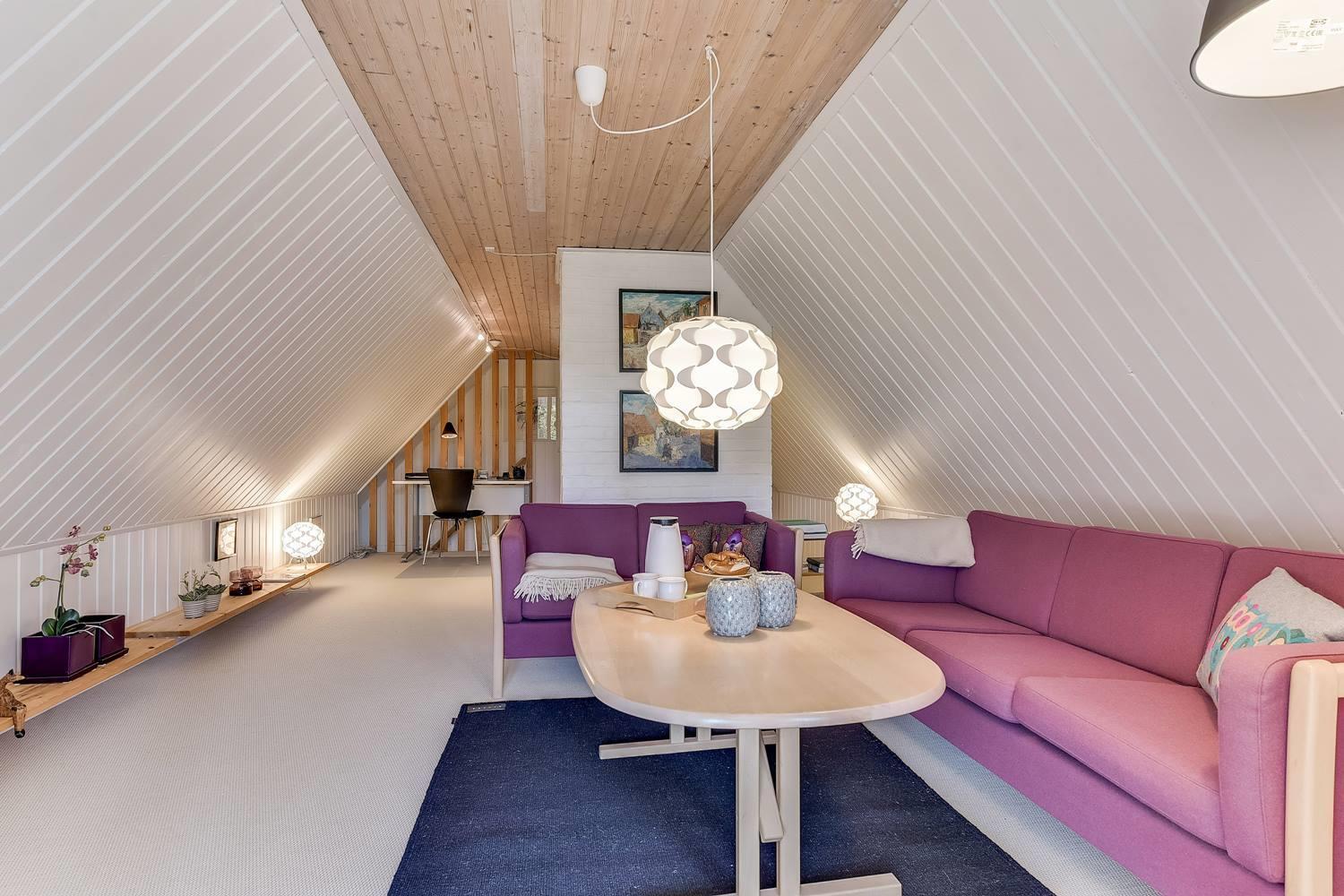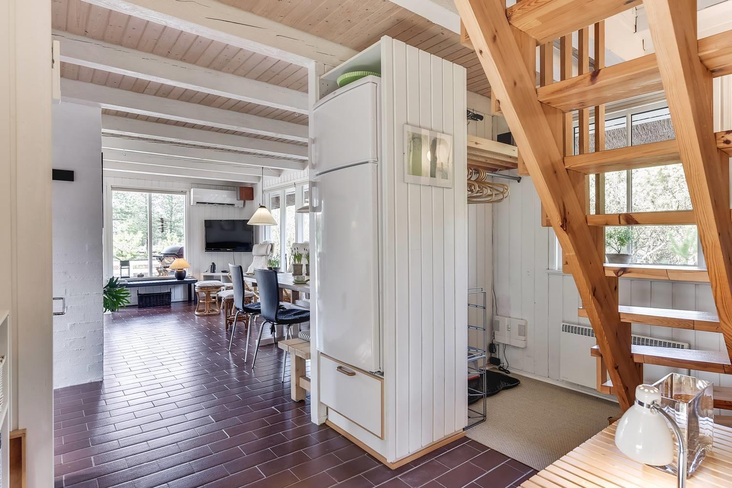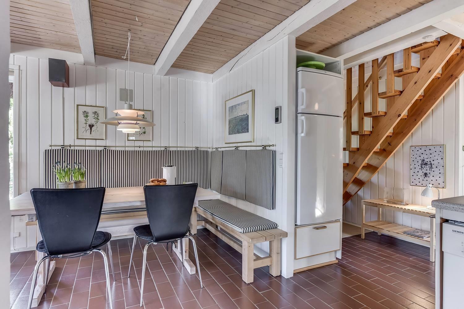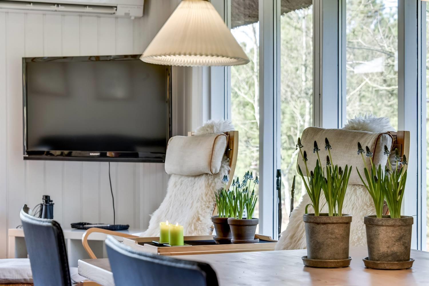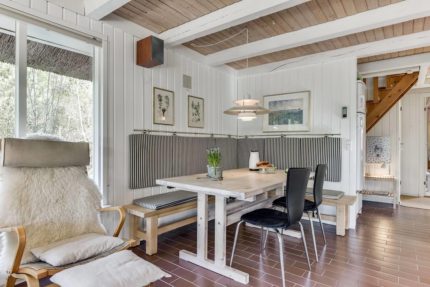 Den indbydende opholdsstue er sommerhusets hjerte. Her sørger brændeovnen for behagelig varme og ægte hygge på kølige dage, mens varmepumpen sikrer et behageligt indeklima året rundt.